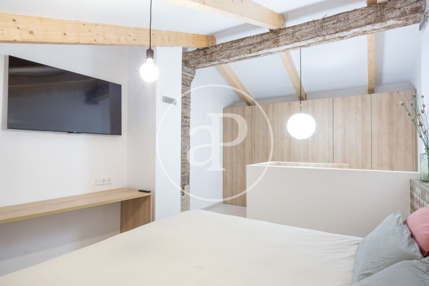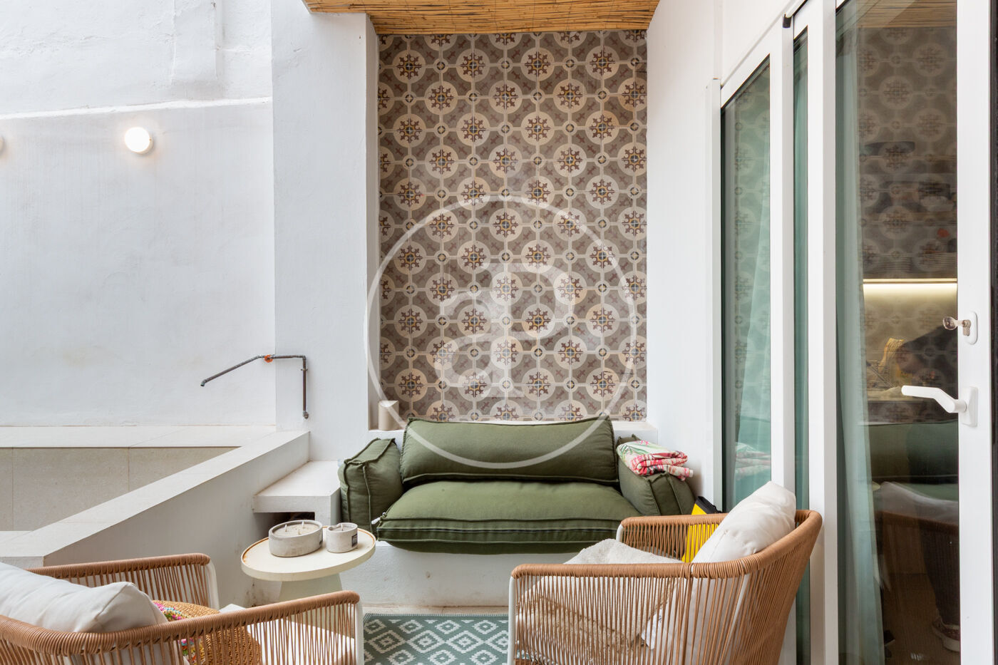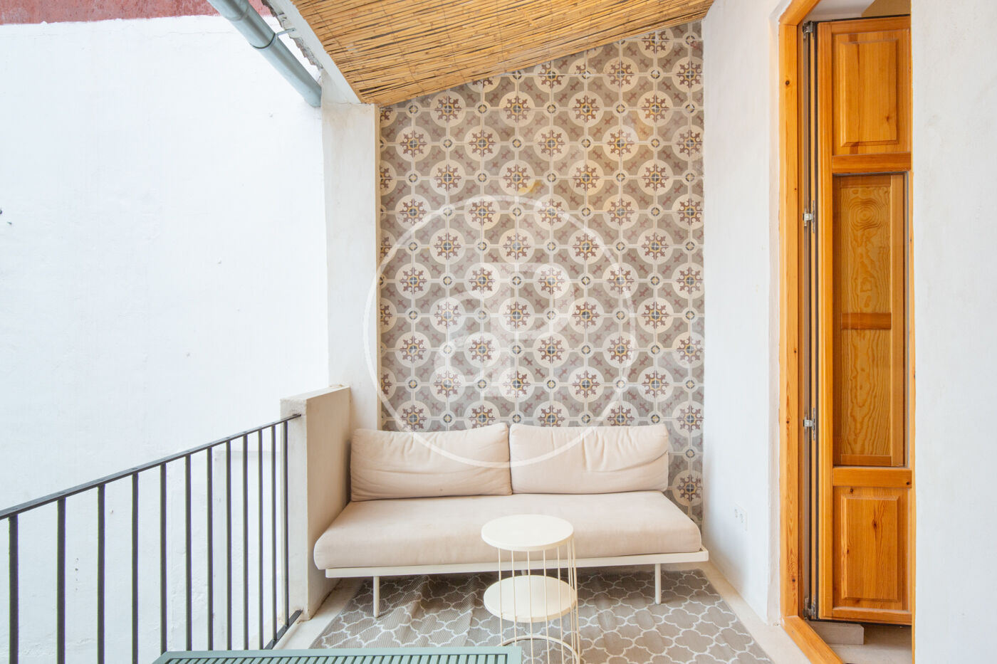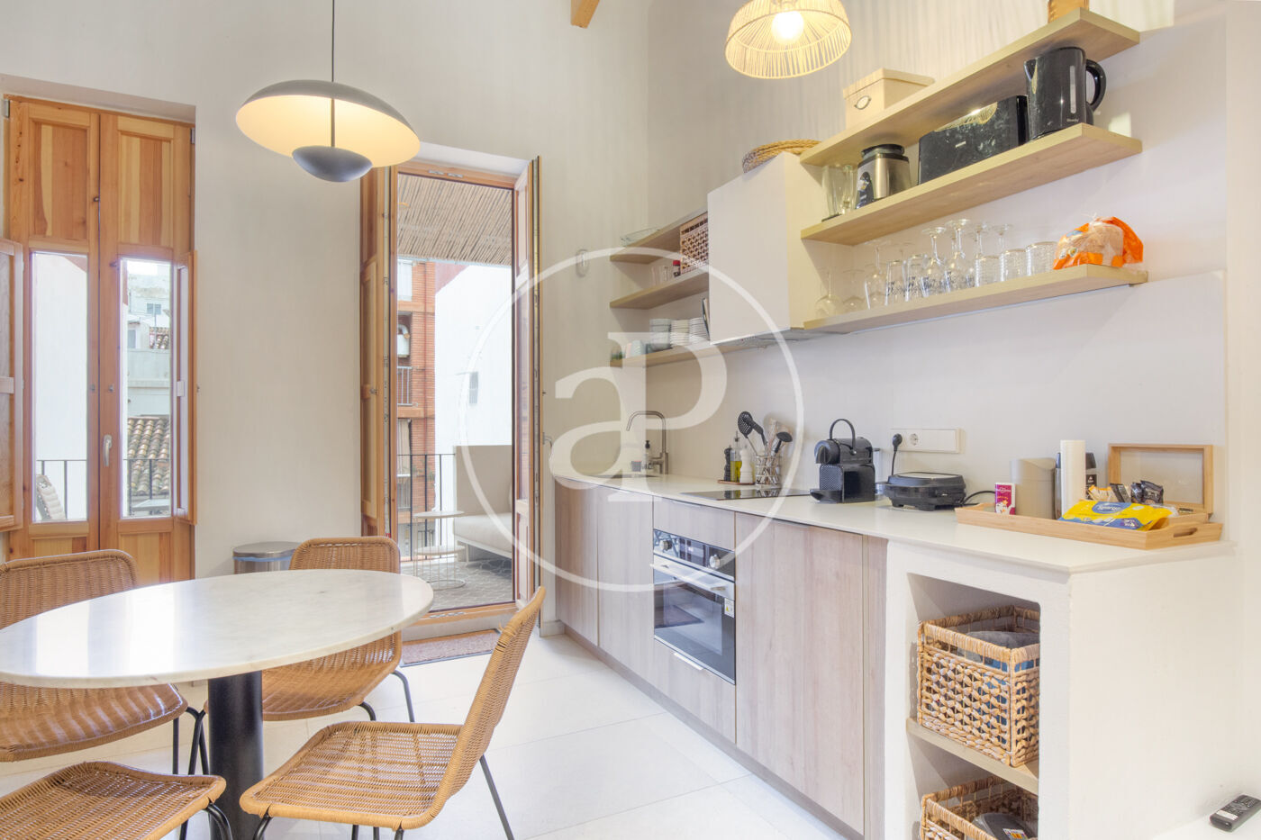 The second apartment, accessed from a parallel street—one of the most representative and lively in Cabanyal—is reached via the traditional staircases characteristic of this historic seaside neighborhood. The property is distributed over two levels. On the main floor, there is a spacious living-dining area with integrated kitchen opening onto a generous terrace, as well as a double bedroom with office area and a full bathroom. Original stairs lead to the upper attic level, where a second large double bedroom is located, offering multiple possible uses and featuring an elegant full wall of built-in wardrobes.
