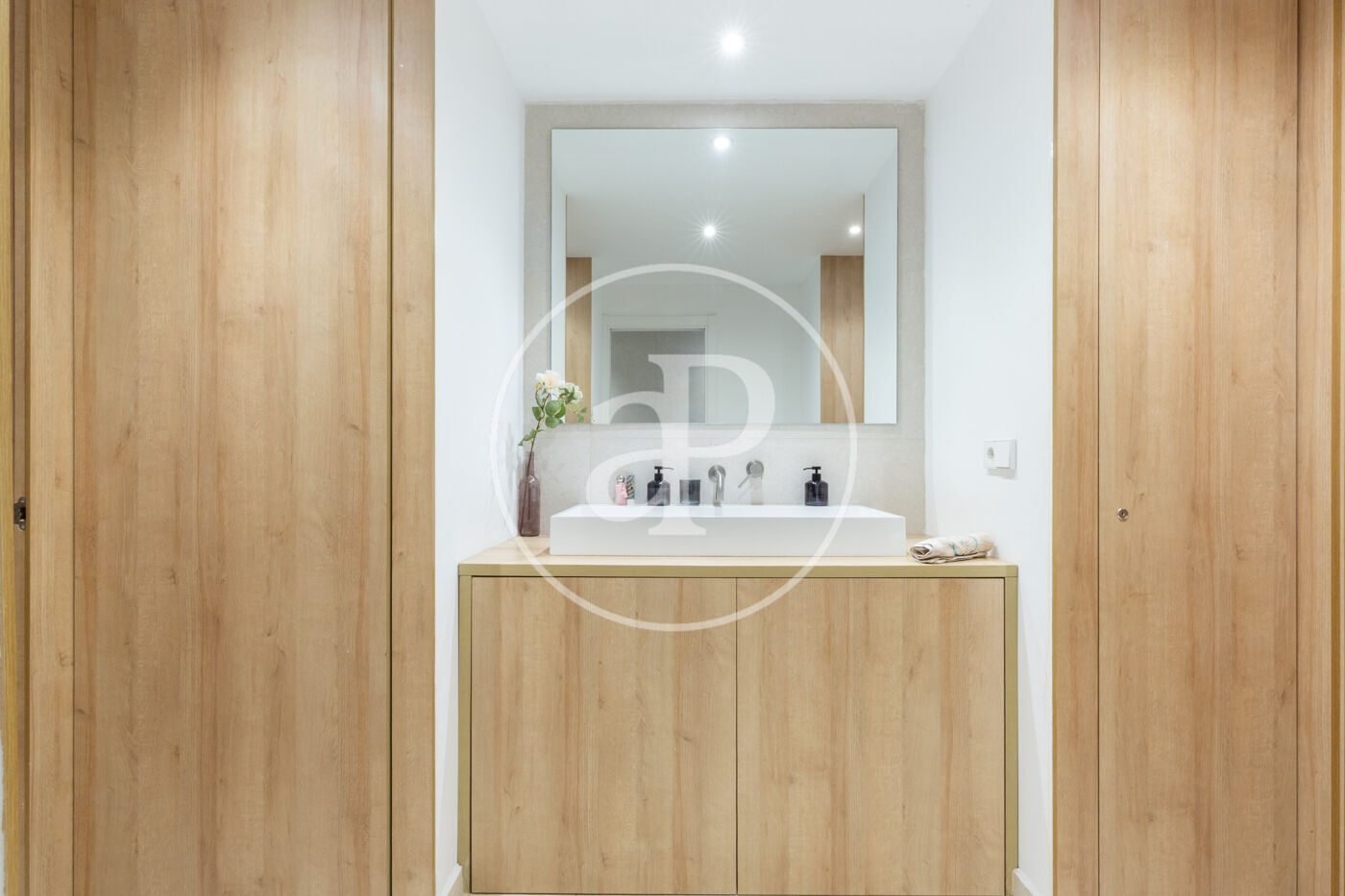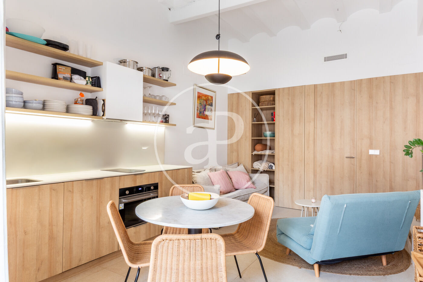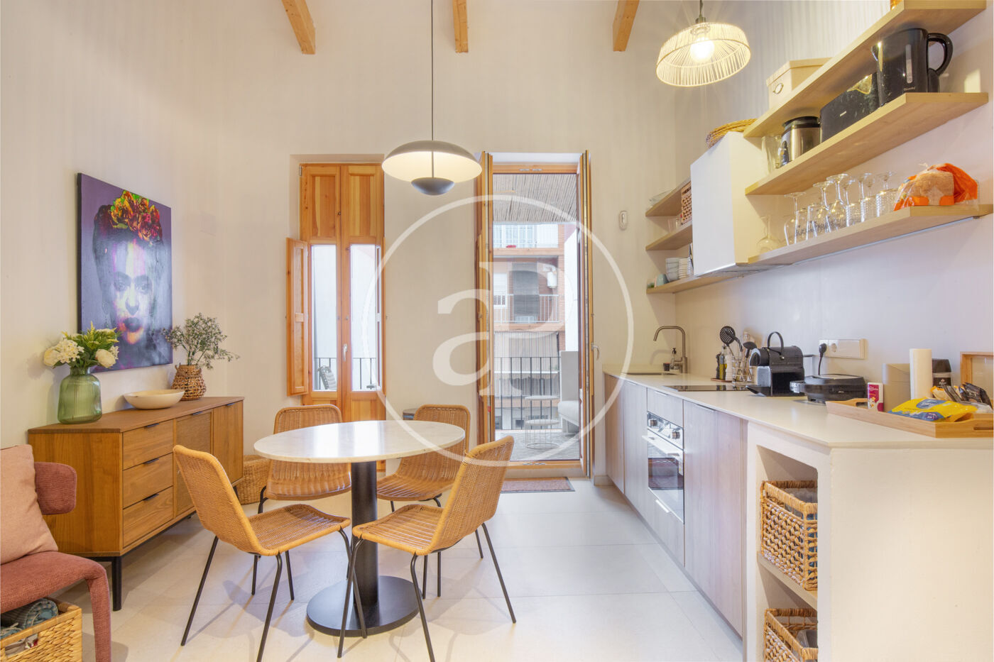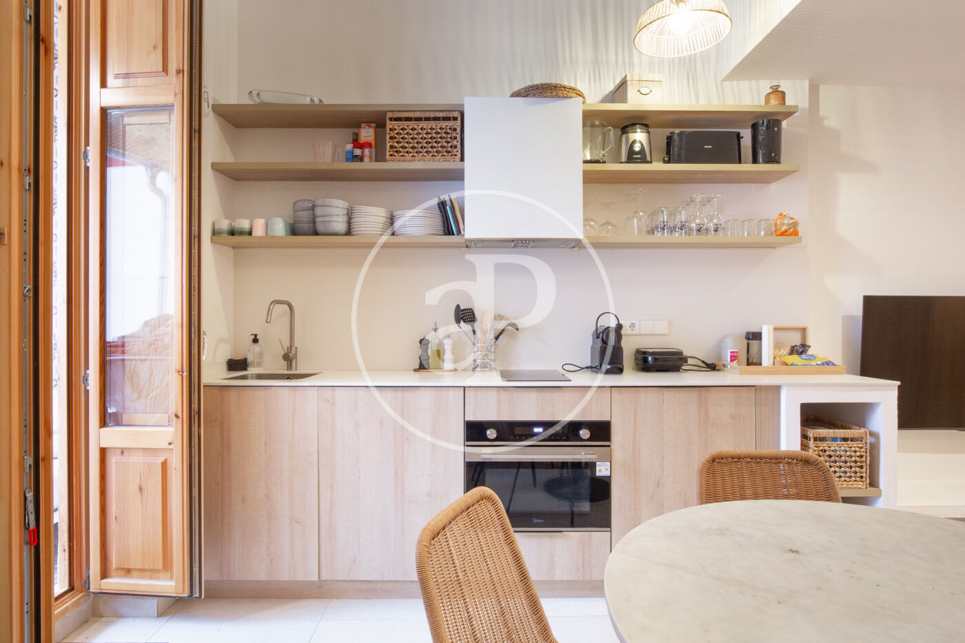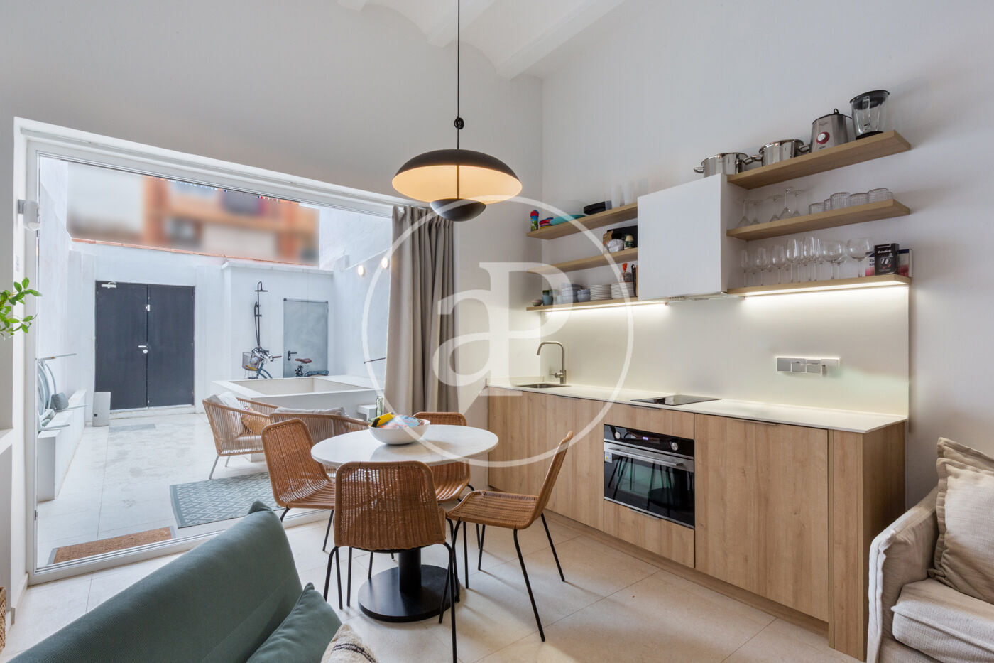 The second apartment, accessed from a parallel street—one of the most representative and lively in Cabanyal—is reached via the traditional staircases characteristic of this historic seaside neighborhood. The property is distributed over two levels. On the main floor, there is a spacious living-dining area with integrated kitchen opening onto a generous terrace, as well as a double bedroom with office area and a full bathroom. Original stairs lead to the upper attic level, where a second large double bedroom is located, offering multiple possible uses and featuring an elegant full wall of built-in wardrobes.