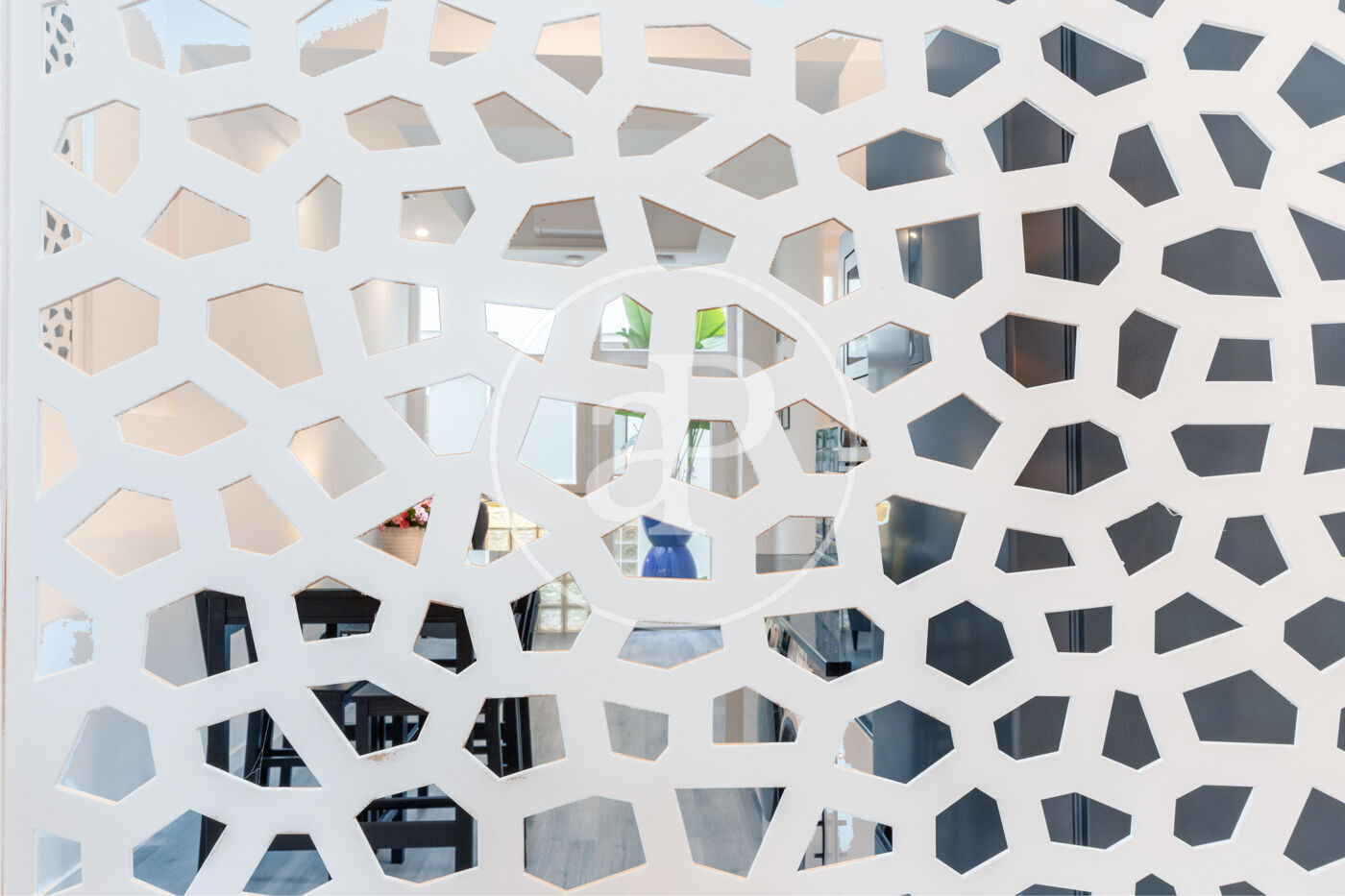 aProperties presents this exclusive 135 sqm residence, located in one of the most sought-after areas of Ruzafa. Designed and built by one of Spain’s most renowned architects, this property combines contemporary design, noble materials, and an exceptional level of comfort, creating an elegant, serene, and timeless home. The property is located on the fifth and top floor of the building, with elevator access, ensuring privacy, tranquility, and excellent natural light throughout the day. Upon entering the home, you are welcomed by a spacious open-plan area that integrates the living room and kitchen, conceived as the heart of the home. The living area stands out for its generous proportions, brightness, and carefully curated minimalist aesthetic. The fully integrated kitchen features all appliances concealed behind custom-made cabinetry, achieving a clean, sophisticated, and highly functional environment. The property offers two double bedrooms, both designed to provide maximum comfort and silence thanks to outstanding acoustic insulation in both walls and windows—an uncommon feature in the city center. The private area is completed by two spacious bathrooms, a separate home office, ideal for remote work, a walk-in wardrobe, and a practical laundry room. In addition, the property boasts excellent storage capacity, intelligently distributed throughout the home. Finishes are of the highest quality, including natural oak parquet flooring, bespoke oak carpentry and furniture, high ceilings, and warm, fully smart-controlled lighting, manageable via mobile phone. Year-round comfort is ensured by the underfloor heating system and air conditioning. Located in the heart of Ruzafa, surrounded by restaurants, shops, galleries, and a vibrant cultural scene, this property also offers absolute peace and quiet, making it a true urban retreat. There is the option to rent a spacious parking space in the same building for €110 per month (optional). If you would like more information or to arrange a viewing, please do not hesitate to contact us. We will be delighted to assist you and guide you every step of the way.