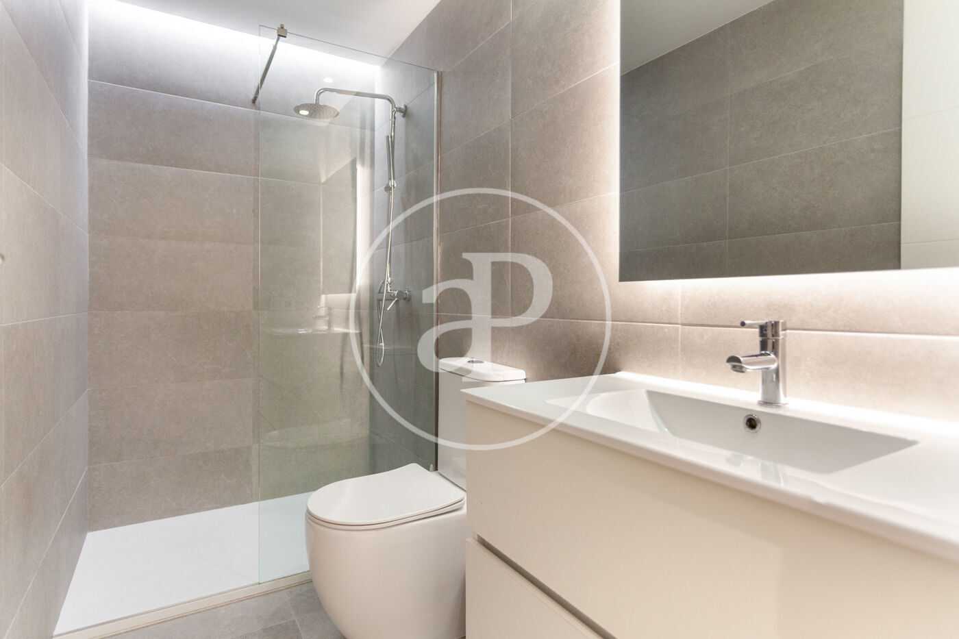 The bathroom is spacious and brand new, as is the rest of the apartment.