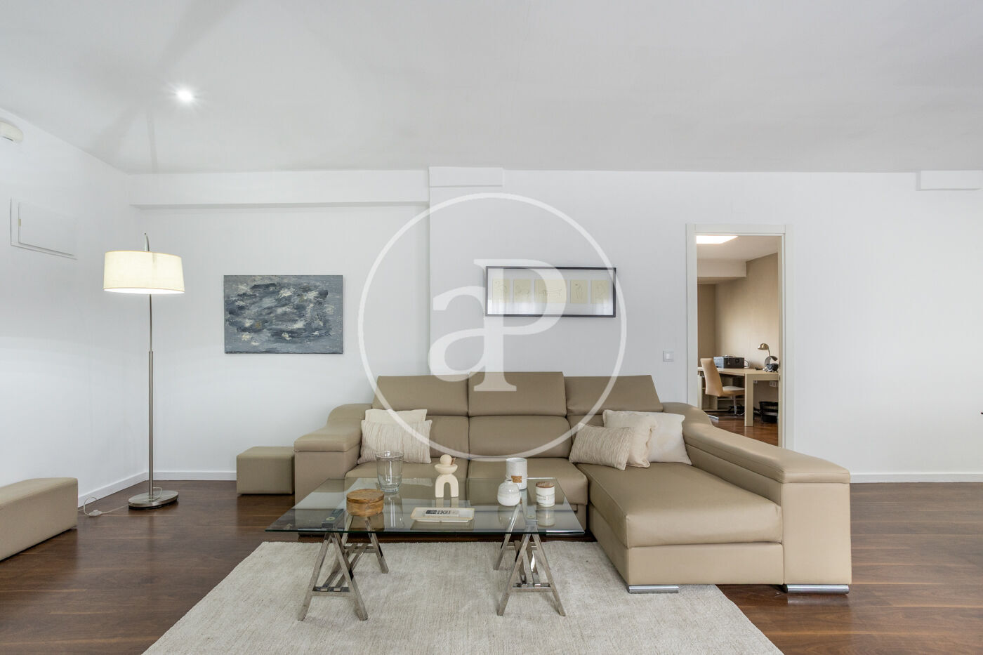 The property features two bedrooms with double beds and a third room set up as a spacious home office, ideal for remote work. It has two full bathrooms with showers. The apartment is equipped with air conditioning in the living room and the master bedroom.