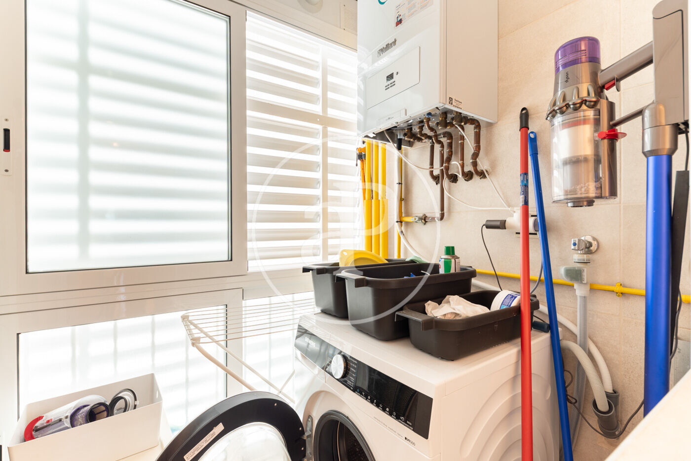 The kitchen is independent and equipped with high-end appliances, complemented by a practical separate laundry area.