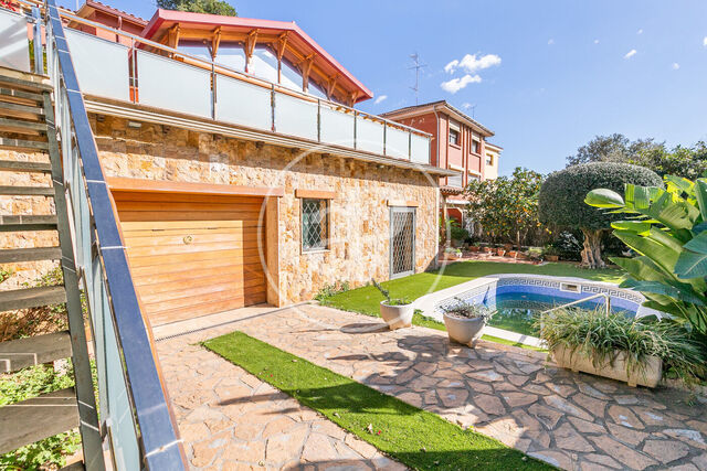 En la planta de acceso la casa cuenta con un salón-comedor orientado hacia el sur y abuhardillado con grandes vigas de hierro recubiertas con madera que le otorgan personalidad y que dejan pasar la luz y dan mucha amplitud. Tenemos acceso a una amplísima terraza, en la que se pueden hacer múltiples proyectos, en función de las necesidades, desde un solárium, que es como está actualmente, donde pueden comer muchos comensales, hasta una zona ajardinada o, si se desea realizar un estudio. En la planta superior encontramos tres habitaciones exteriores, dos de ellas en suite. La cocina, amplia y con mucha zona de almacenaje, es un punto de encuentro excelente, muy cómoda y con salida directa a donde está la barbacoa.