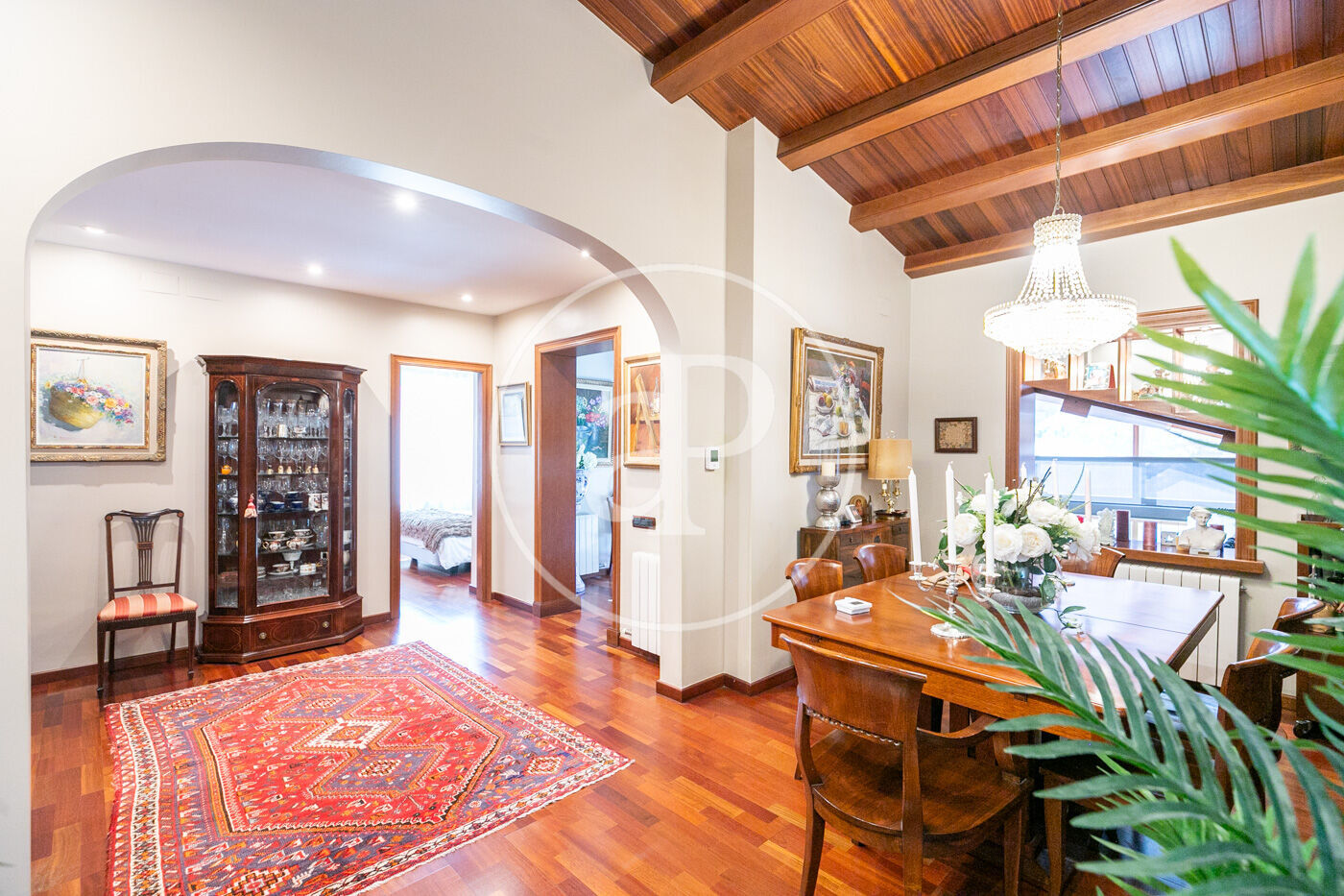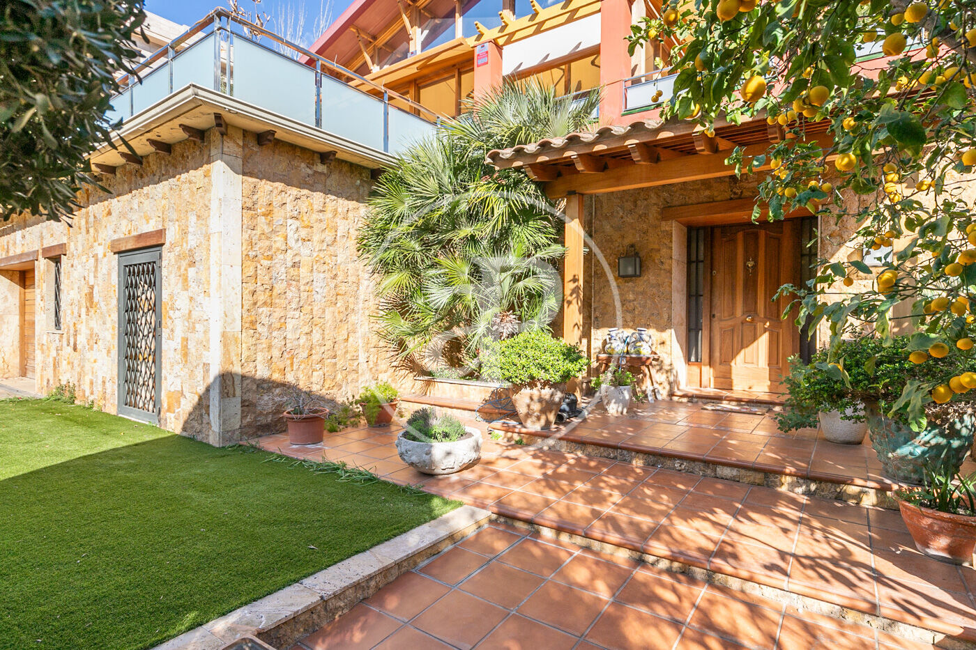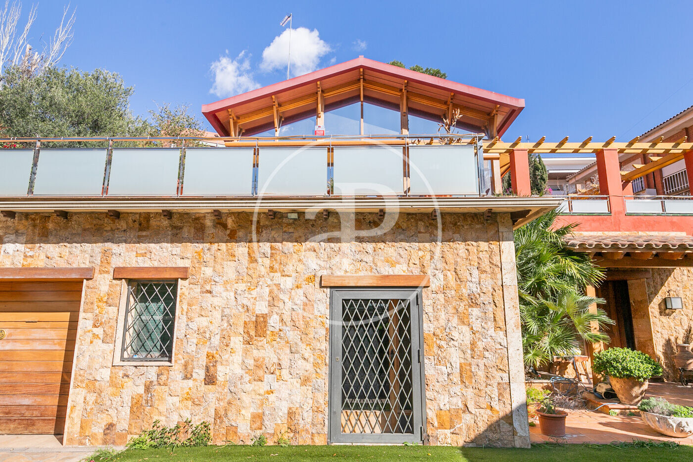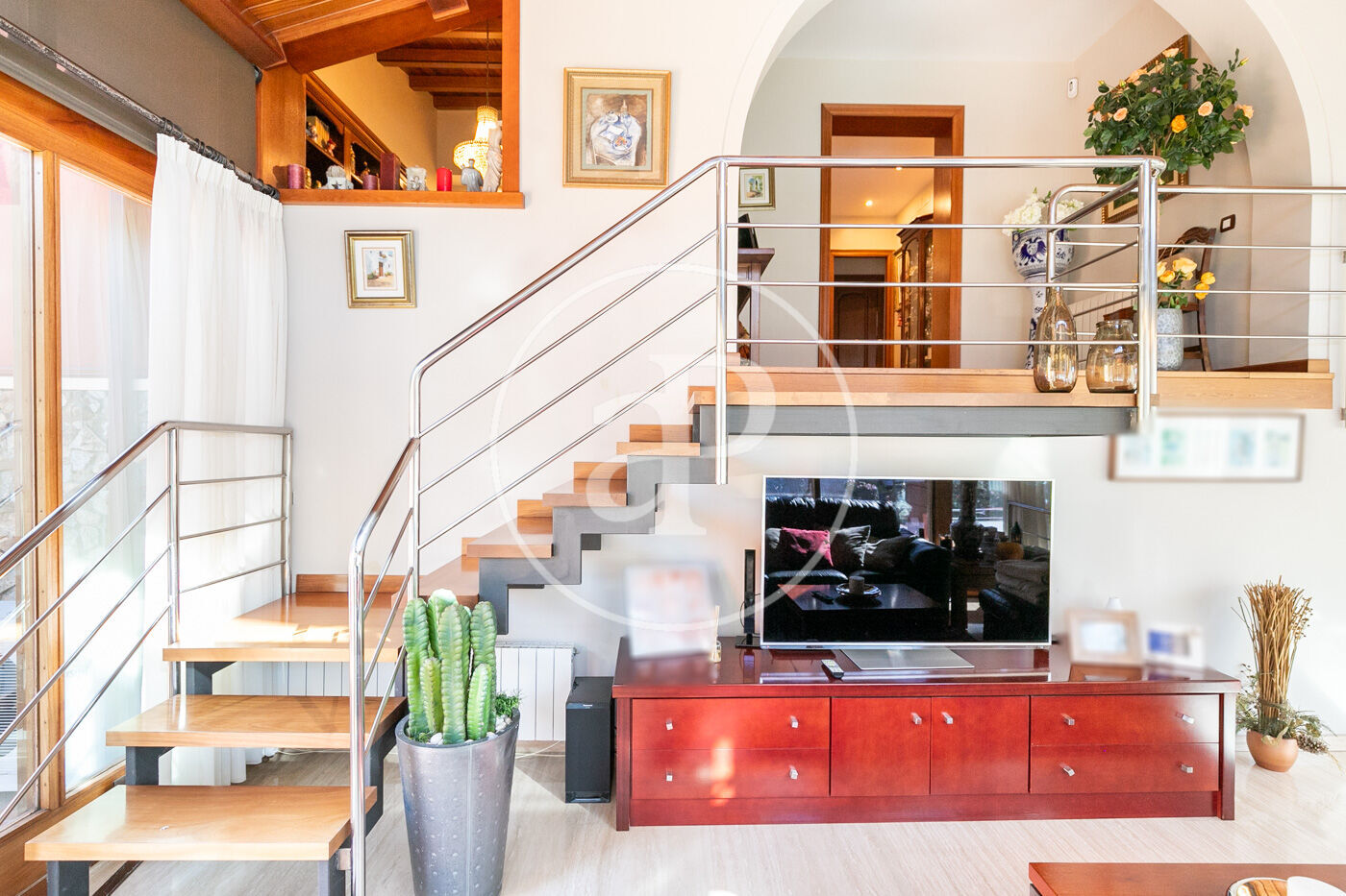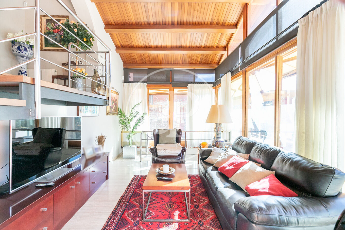 En la planta de acceso la casa cuenta con un salón-comedor orientado hacia el sur y abuhardillado con grandes vigas de hierro recubiertas con madera que le otorgan personalidad y que dejan pasar la luz y dan mucha amplitud. Tenemos acceso a una amplísima terraza, en la que se pueden hacer múltiples proyectos, en función de las necesidades, desde un solárium, que es como está actualmente, donde pueden comer muchos comensales, hasta una zona ajardinada o, si se desea realizar un estudio. En la planta superior encontramos tres habitaciones exteriores, dos de ellas en suite. La cocina, amplia y con mucha zona de almacenaje, es un punto de encuentro excelente, muy cómoda y con salida directa a donde está la barbacoa.