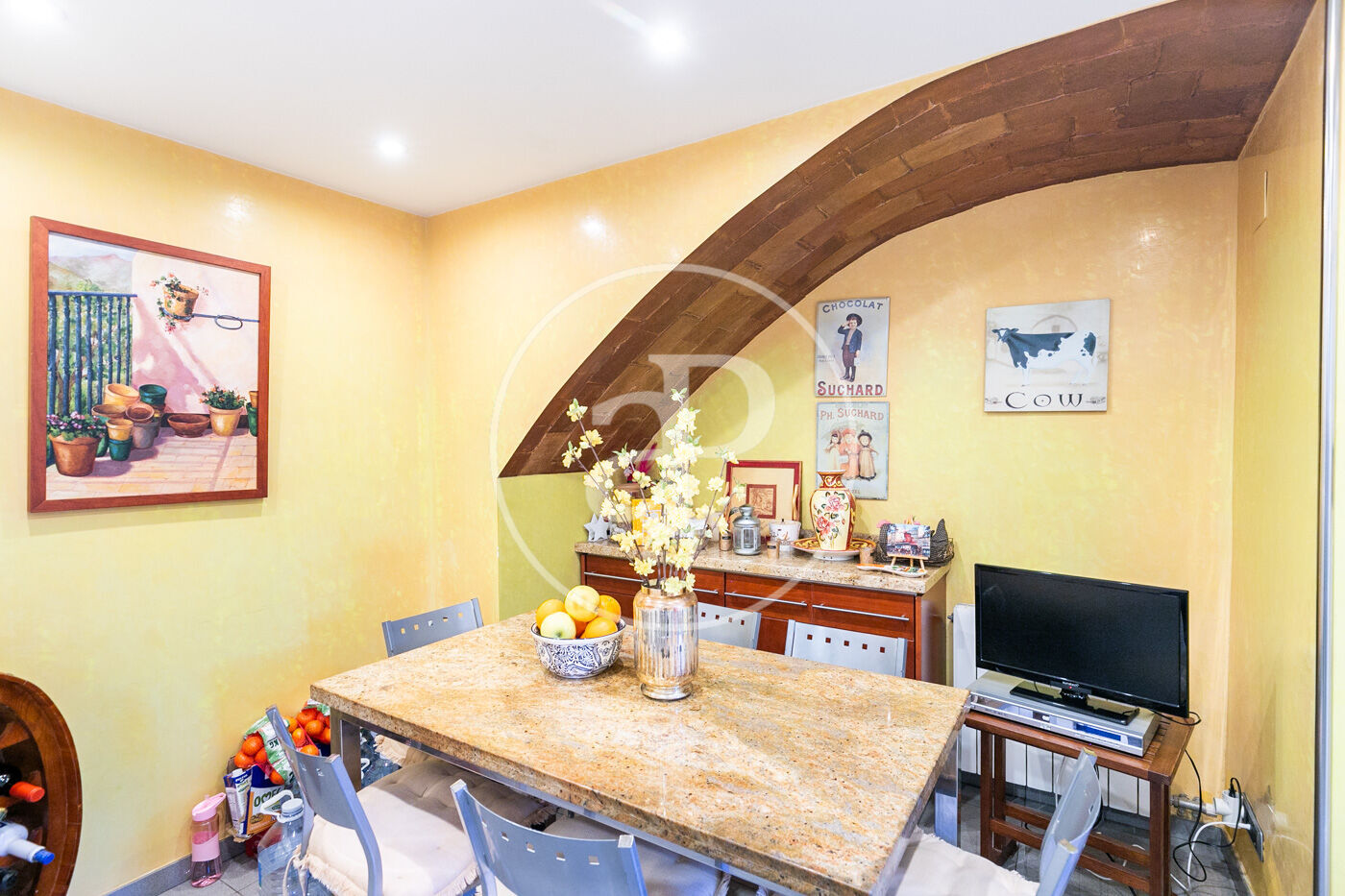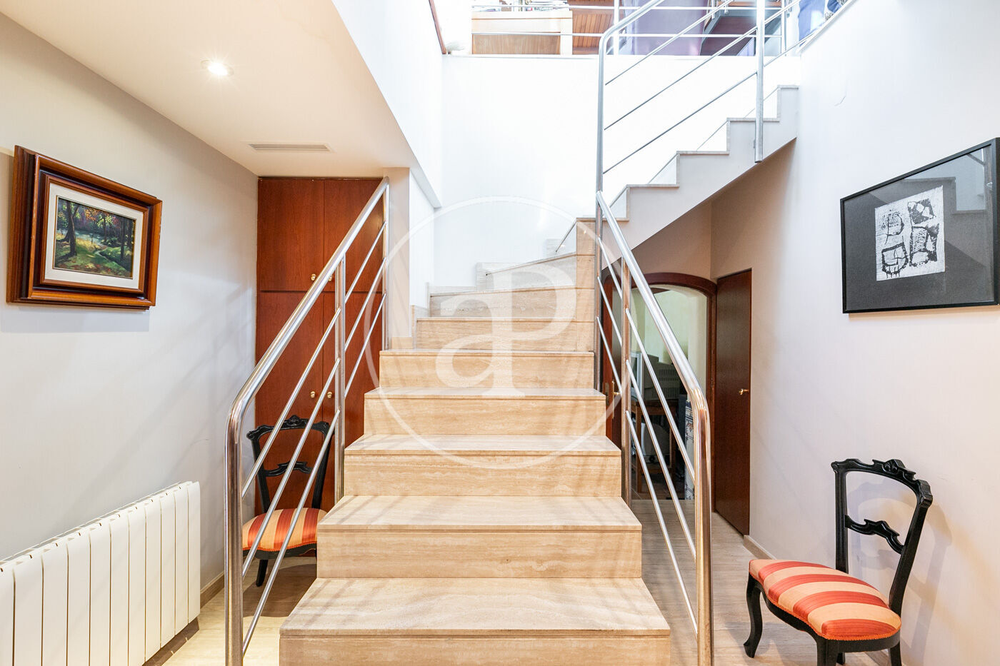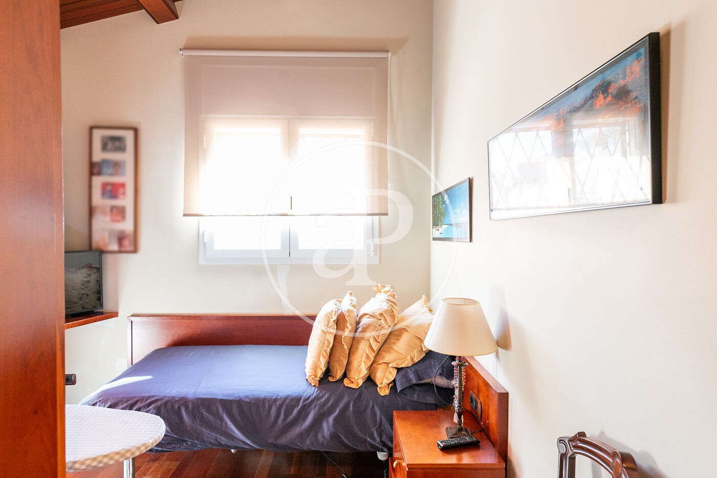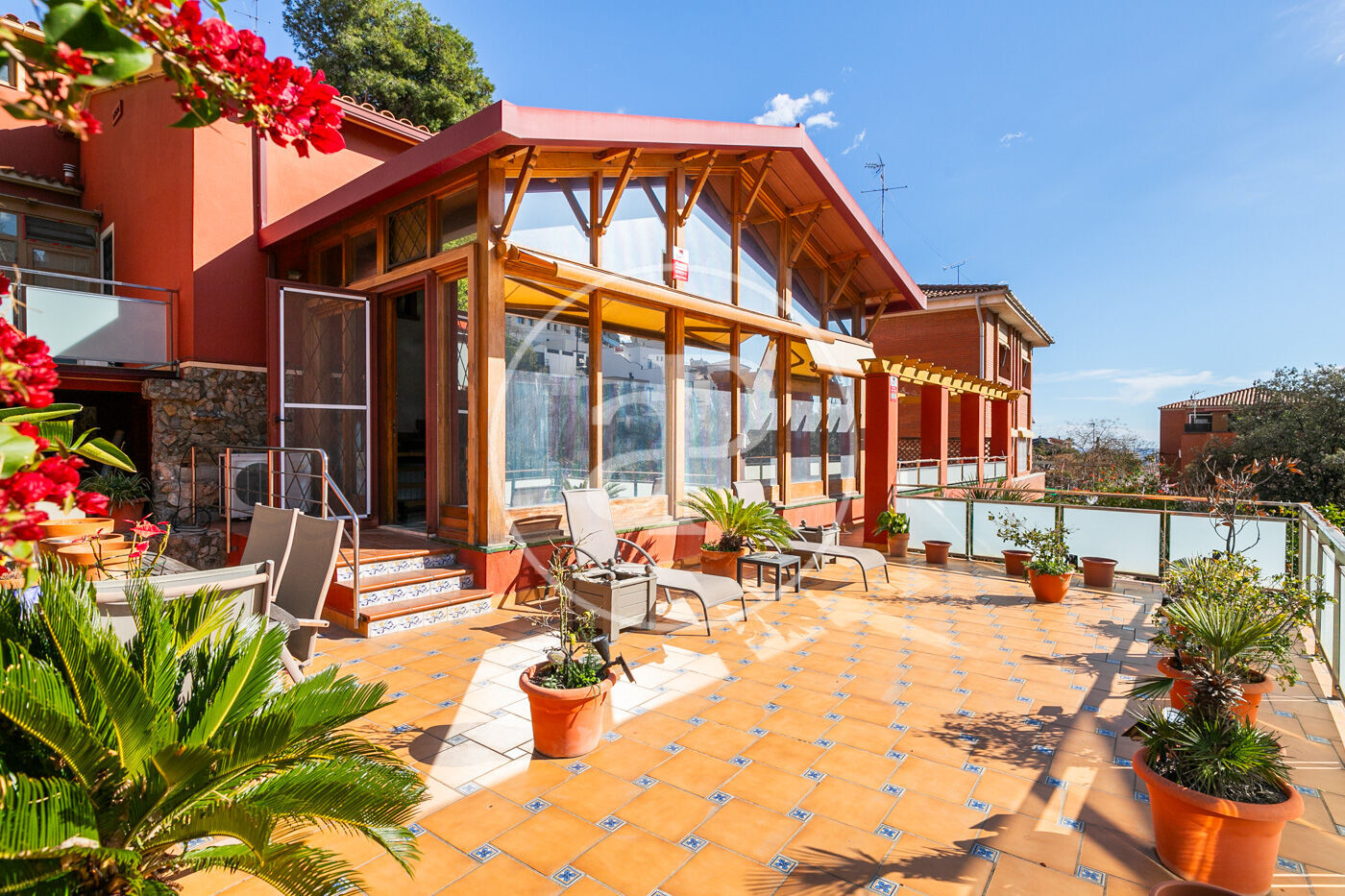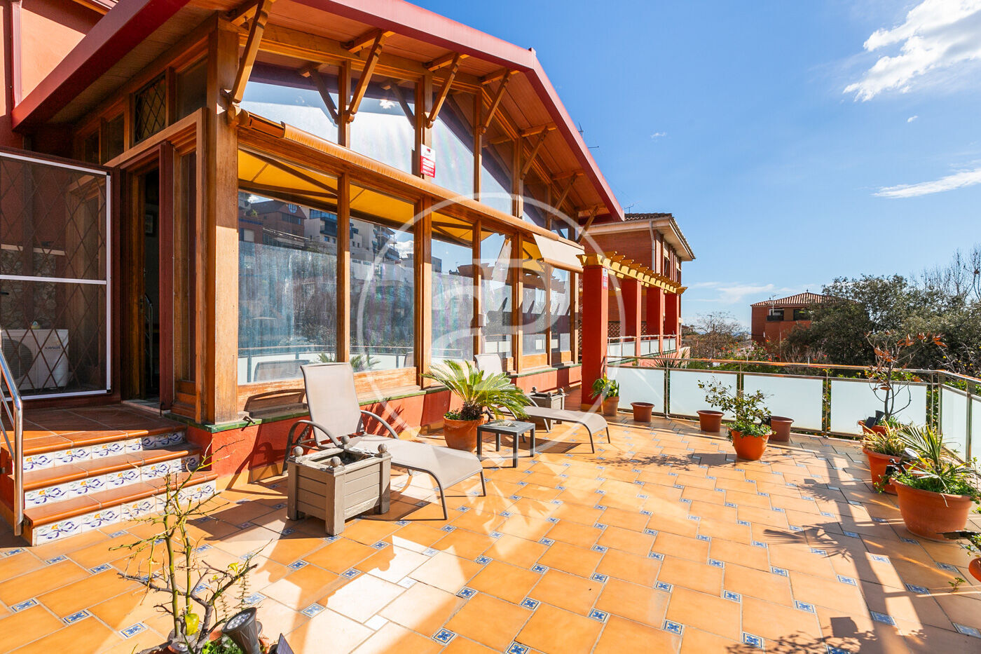 En la planta de acceso la casa cuenta con un salón-comedor orientado hacia el sur y abuhardillado con grandes vigas de hierro recubiertas con madera que le otorgan personalidad y que dejan pasar la luz y dan mucha amplitud. Tenemos acceso a una amplísima terraza, en la que se pueden hacer múltiples proyectos, en función de las necesidades, desde un solárium, que es como está actualmente, donde pueden comer muchos comensales, hasta una zona ajardinada o, si se desea realizar un estudio. En la planta superior encontramos tres habitaciones exteriores, dos de ellas en suite. La cocina, amplia y con mucha zona de almacenaje, es un punto de encuentro excelente, muy cómoda y con salida directa a donde está la barbacoa.