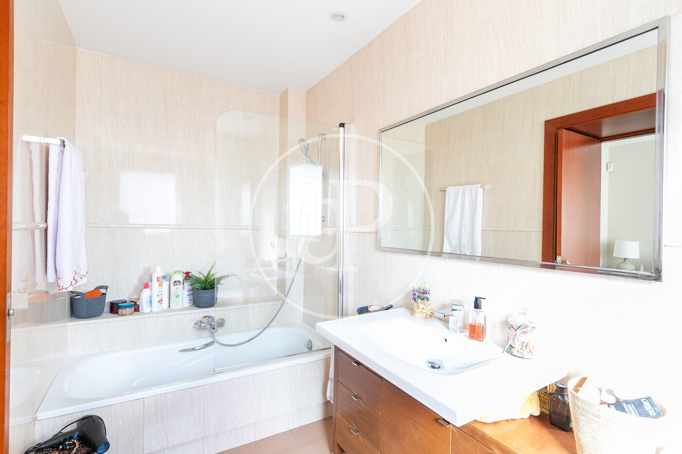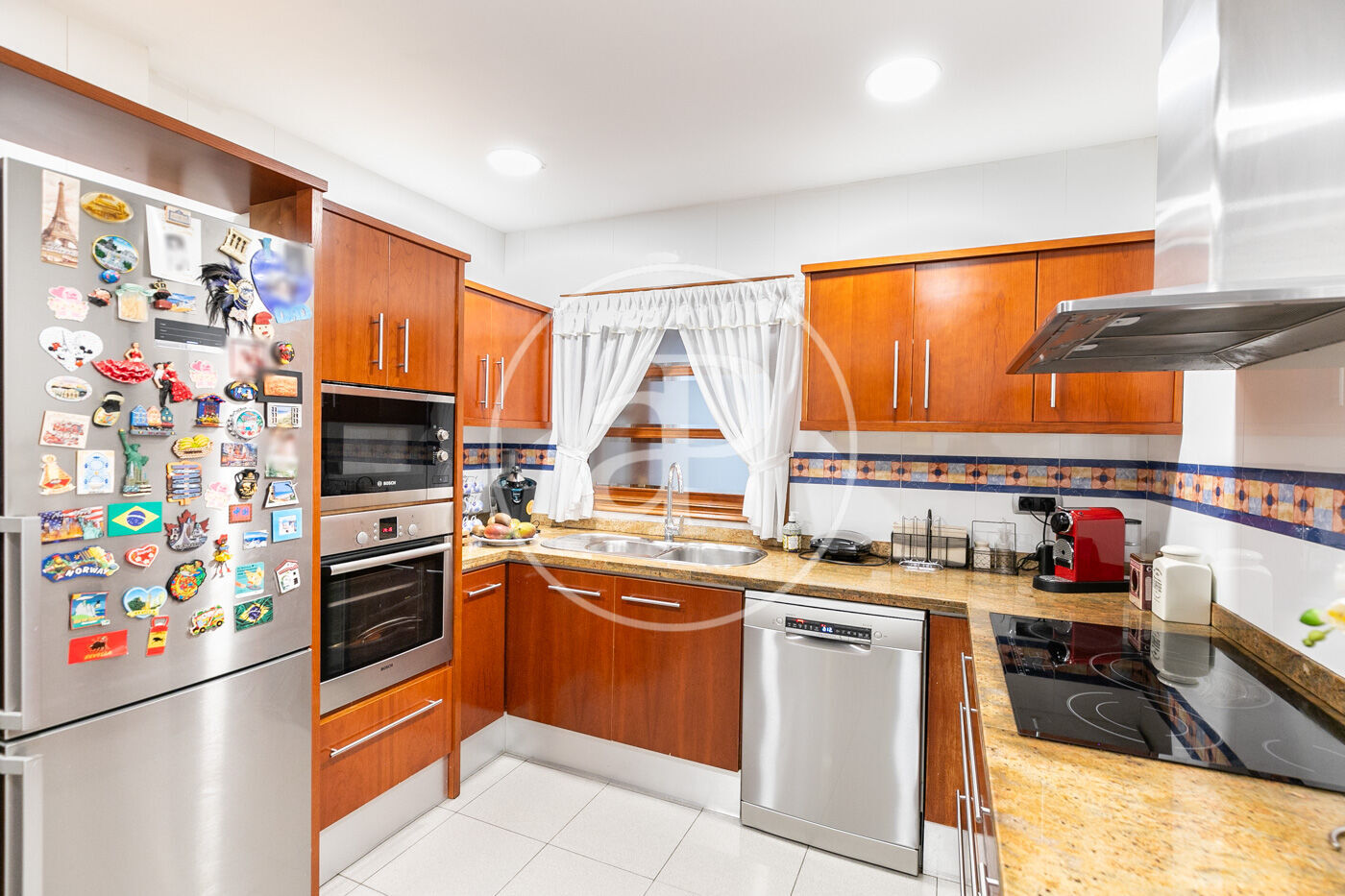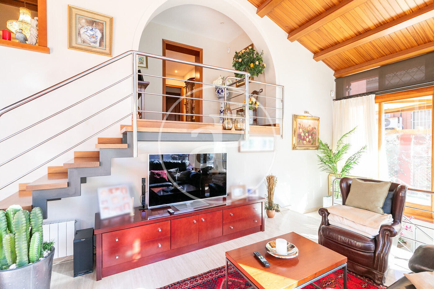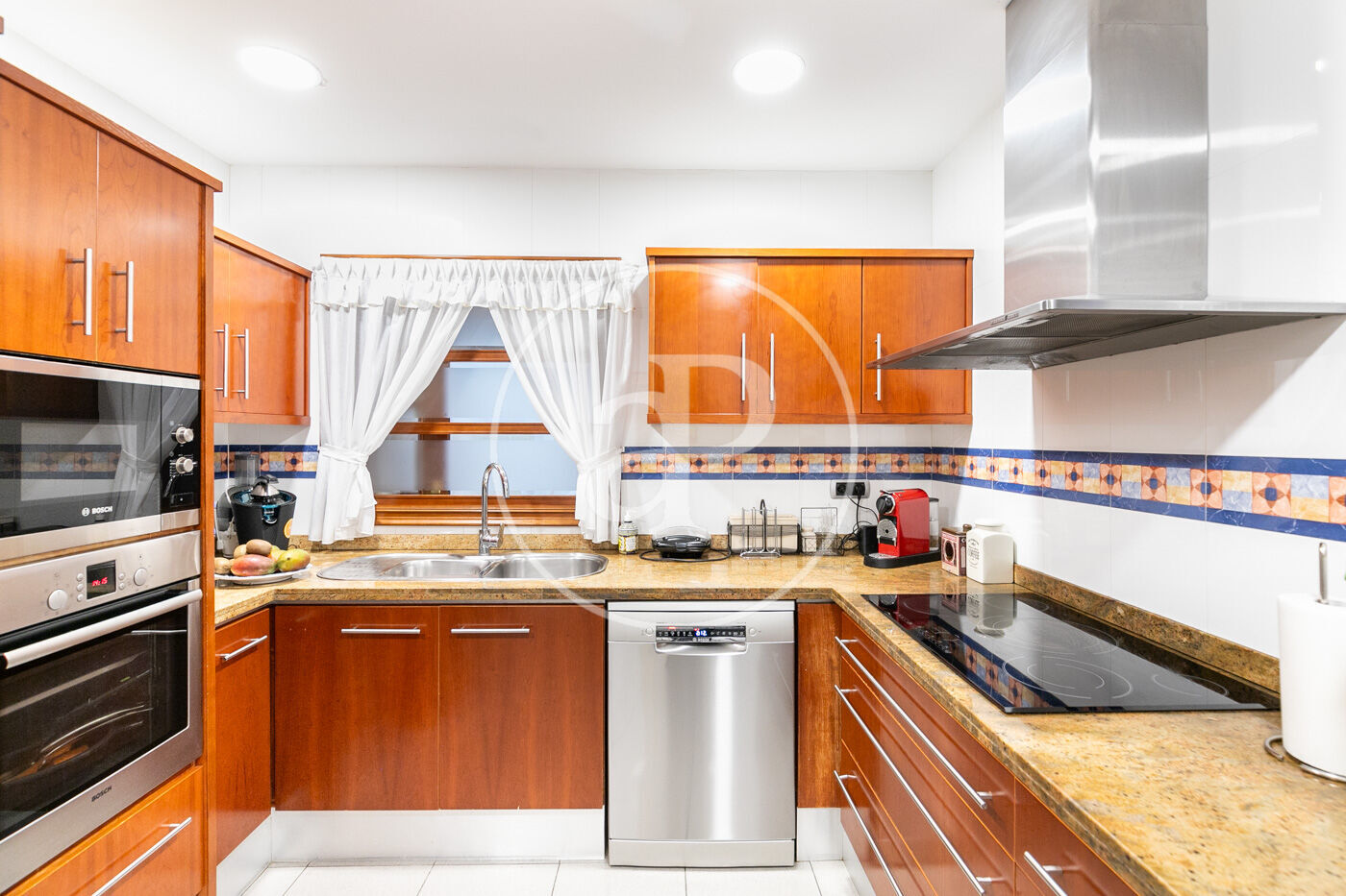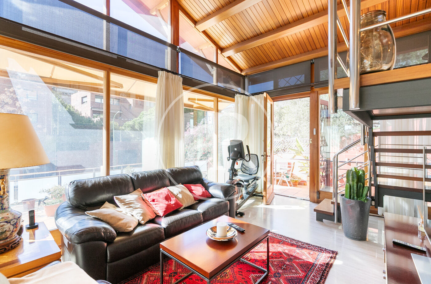 En la planta de acceso la casa cuenta con un salón-comedor orientado hacia el sur y abuhardillado con grandes vigas de hierro recubiertas con madera que le otorgan personalidad y que dejan pasar la luz y dan mucha amplitud. Tenemos acceso a una amplísima terraza, en la que se pueden hacer múltiples proyectos, en función de las necesidades, desde un solárium, que es como está actualmente, donde pueden comer muchos comensales, hasta una zona ajardinada o, si se desea realizar un estudio. En la planta superior encontramos tres habitaciones exteriores, dos de ellas en suite. La cocina, amplia y con mucha zona de almacenaje, es un punto de encuentro excelente, muy cómoda y con salida directa a donde está la barbacoa.