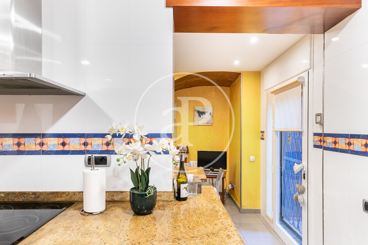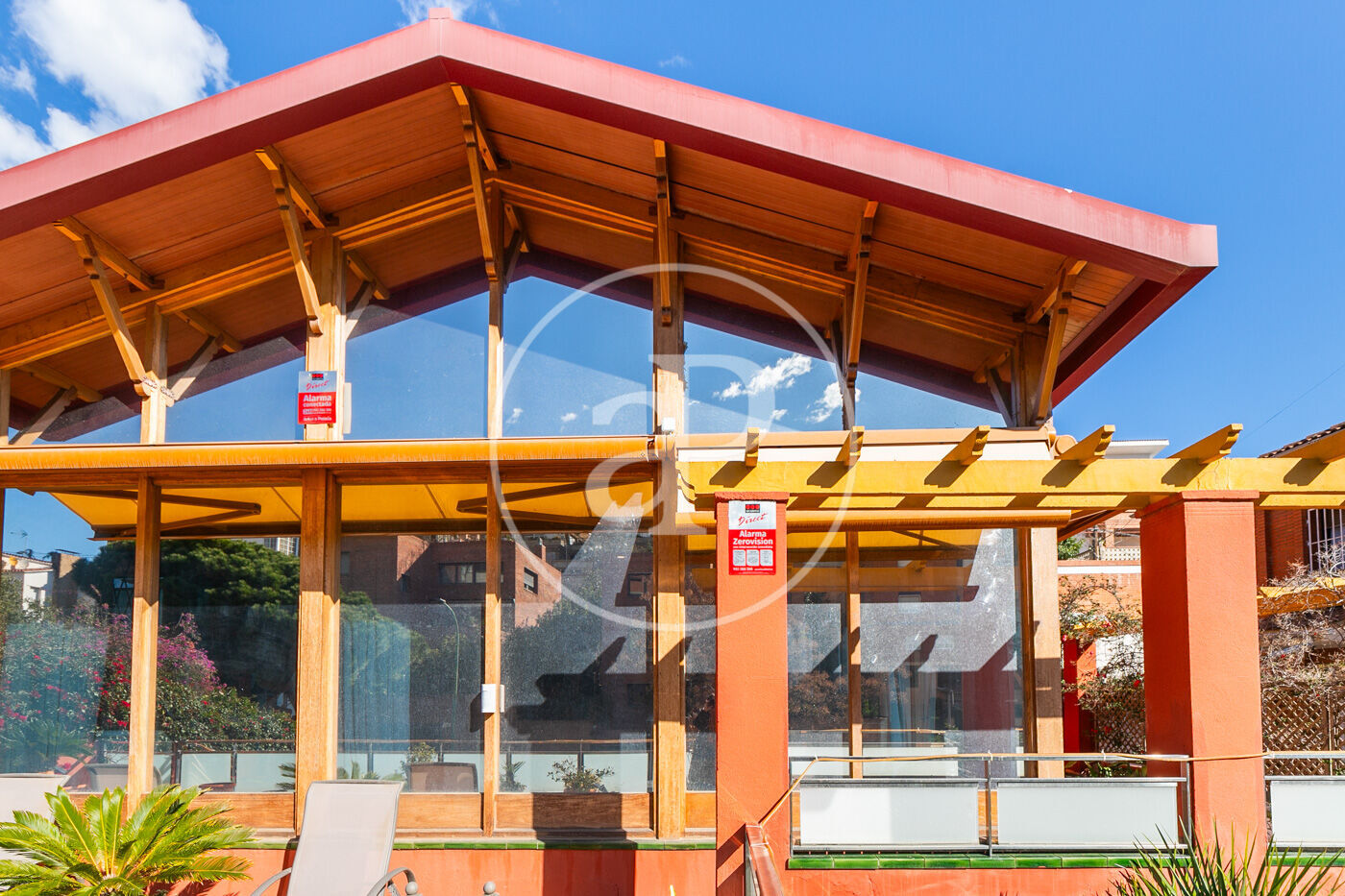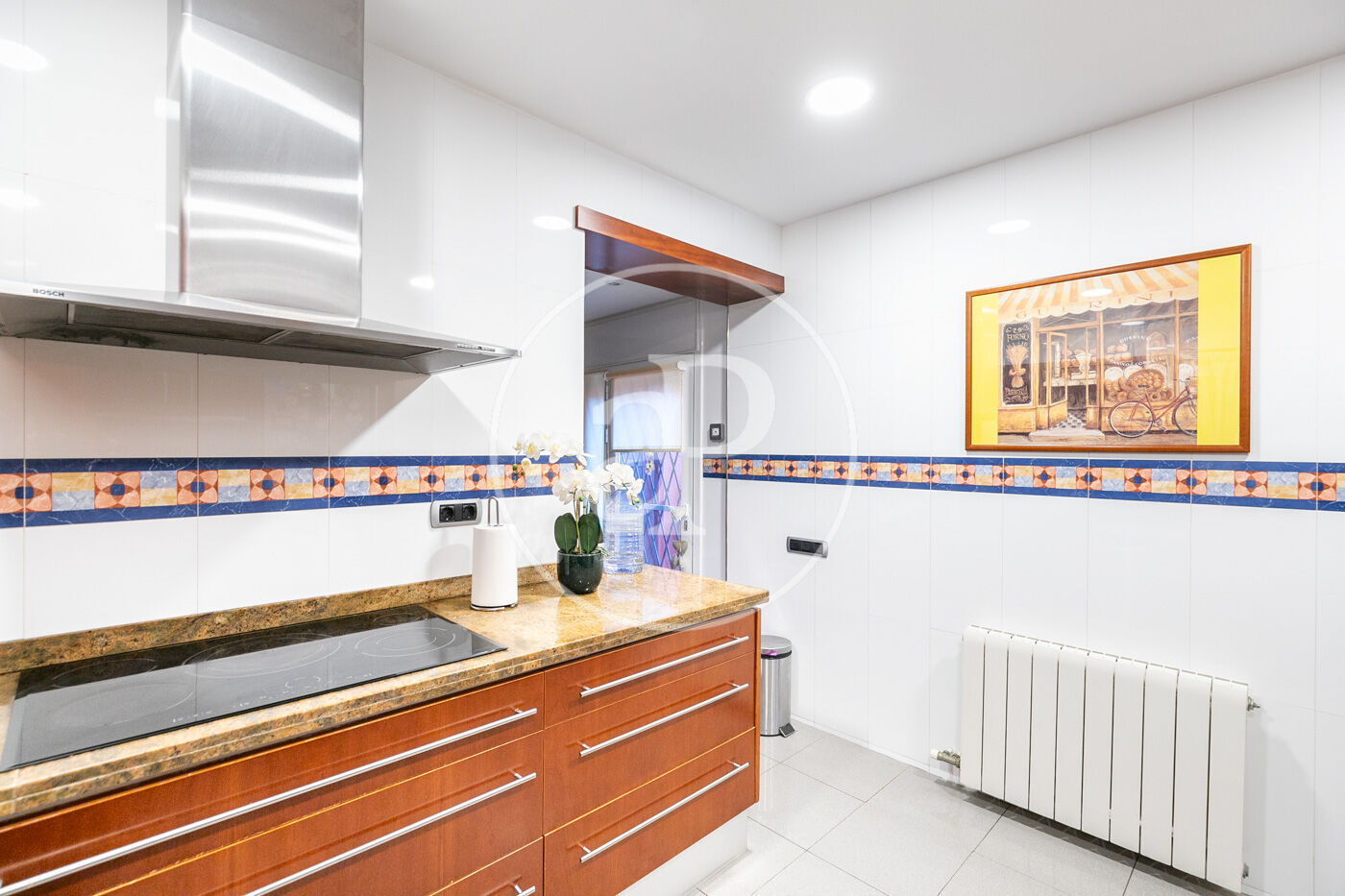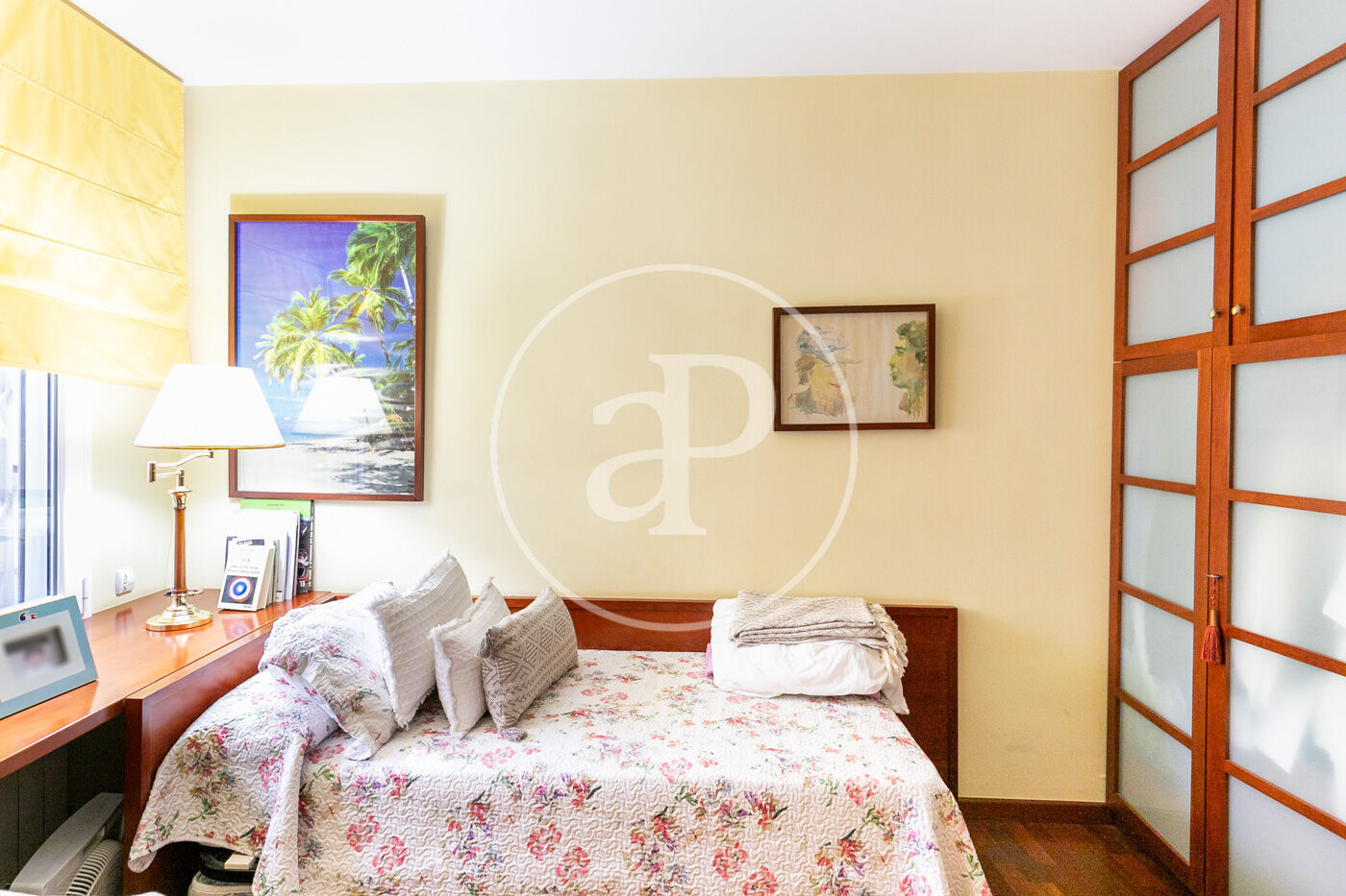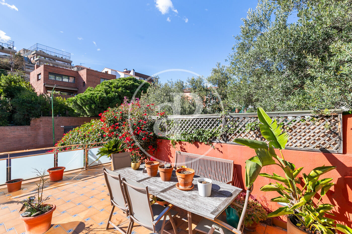En la planta de acceso la casa cuenta con un salón-comedor orientado hacia el sur y abuhardillado con grandes vigas de hierro recubiertas con madera que le otorgan personalidad y que dejan pasar la luz y dan mucha amplitud. Tenemos acceso a una amplísima terraza, en la que se pueden hacer múltiples proyectos, en función de las necesidades, desde un solárium, que es como está actualmente, donde pueden comer muchos comensales, hasta una zona ajardinada o, si se desea realizar un estudio. En la planta superior encontramos tres habitaciones exteriores, dos de ellas en suite. La cocina, amplia y con mucha zona de almacenaje, es un punto de encuentro excelente, muy cómoda y con salida directa a donde está la barbacoa.