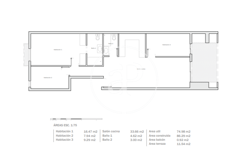 La propriété dispose de 3 chambres, 2 salles de bain, climatisation, armoires intégrées, buanderie, balcon, chauffage et salle de stockage.