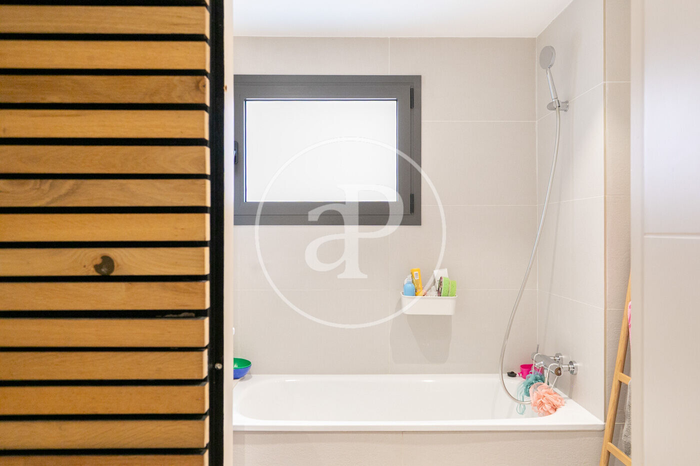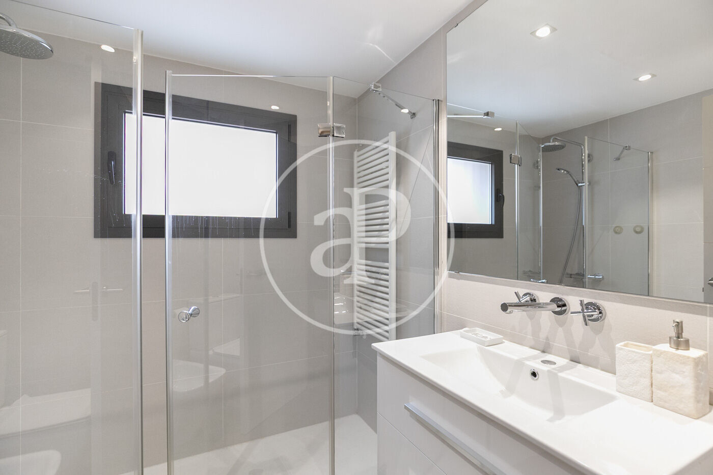 Cette magnifique maison individuelle d'environ 340m2, orientée sud-est, est située sur un terrain d'environ 480m2 dans la partie haute de Barcelone. Dans l'agréable quartier de Pedralbes, le quartier résidentiel le plus exclusif et l'un des plus élégants de la ville. Entouré d'espaces verts et de nature, il concentre les activités de formation scolaire et universitaire les plus prestigieuses au niveau international et abrite également les clubs sportifs et sociaux les plus prestigieux. Bien relié aux accès à la ville de Barcelone, le quartier de Sarriá offre la possibilité de profiter de ses services, commerces et établissements traditionnels, à ceux qui résident dans ce cadre privilégié.  La maison est répartie sur trois étages. Au rez-de-chaussée et celui qui donne accès à la maison par le hall, on trouve le hall d'entrée et son spacieux séjour, réparti en deux pièces. Un séjour avec cheminée et accès au jardin par une belle terrasse ensoleillée avec escalier et une salle à manger séparée. La cuisine très lumineuse, équipée d'appareils électroménagers haut de gamme, se fond dans la nature grâce à une grande fenêtre. De plus, l'étage dispose d'un lavabo de salle de bain gratuit.  On accède à l'étage supérieur, par un bel escalier en bois protégé par un mur décoré de pavés qui apporte couleur, luminosité et mène à une grande suite. Il dispose d'un grand double dressing, d'une chambre ouverte et polyvalente, d'une salle de bain avec jacuzzi et douche ; Il a également accès à une agréable terrasse de 30m2 avec vue sur la ville et la mer.  Le rez-de-chaussée se compose de deux pièces doubles extérieures avec accès à un porche très agréable donnant sur le jardin et d'une troisième chambre. Les trois chambres partagent deux grandes et lumineuses salles de bains avec baignoire et douche.  Au même niveau de cet étage, il y a un garage pour deux voitures et autres véhicules, une buanderie et une chambre de service complète avec placards intégrés. La maison dispose du chauffage au sol, de la climatisation, du parquet, des stores électriques, d'un jardin avec beaucoup de végétation et de palmiers, d'une piscine privée, d'un espace barbecue avec une salle à manger extérieure et d'un espace sauna intérieur. Cette propriété exclusive offre une intimité totale et un confort agréable à vivre toute l'année.