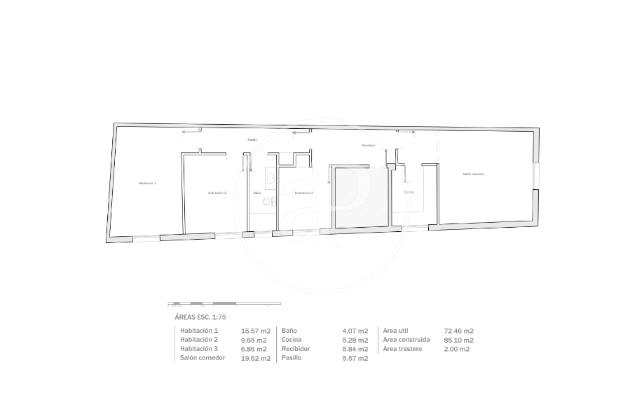 La propriété dispose de 3 chambres, 1 salle de bains, armoires intégrées et salle de stockage.