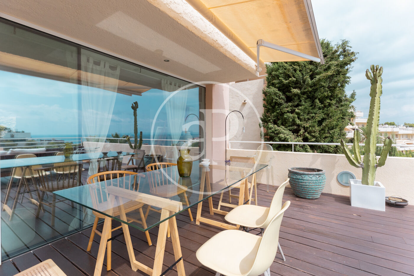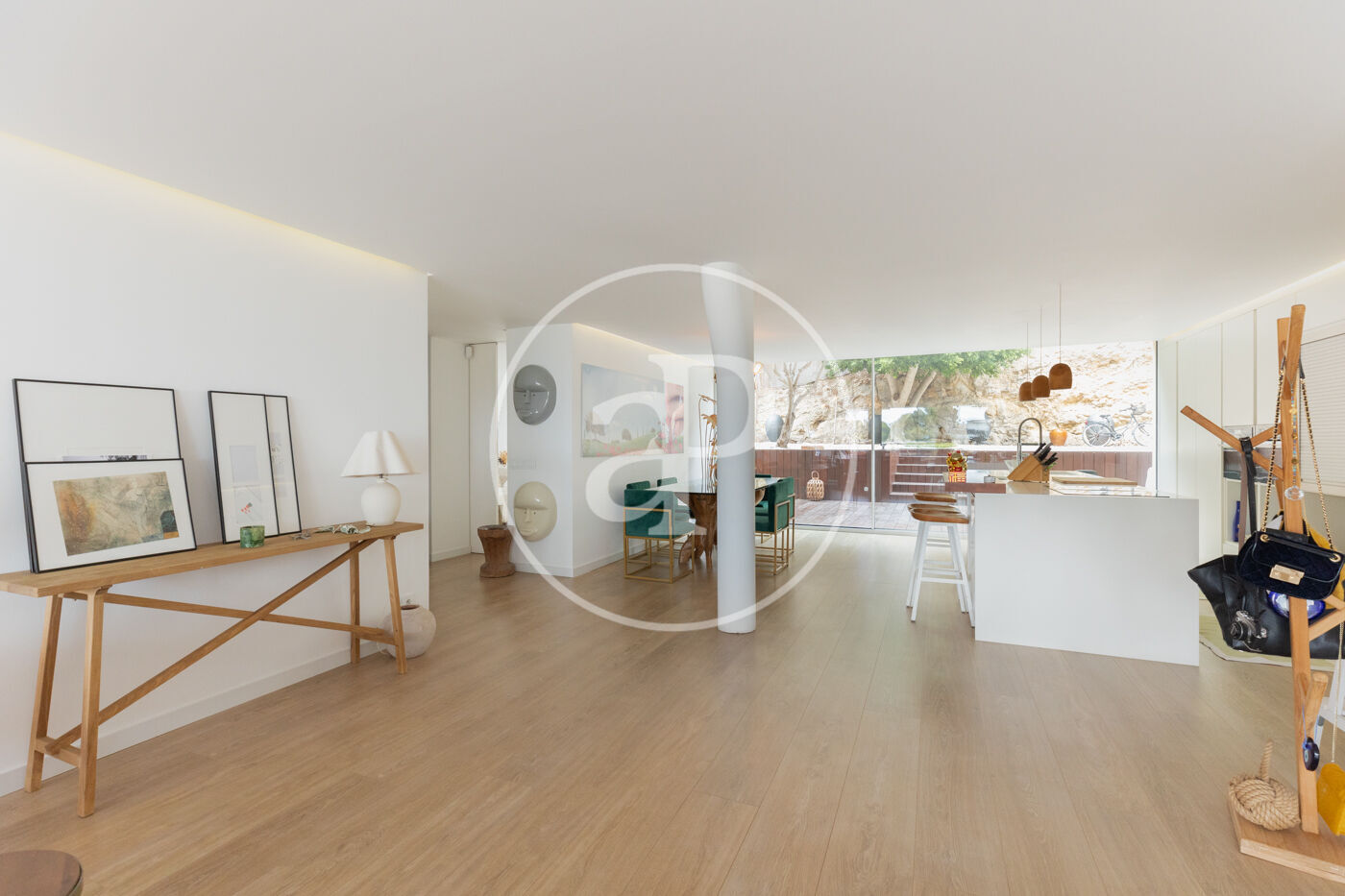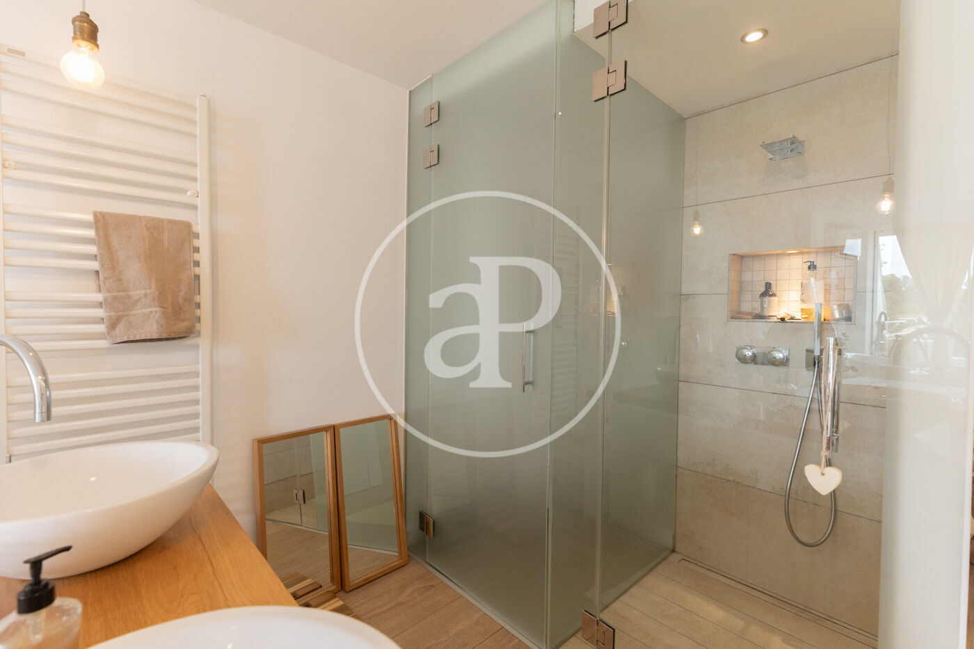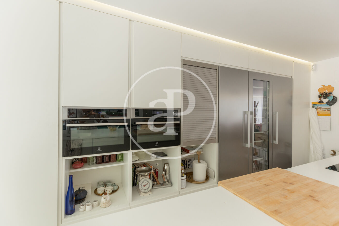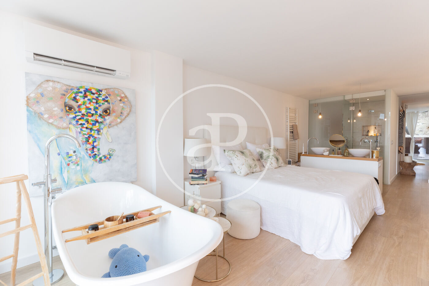 Depuis la porte d'entrée de la propriété, on accède à un spacieux salon-salle à manger décoré avec beaucoup de charme, avec de grandes fenêtres qui donnent accès à la terrasse de 70 m², un espace pour se détendre et profiter du climat méditerranéen avec des canapés pour se reposer. Elle dispose d'une autre grande terrasse arrière idéale pour les barbecues et où se trouve la buanderie. La cuisine, ouverte sur le salon, est grande et spacieuse, elle dispose d'un îlot parfait pour cuisiner confortablement. Elle est meublée et équipée.