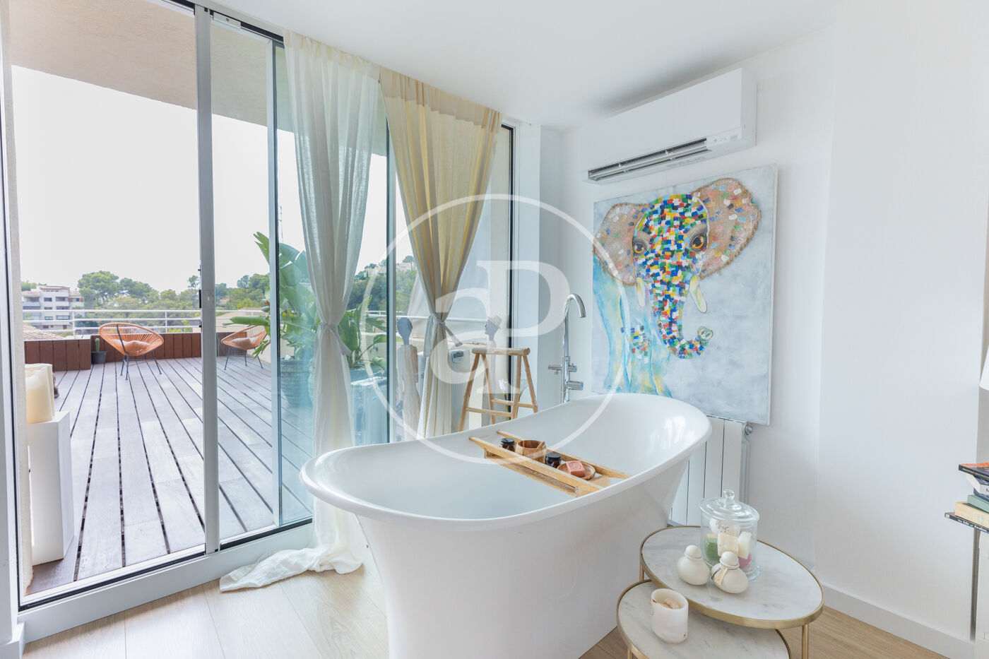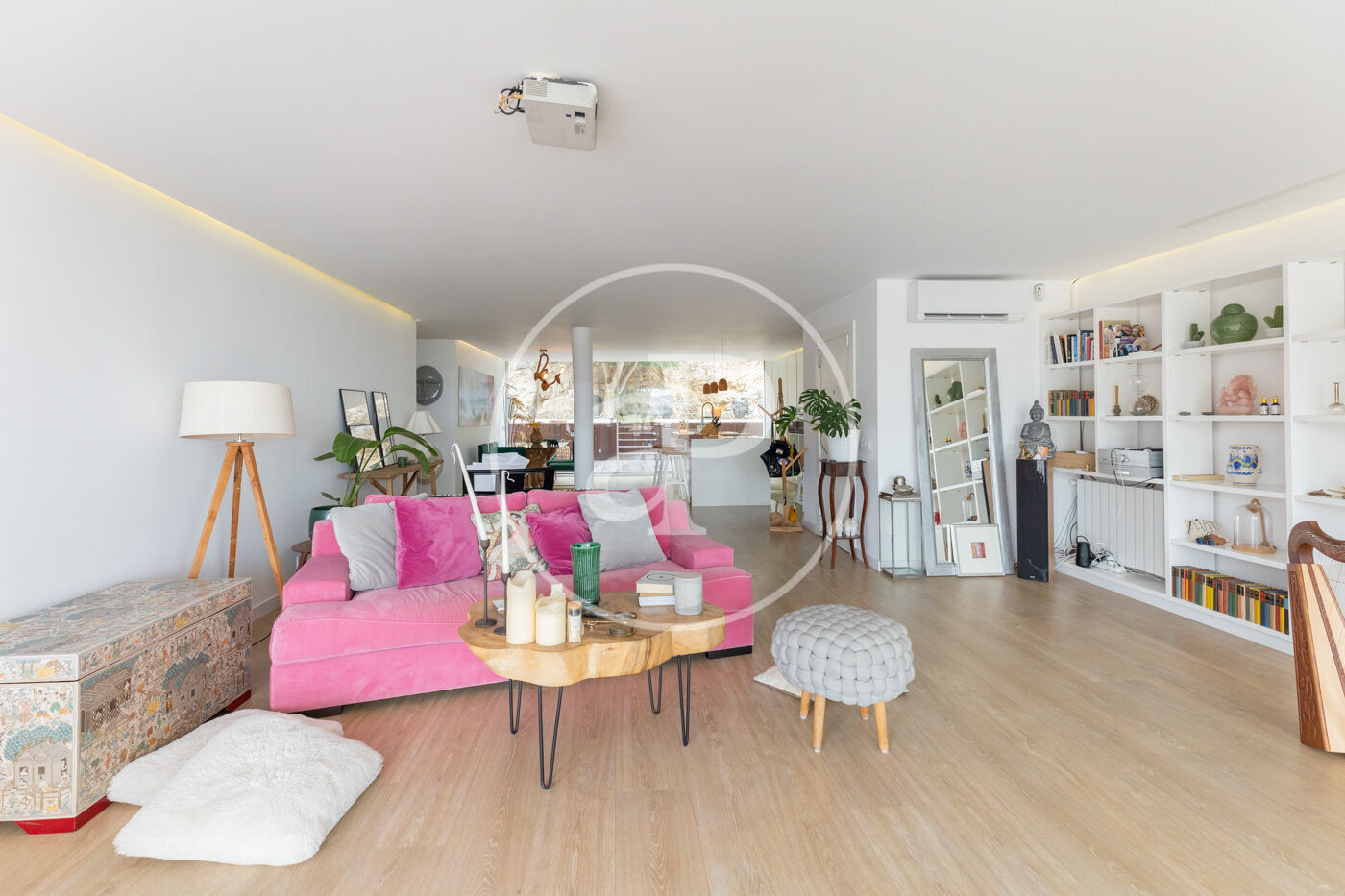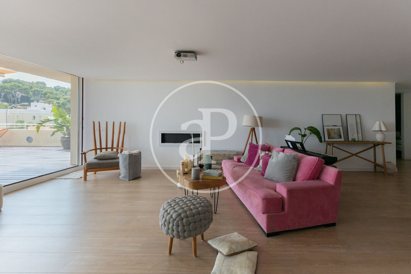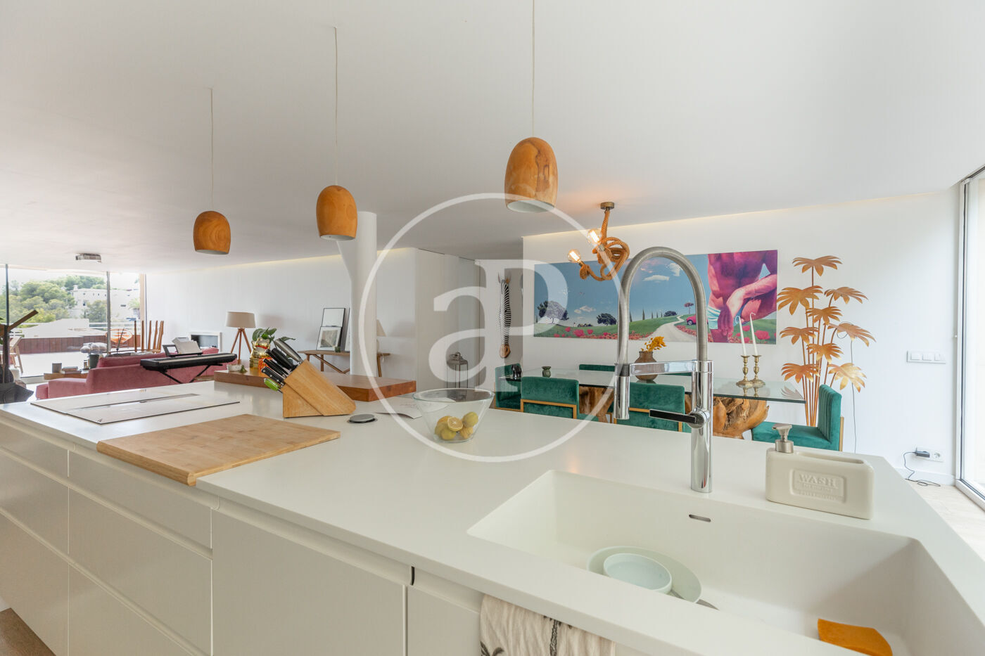 Depuis la porte d'entrée de la propriété, on accède à un spacieux salon-salle à manger décoré avec beaucoup de charme, avec de grandes fenêtres qui donnent accès à la terrasse de 70 m², un espace pour se détendre et profiter du climat méditerranéen avec des canapés pour se reposer. Elle dispose d'une autre grande terrasse arrière idéale pour les barbecues et où se trouve la buanderie. La cuisine, ouverte sur le salon, est grande et spacieuse, elle dispose d'un îlot parfait pour cuisiner confortablement. Elle est meublée et équipée.