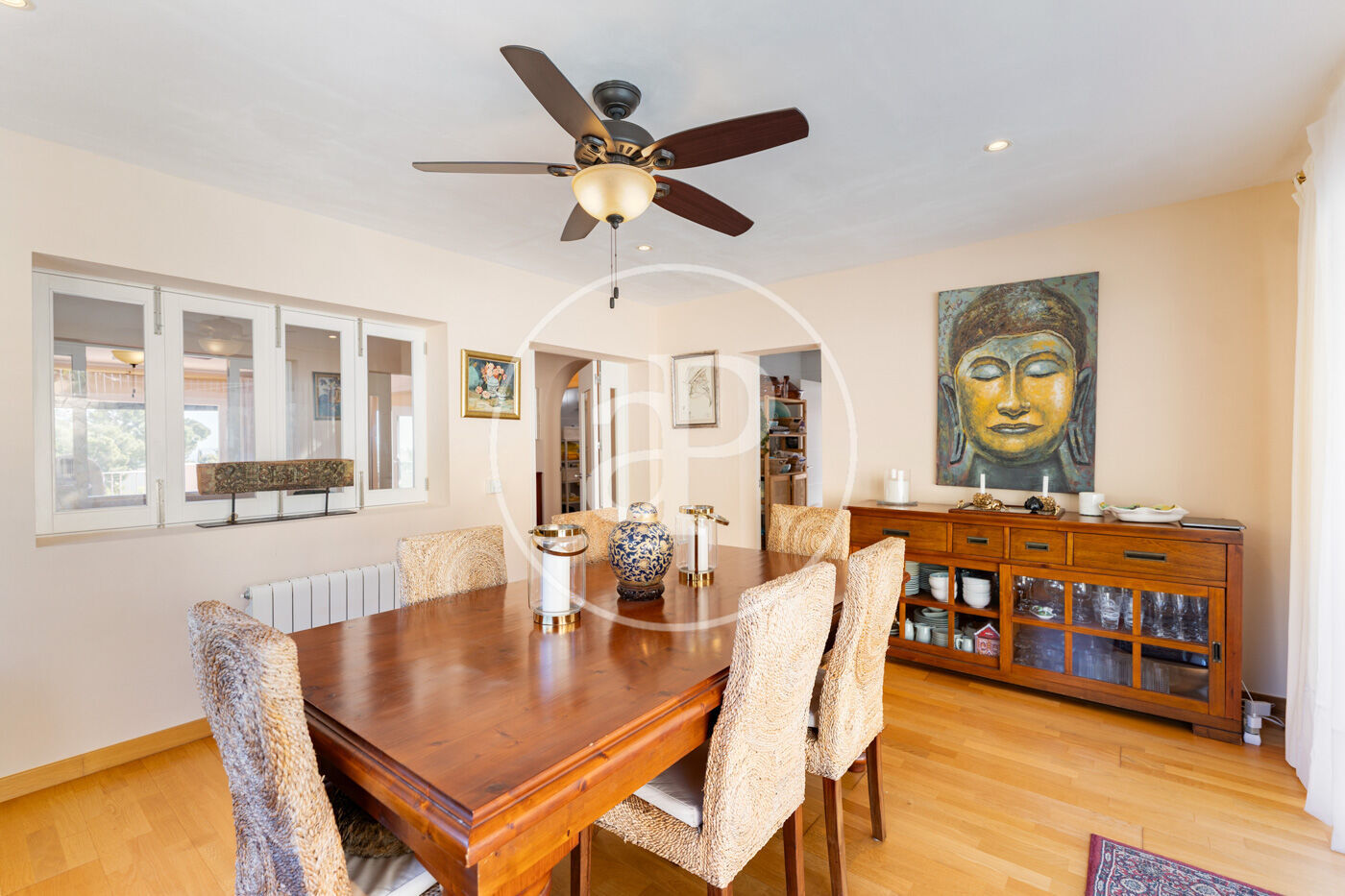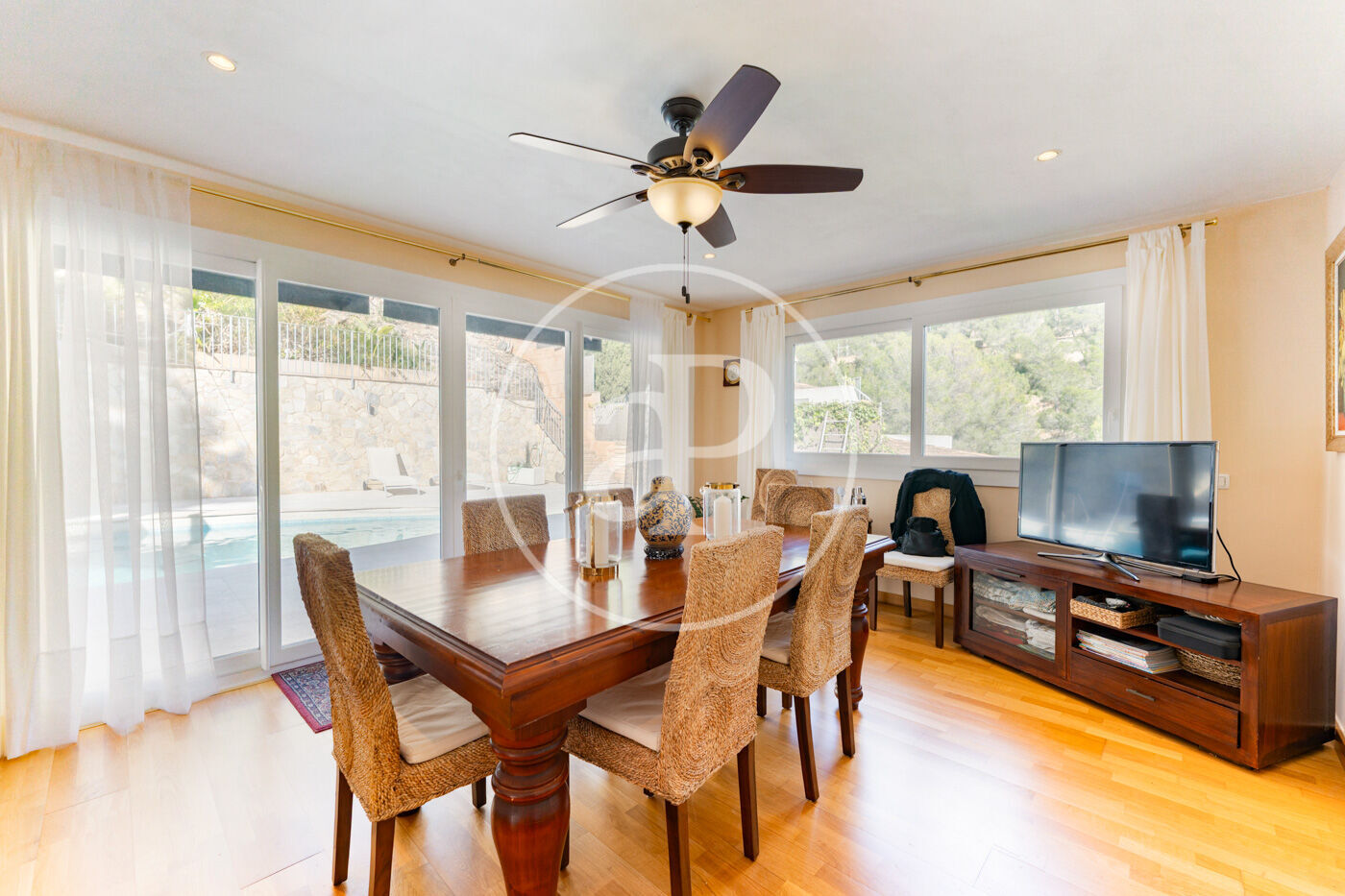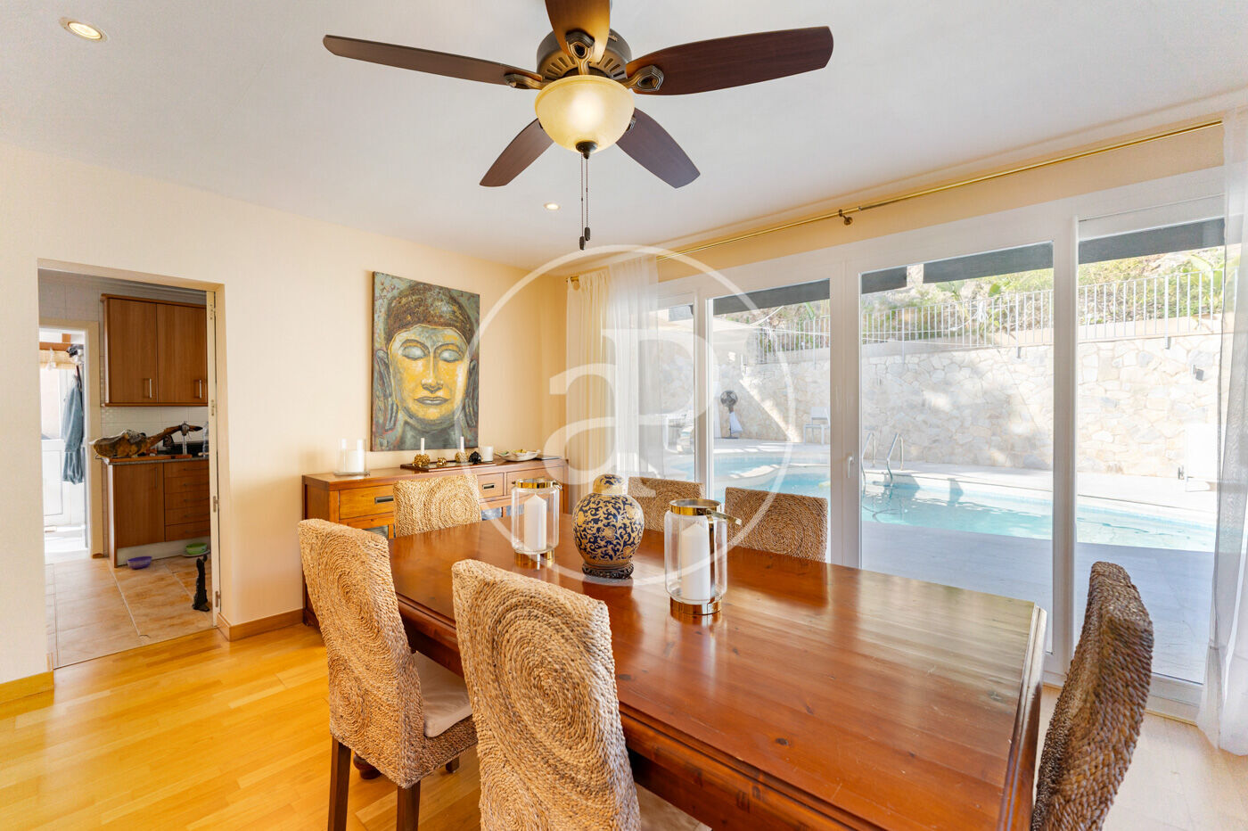La propriété dispose de 4 chambres, 3 salles de bain, piscine, 1 place de parking, climatisation, armoires intégrées, buanderie, balcon, jardin, chauffage et salle de stockage.