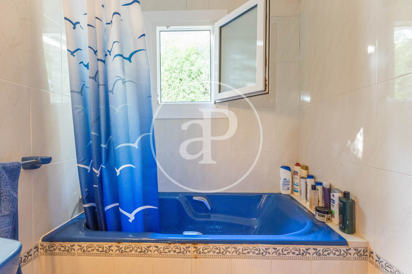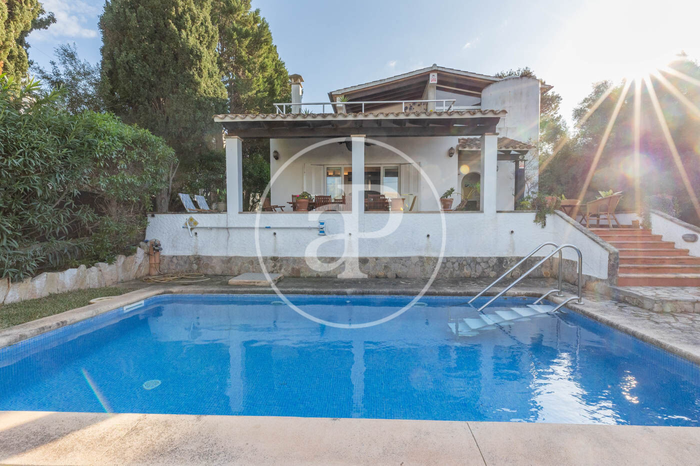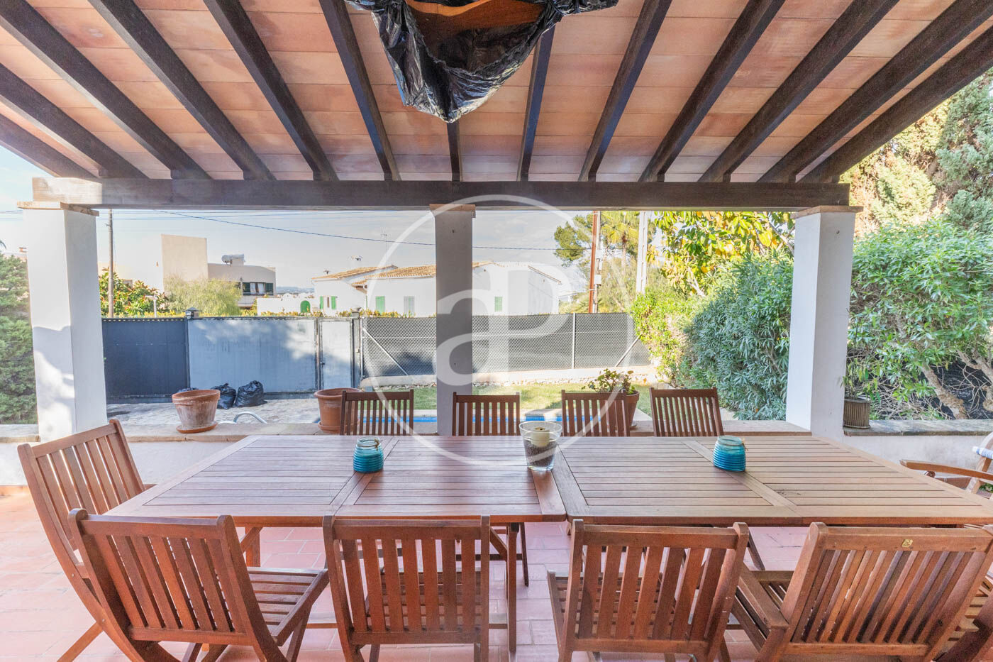 La maison principale dispose de 4 chambres doubles spacieuses, toutes équipées de placards, et de deux salles de bains. La cuisine récemment rénovée est ouverte sur la salle à manger et le salon, où une cheminée apporte une touche chaleureuse pendant les mois les plus frais. De là, on accède au terrain de 568 m² avec piscine, porche couvert et espace barbecue, idéal pour profiter du climat majorquin.