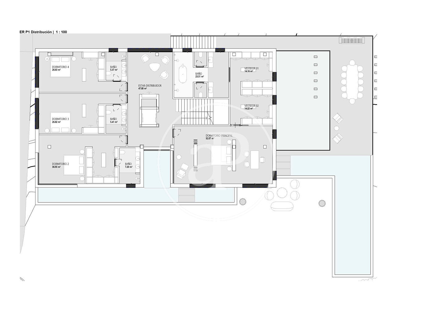 La propriété dispose de 6 chambres, 8 salles de bain, piscine, salle de sport, 2 places de parking, climatisation, armoires intégrées, buanderie, jardin, chauffage et salle de stockage.