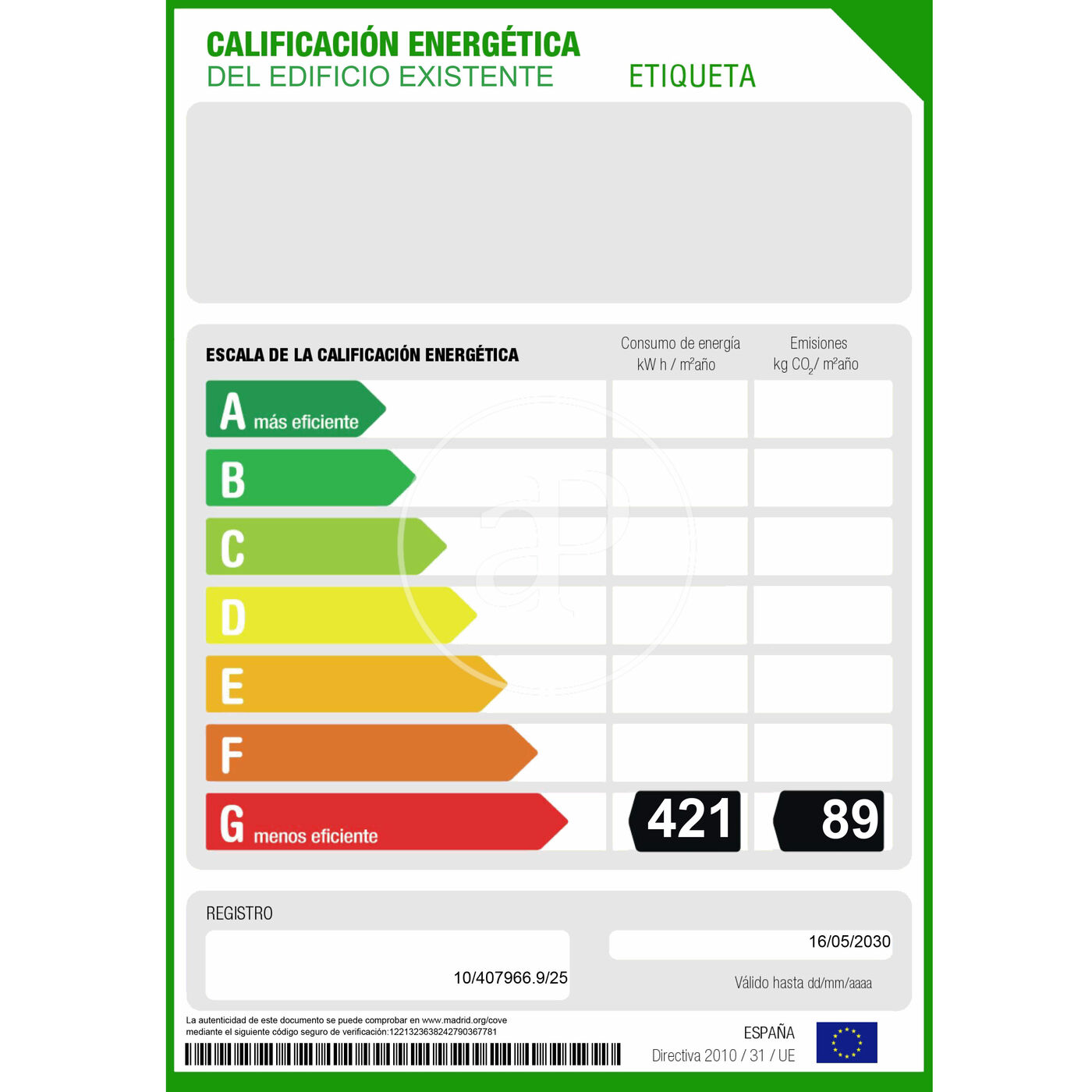 Plus efficace Moins efficace Classe énergétique Consommation d'énergie Kw h/m² an Émissions Co/m² an 421.00 89.00