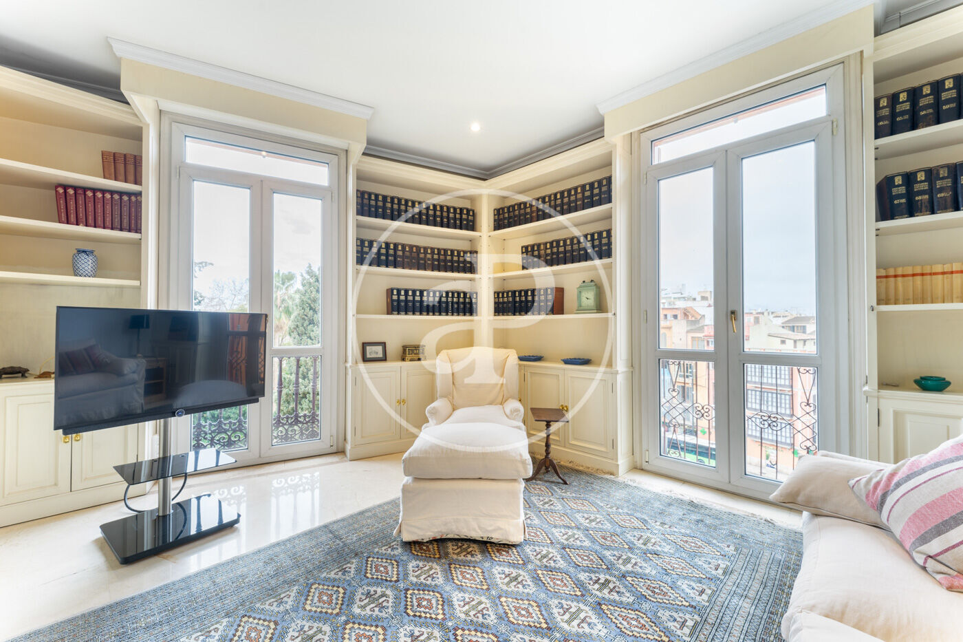 Le salon est double, vaste et très lumineux, divisé en séjour, salle à manger et une salle avec une bibliothèque très accueillante, offrant une vue dégagée sur la cathédrale.