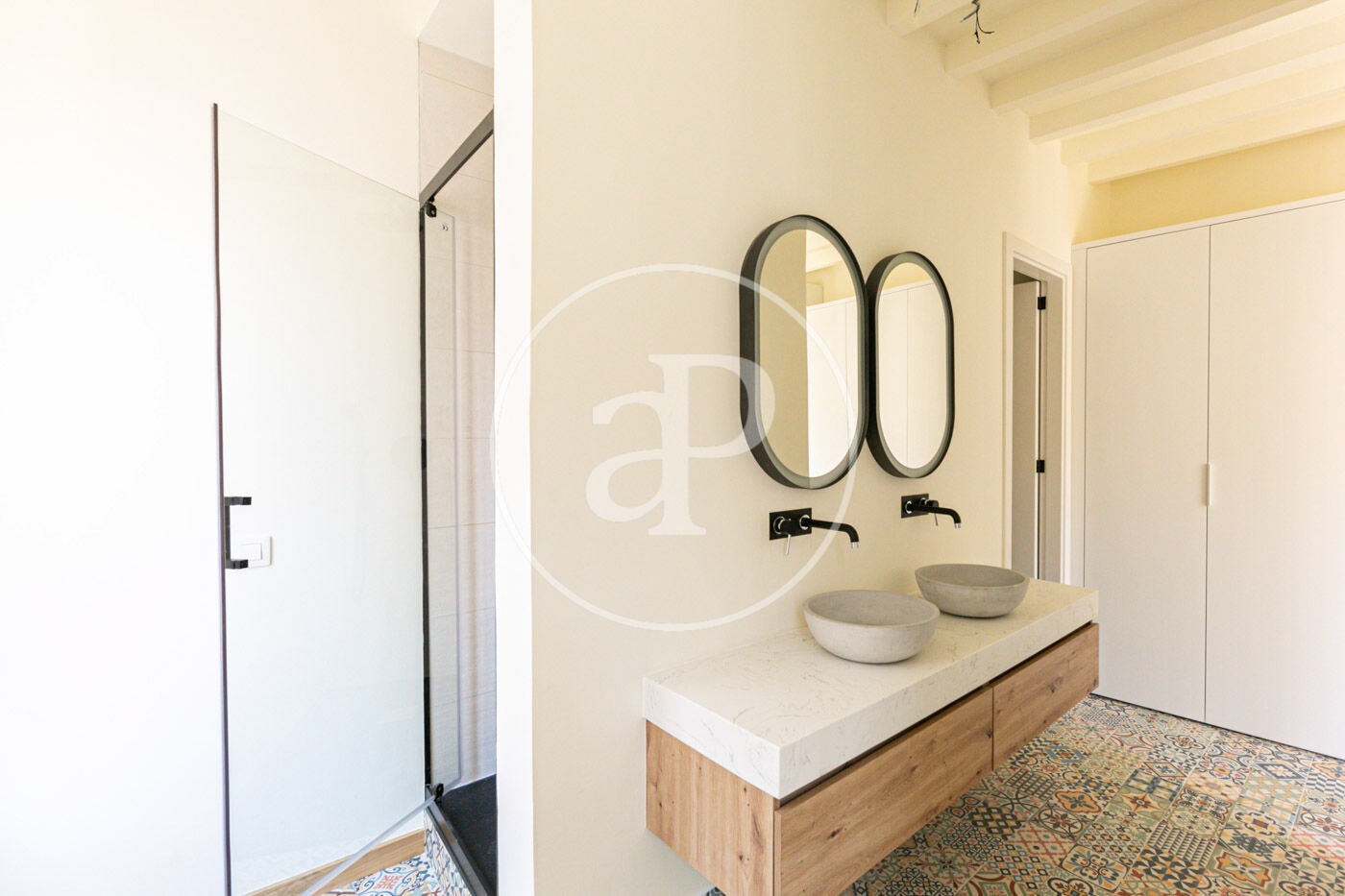Il y a deux chambres à coucher. La première est une suite parentale avec des toilettes, une salle de bains complète avec double lavabo et douche et une grande armoire encastrée. Elle est très lumineuse grâce à ses trois grandes fenêtres. La seconde est une chambre double avec une petite terrasse équipée d'une table et de chaises, un espace de bureau à domicile.