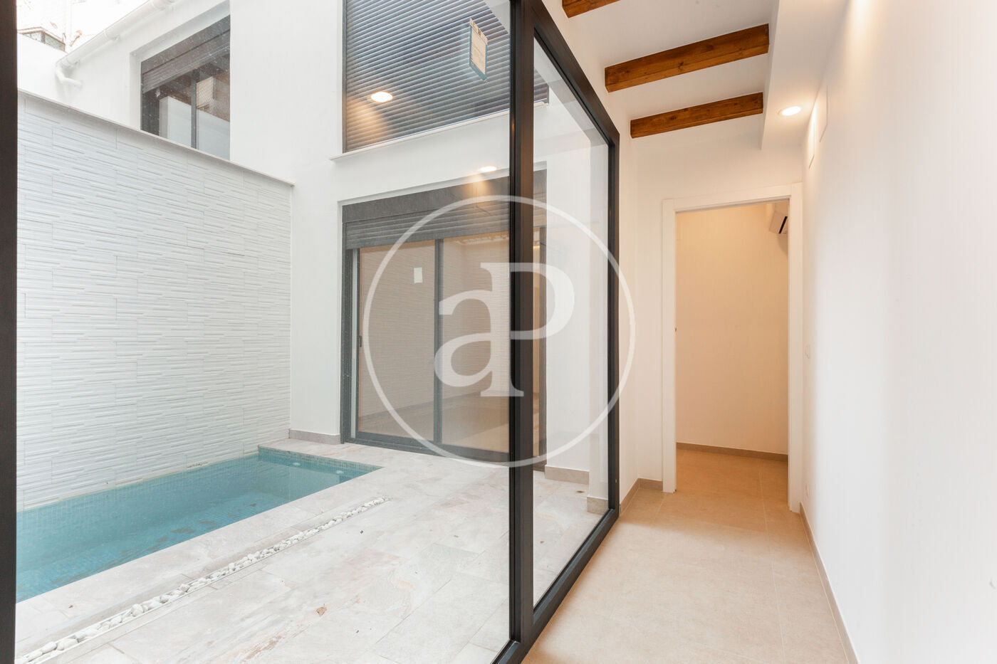 En entrant, un hall d'entrée mène à un toilette invité et à un spacieux salon-salle à manger qui s'intègre parfaitement avec la cuisine ouverte, créant une atmosphère lumineuse, moderne et accueillante. De plus, cet étage dispose d'une terrasse privée avec piscine, idéale pour profiter de l'extérieur et se détendre.