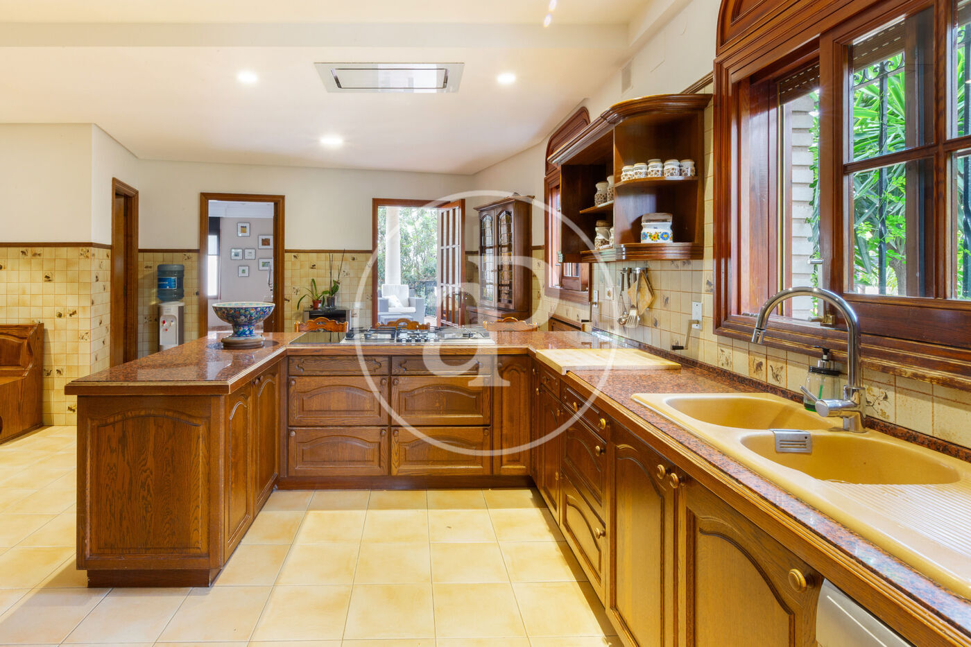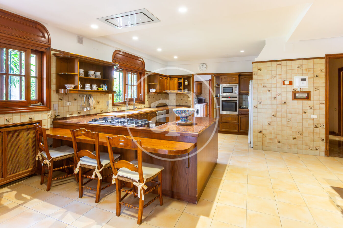 Accedemos a la vivienda a través de un majestuoso recibidor que da paso a dos grandes salones a ambos lados, perfectamente iluminados y decorados con acabados de alta gama. Uno de los salones- comedores se distribuye en dos espacios y cuenta con chimenea y acceso a amplia terraza techada con vistas a jardín y piscina. La otra estancia se ha reconvertido en un gran dormitorio doble con baño en suite y su propio salón despacho con salida a terraza. En esta misma planta encontramos, igualmente, un baño completo, un aseo de cortesía y una amplia cocina totalmente equipada, con abundante luz natural y salida directa a varias terrazas. La zona de lavadero independiente conecta con el exterior y también da acceso a la zona de piscina.