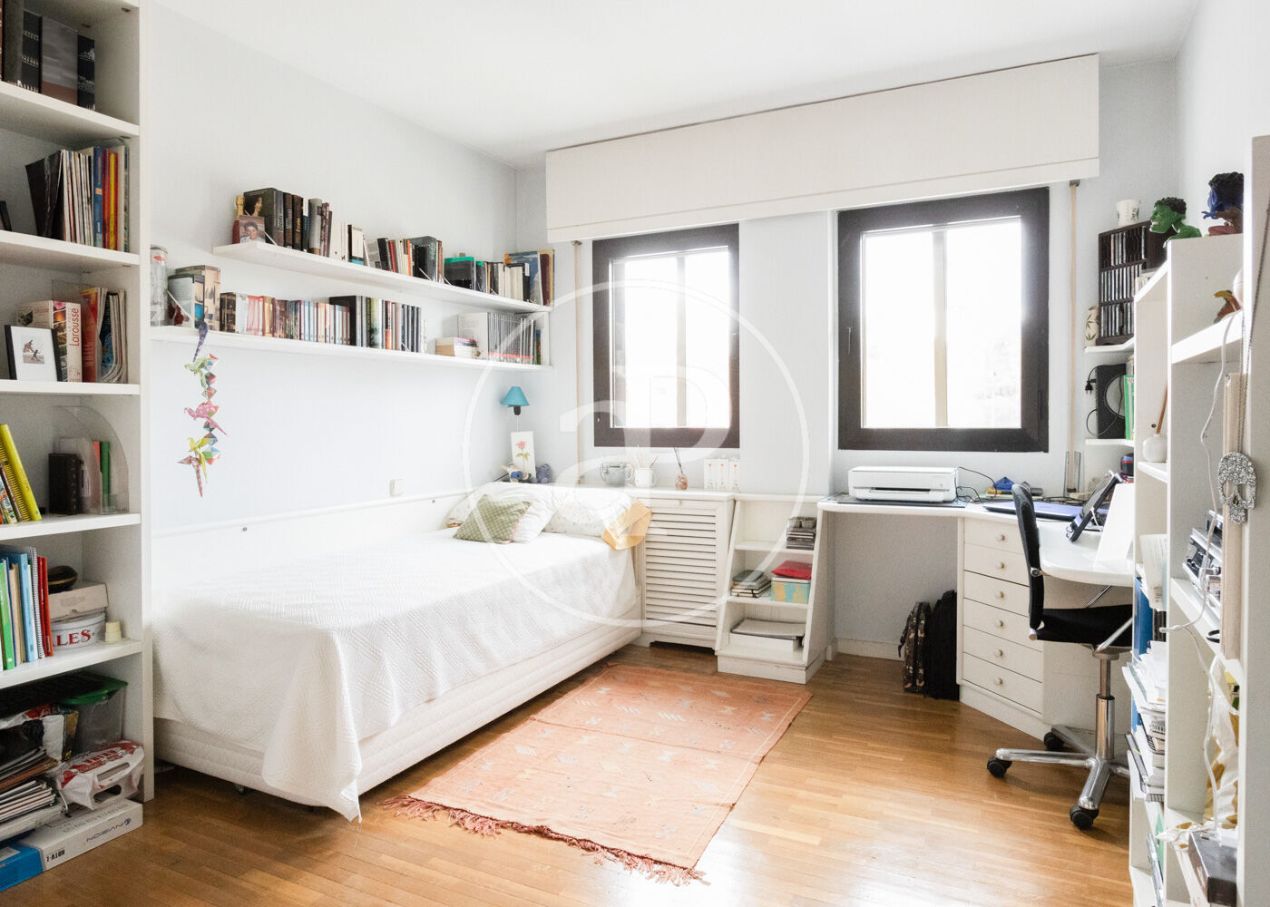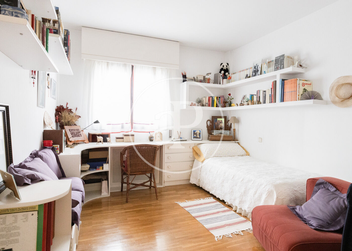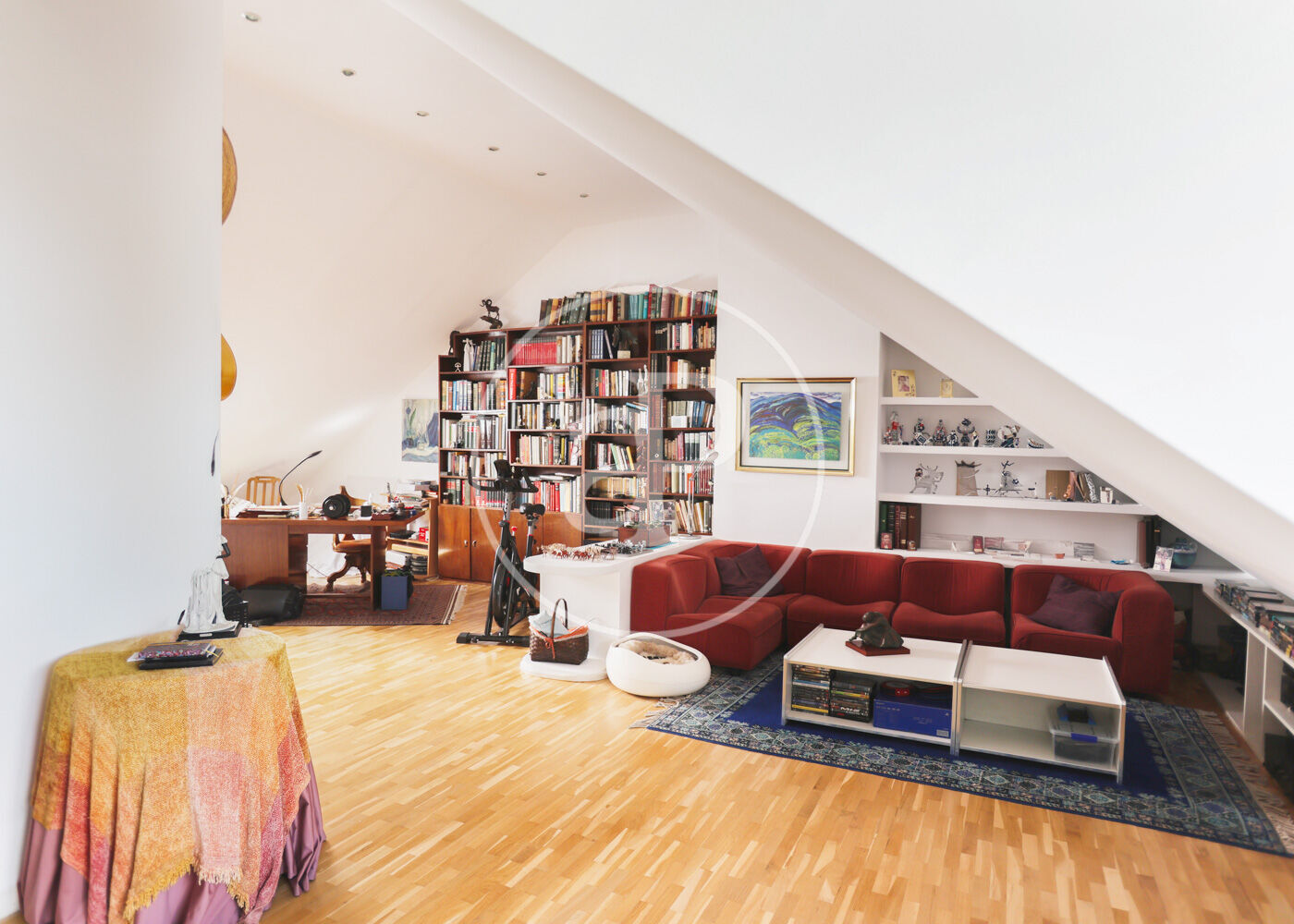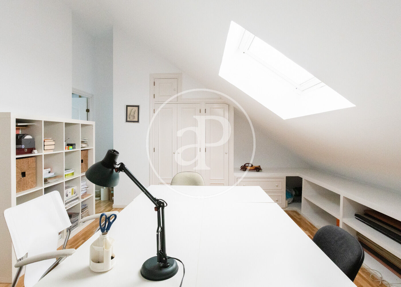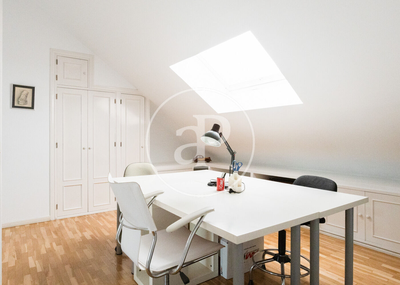 La buhardilla, con techos altos y gran versatilidad, ofrece un dormitorio adicional, baño completo y una amplia zona diáfana ideal como family room, despacho, sala de juegos o espacio multifuncional.