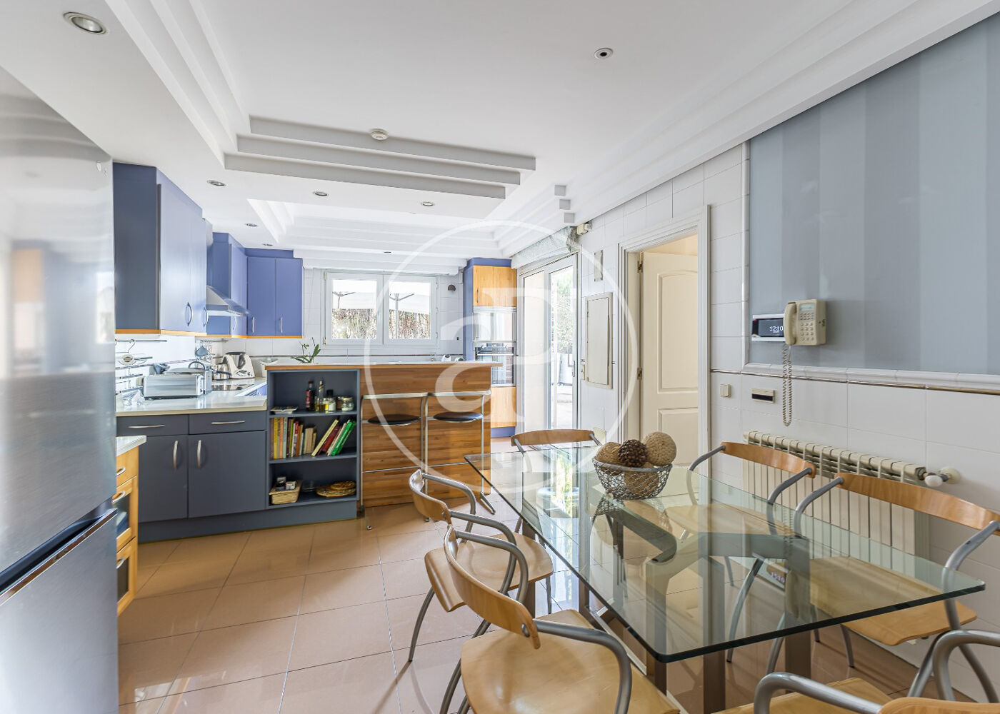 La planta principal acoge un elegante hall de entrada que organiza de forma armónica las distintas estancias. Destaca el impresionante salón-comedor de aproximadamente 90 m², un espacio representativo de grandes dimensiones, con excelente entrada de luz natural y agradables vistas al jardín. La cocina, amplia y funcional, cuenta con acceso independiente y conexión directa con la zona de servicio, compuesta por dormitorio, baño completo y área de lavandería y plancha.