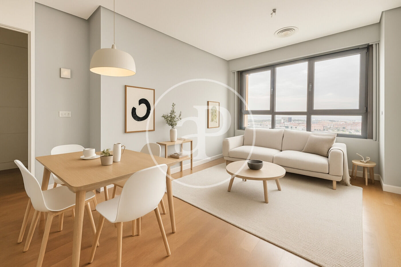 Según accedemos a la vivienda observamos el hall que da acceso al salón con vistas a las Cuatro Torres. La cocina está equipada con placa vitrocerámica, campana extractora, horno, microondas, nevera, así como lavadora. La zona de noche dispone de un dormitorio doble con armarios empotrados, y un baño completo en suite.