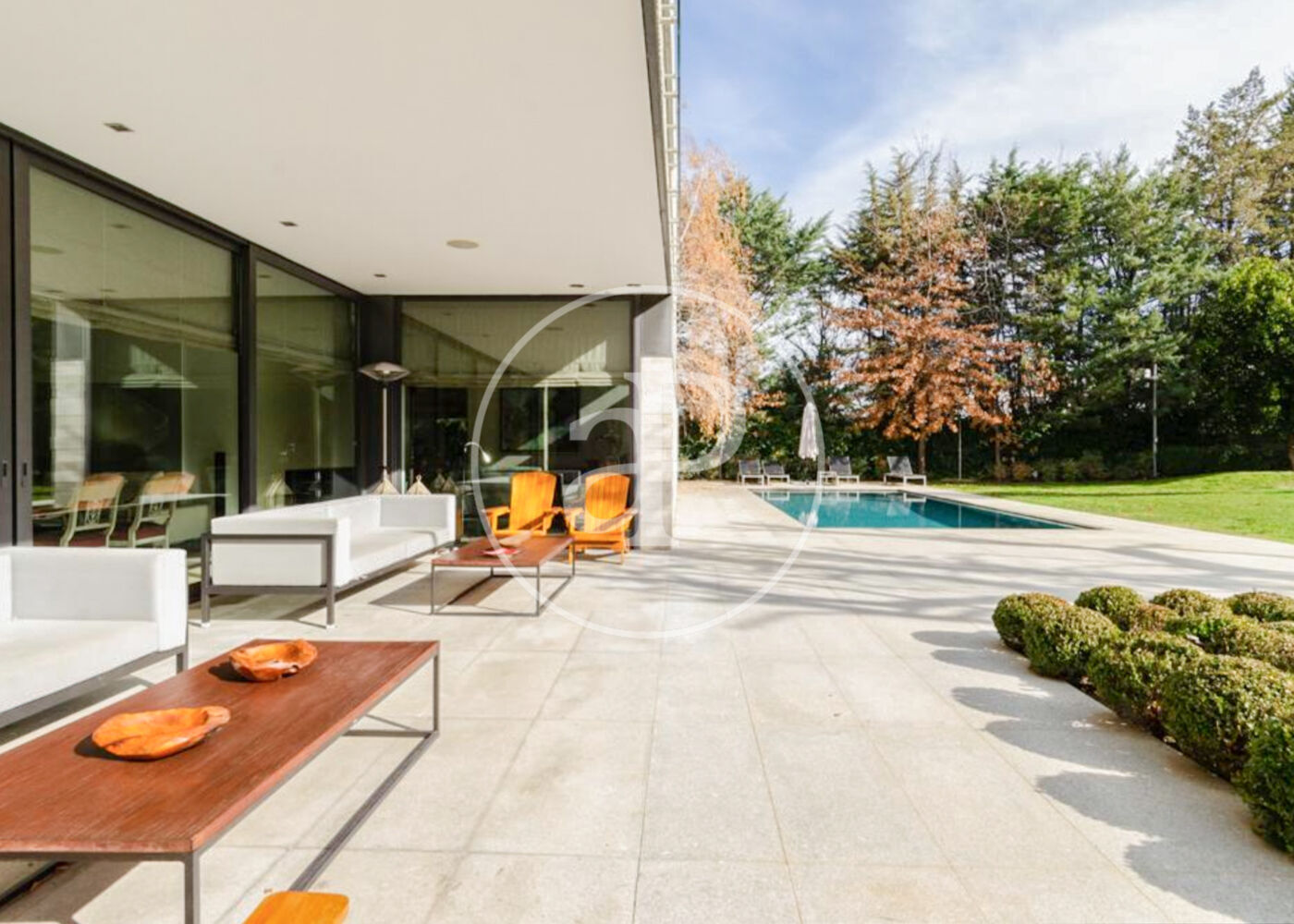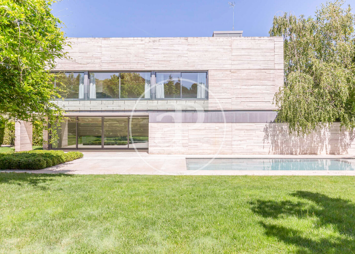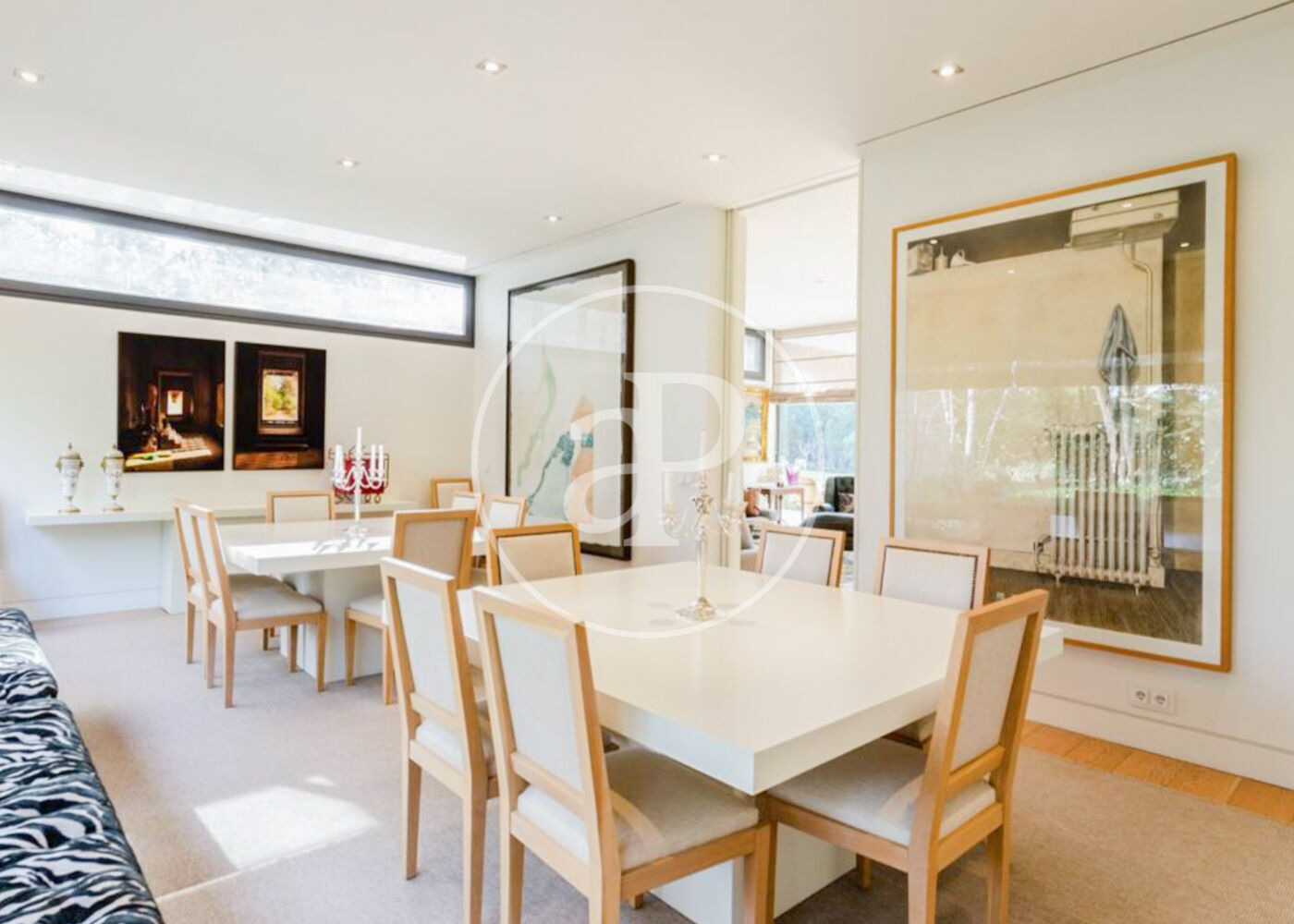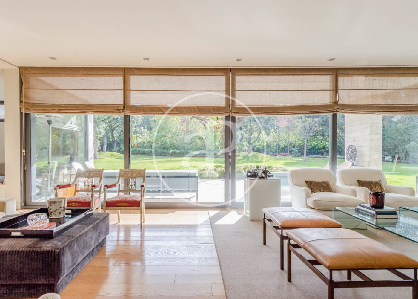 Destaca por sus grandes ventanales, techos altos y jardines ingleses en su interior, que brindan una sensación de conexión con la naturaleza en todas las estancias. La distribución inteligente de la casa comienza en la entrada principal, que conduce a un amplio salón con vistas al hermoso jardín, un comedor, una sala de estar con acceso al porche y los jardines, y una cocina espaciosa con acceso a la planta semisótano, donde se encuentra la zona de servicio. En la primera planta, se encuentra el dormitorio principal con vistas al jardín, una sala de estar acogedora, un amplio vestidor y un baño en suite. Además, hay cuatro dormitorios más con baño en suite y grandes armarios empotrados, todos con hermosas vistas al jardín. El semisótano cuenta con una sala de eventos o cine, un dormitorio de invitados con baño en suite, gimnasio con spa, zona de servicio, garaje y zona de almacenamiento, con la comodidad adicional de un ascensor que conecta todos los niveles de la casa. La propiedad se encuentra en una parcela plana de 2.700 m², con un exquisito diseño del reconocido arquitecto Ignacio Vicens. Dispone de un imponente y elegante salón con vistas al jardín y porche cubierto con piscina, una amplia cocina con acceso al exterior, cinco dormitorios en la planta de descanso, y un sótano con sala de ocio, trasteros, garaje, dormitorio de invitados, zona de lavandería y habitaciones de servicio. El jardín, un verdadero oasis con vegetación variada, ofrece serenidad y privacidad, perfecto para eventos familiares y con amigos. Con una ubicación inmejorable en una tranquila calle sin salida, esta propiedad ofrece una combinación única de diseño contemporáneo, belleza natural y comodidades excepcionales. No pierdas la oportunidad de adquirir esta vivienda de ensueño en una de las mejores zonas residenciales de Madrid. La Moraleja es una urbanización residencial de lujo situada en el municipio de Alcobendas, en la zona norte del área metropolitana de Madrid. Linda con otras urbanizaciones como El Soto de la Moraleja y El Encinar de los Reyes. La Moraleja es una de las urbanizaciones con mayor renta per cápita de toda España. Rodeada de zonas verdes, colegios privados a sus alrededores, seguridad para sus vecinos y a tan solo 20 minutos de Madrid o 15 minutos del aeropuerto, hacen de esta zona un enclave privilegiado para vivir a las afueras de la capital.