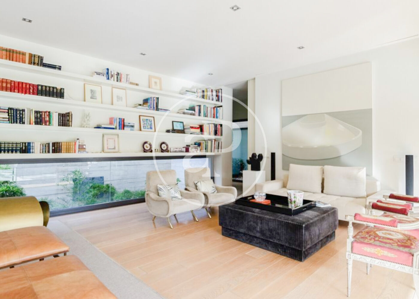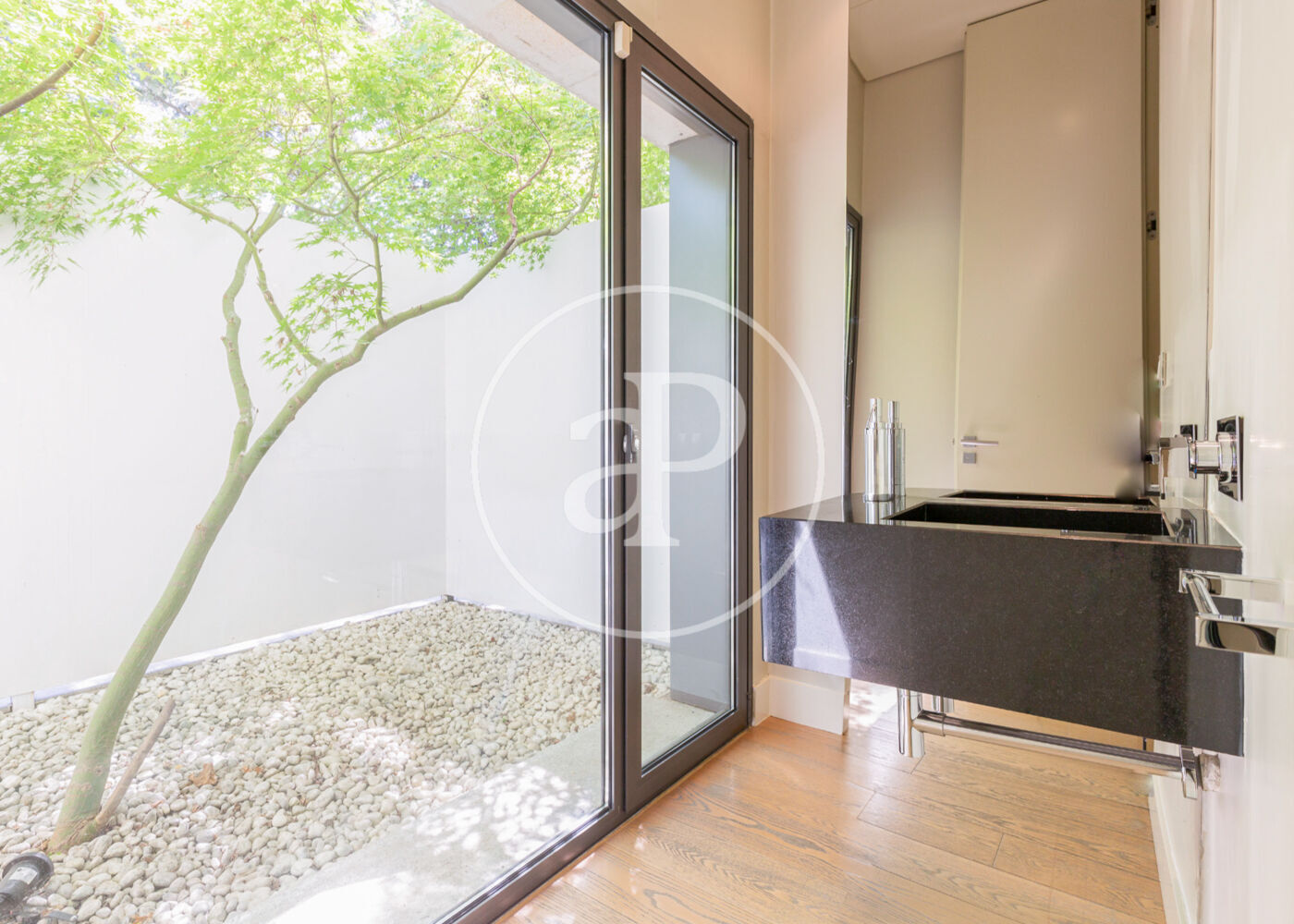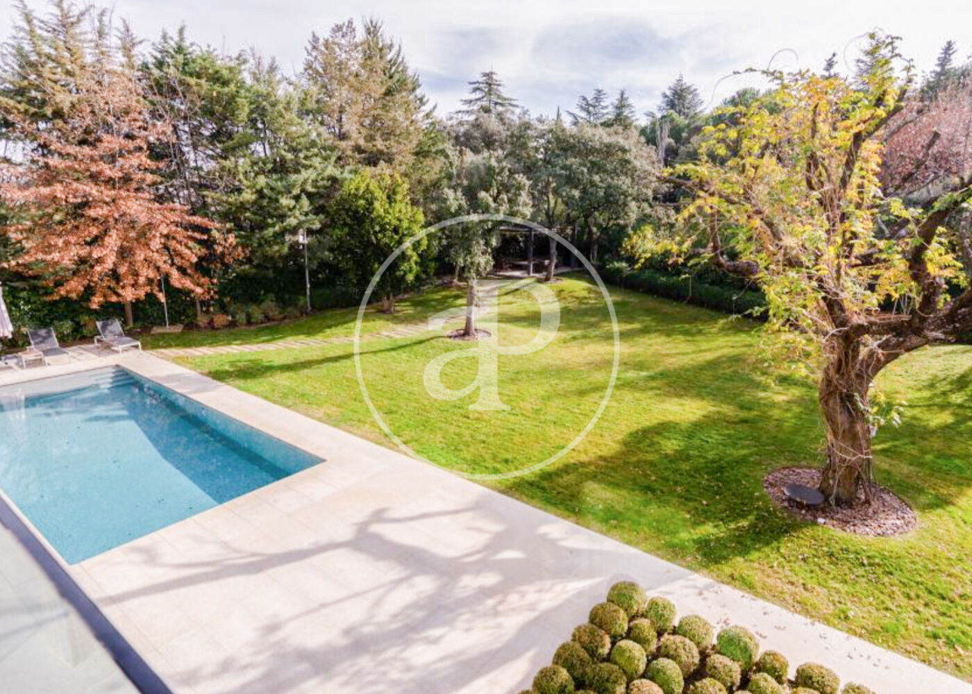 Destaca por sus grandes ventanales, techos altos y jardines ingleses en su interior, que brindan una sensación de conexión con la naturaleza en todas las estancias. La distribución inteligente de la casa comienza en la entrada principal, que conduce a un amplio salón con vistas al hermoso jardín, un comedor, una sala de estar con acceso al porche y los jardines, y una cocina espaciosa con acceso a la planta semisótano, donde se encuentra la zona de servicio. En la primera planta, se encuentra el dormitorio principal con vistas al jardín, una sala de estar acogedora, un amplio vestidor y un baño en suite. Además, hay cuatro dormitorios más con baño en suite y grandes armarios empotrados, todos con hermosas vistas al jardín. El semisótano cuenta con una sala de eventos o cine, un dormitorio de invitados con baño en suite, gimnasio con spa, zona de servicio, garaje y zona de almacenamiento, con la comodidad adicional de un ascensor que conecta todos los niveles de la casa. La propiedad se encuentra en una parcela plana de 2.700 m², con un exquisito diseño del reconocido arquitecto Ignacio Vicens. Dispone de un imponente y elegante salón con vistas al jardín y porche cubierto con piscina, una amplia cocina con acceso al exterior, cinco dormitorios en la planta de descanso, y un sótano con sala de ocio, trasteros, garaje, dormitorio de invitados, zona de lavandería y habitaciones de servicio. El jardín, un verdadero oasis con vegetación variada, ofrece serenidad y privacidad, perfecto para eventos familiares y con amigos. Con una ubicación inmejorable en una tranquila calle sin salida, esta propiedad ofrece una combinación única de diseño contemporáneo, belleza natural y comodidades excepcionales. No pierdas la oportunidad de adquirir esta vivienda de ensueño en una de las mejores zonas residenciales de Madrid. La Moraleja es una urbanización residencial de lujo situada en el municipio de Alcobendas, en la zona norte del área metropolitana de Madrid. Linda con otras urbanizaciones como El Soto de la Moraleja y El Encinar de los Reyes. La Moraleja es una de las urbanizaciones con mayor renta per cápita de toda España. Rodeada de zonas verdes, colegios privados a sus alrededores, seguridad para sus vecinos y a tan solo 20 minutos de Madrid o 15 minutos del aeropuerto, hacen de esta zona un enclave privilegiado para vivir a las afueras de la capital.