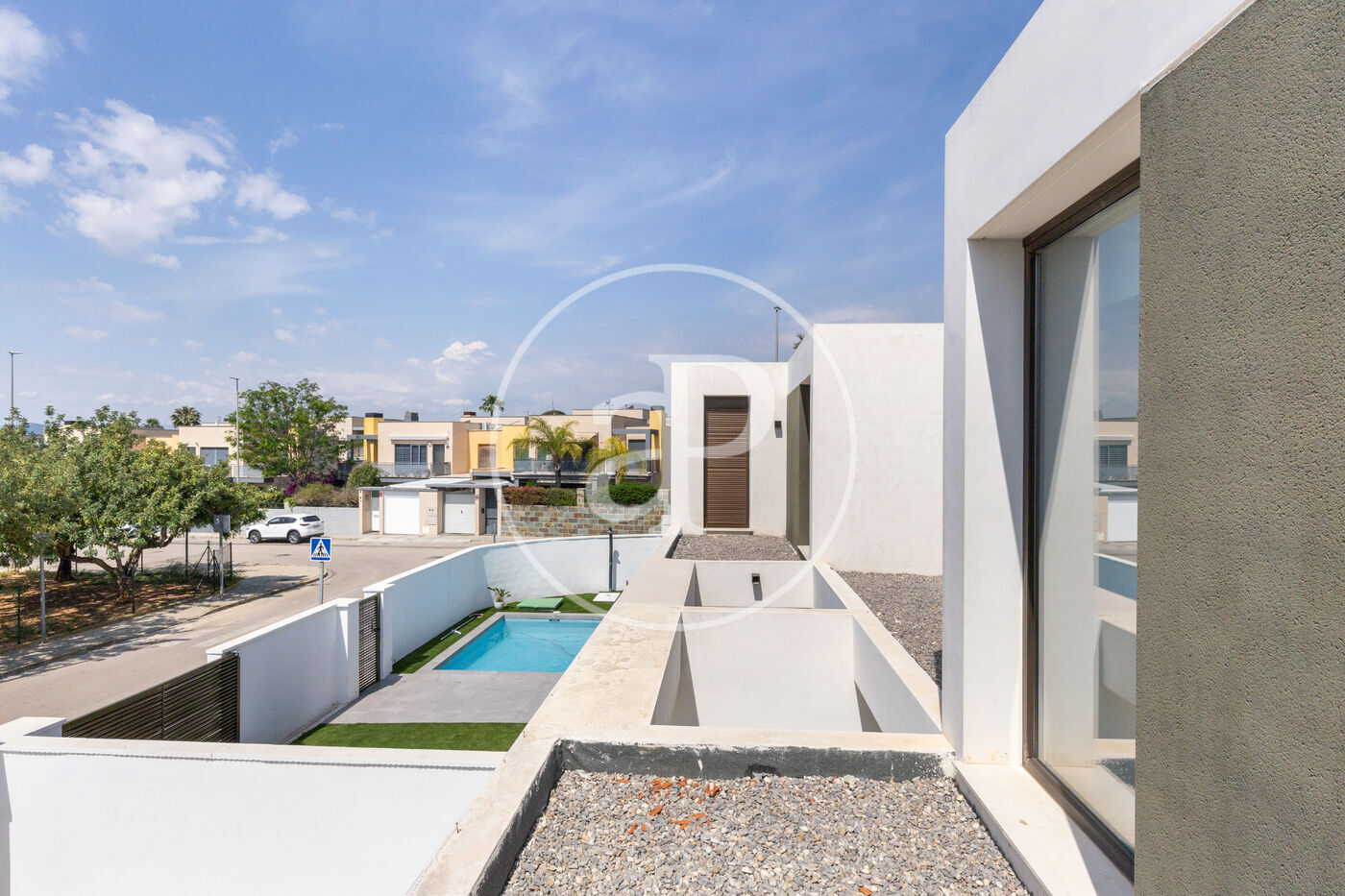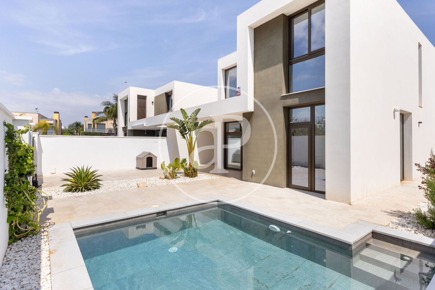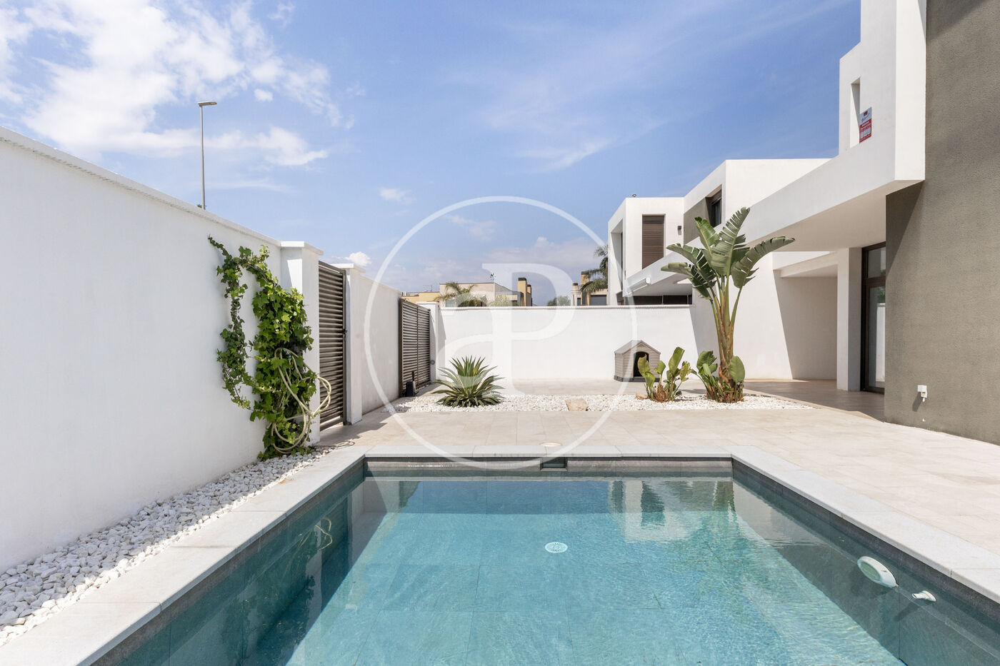 La vivienda está equipada con aire acondicionado, calefacción por aerotermia, armarios empotrados, garaje privado, piscina y un diseño de última generación con acabados de alta calidad.