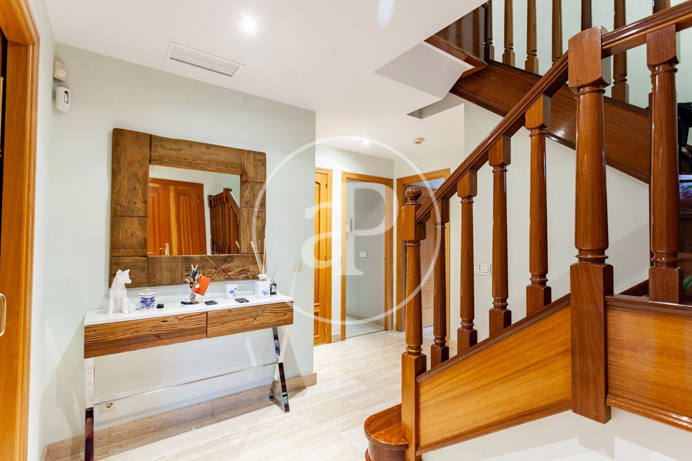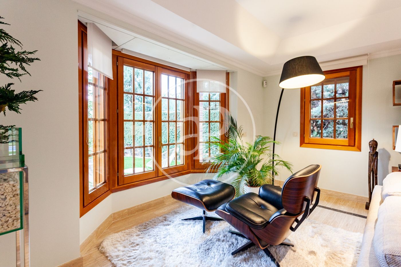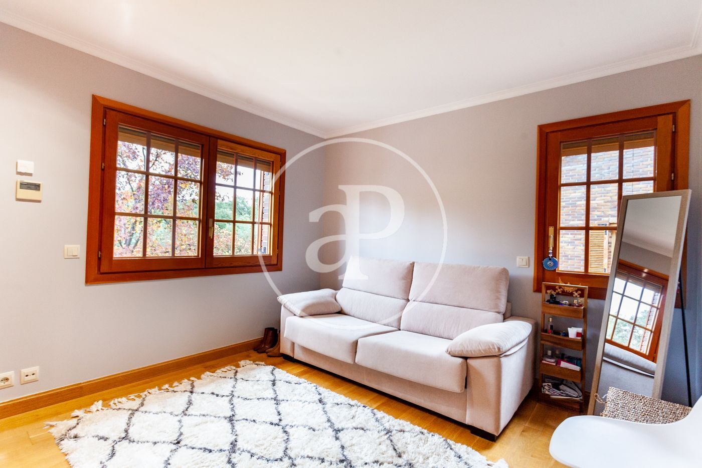 aProperties presenta una excelente casa individual reformada recientemente con una privacidad rodeada de espacios naturales protegidos en una prestigiosa urbanización y muy cercano a zonas comerciales. La planta principal se compone de un amplio y luminoso salón-comedor con chimenea francesa, con salida al porche y la piscina con calentador, una amplia cocina totalmente reformada, con office y despensa. Además, cuenta con una habitación habilitada como despacho y aseo de cortesía. En la planta superior se halla el espacioso dormitorio principal con vestidor, baño en suite y terraza, un dormitorio con baño en suite que comparte terraza con el principal y otros dos dormitorios con baño completo. La planta baja, con luz natural gracias a un patio inglés, dispone de cuarto de servicio con baño completo, zona de lavado y plancha, y un gran garaje para tres vehículos, trastero y una gran sala destinada como gimnasio. Jardín cuidado al detalle con riego por aspersores y goteo programado e iluminación. Grandes zonas comunes en plena naturaleza llenas de encinas rodean la urbanización que cuenta además con pistas de pádel y tenis. La casa dispone de armarios empotrados en todas los dormitorios, persianas eléctricas, luces led, fibra óptica, aire acondicionado central, suelo radiante y control de temperatura en cada estancia. Situado en urbanización privada con vigilancia y seguridad permanente 24 h. Muy bien comunicada con autobuses interurbanos, a 20 minutos de Madrid, varias estaciones de cercanías, acceso directo a la M-50, A-6, con colegios internacionales y zonas comerciales (Las Rozas Village, Heron City, Gran Plaza), supermercados muy próximos, y el Hospital Puerta de Hierro a 5 minutos.
