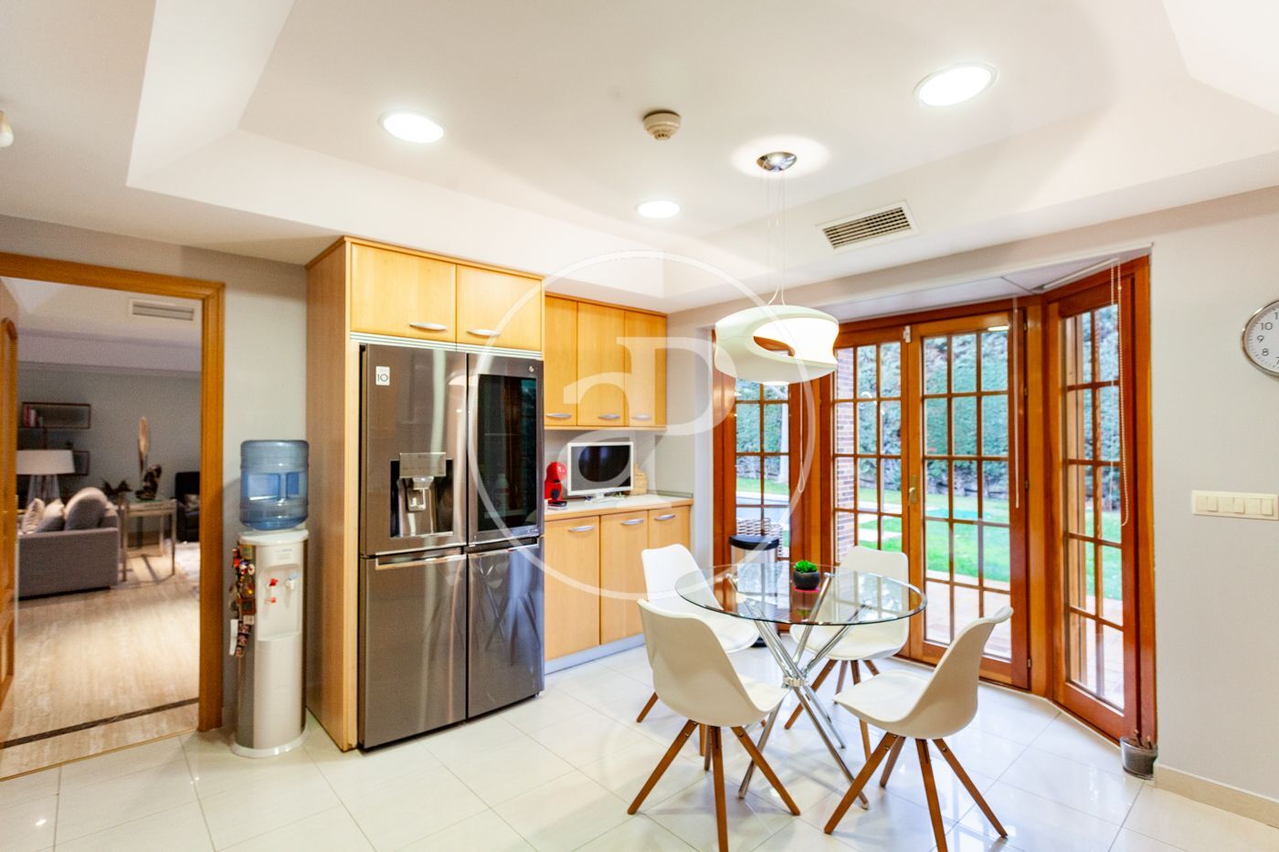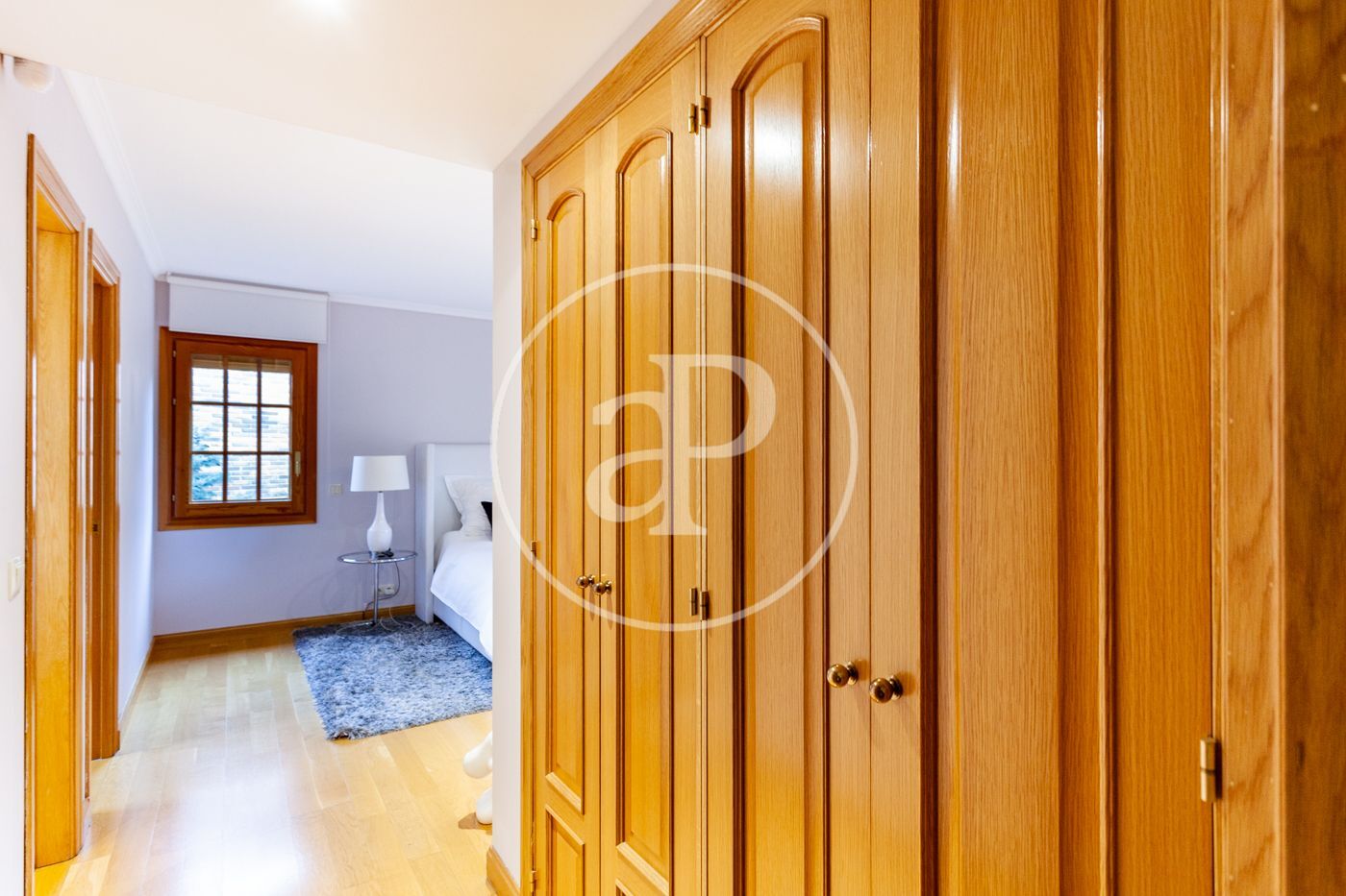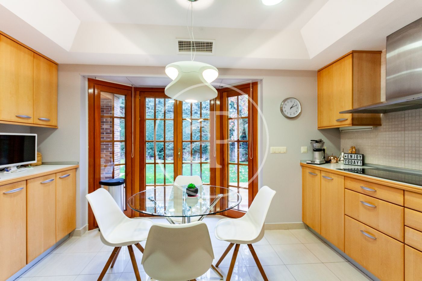 aProperties presenta una excelente casa individual reformada recientemente con una privacidad rodeada de espacios naturales protegidos en una prestigiosa urbanización y muy cercano a zonas comerciales. La planta principal se compone de un amplio y luminoso salón-comedor con chimenea francesa, con salida al porche y la piscina con calentador, una amplia cocina totalmente reformada, con office y despensa. Además, cuenta con una habitación habilitada como despacho y aseo de cortesía. En la planta superior se halla el espacioso dormitorio principal con vestidor, baño en suite y terraza, un dormitorio con baño en suite que comparte terraza con el principal y otros dos dormitorios con baño completo. La planta baja, con luz natural gracias a un patio inglés, dispone de cuarto de servicio con baño completo, zona de lavado y plancha, y un gran garaje para tres vehículos, trastero y una gran sala destinada como gimnasio. Jardín cuidado al detalle con riego por aspersores y goteo programado e iluminación. Grandes zonas comunes en plena naturaleza llenas de encinas rodean la urbanización que cuenta además con pistas de pádel y tenis. La casa dispone de armarios empotrados en todas los dormitorios, persianas eléctricas, luces led, fibra óptica, aire acondicionado central, suelo radiante y control de temperatura en cada estancia. Situado en urbanización privada con vigilancia y seguridad permanente 24 h. Muy bien comunicada con autobuses interurbanos, a 20 minutos de Madrid, varias estaciones de cercanías, acceso directo a la M-50, A-6, con colegios internacionales y zonas comerciales (Las Rozas Village, Heron City, Gran Plaza), supermercados muy próximos, y el Hospital Puerta de Hierro a 5 minutos.
