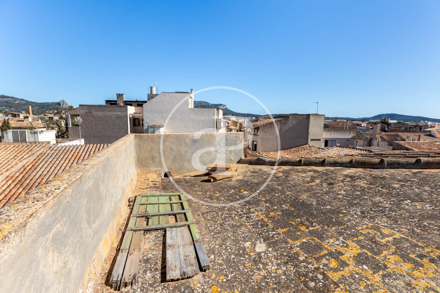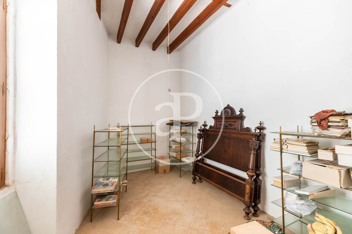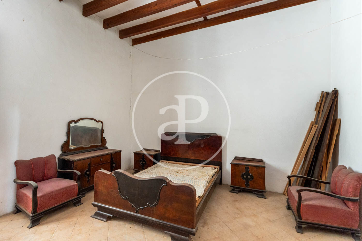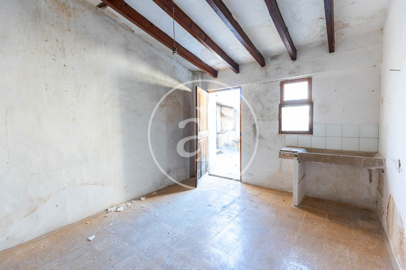 Con entrada a los dos lados de la calle. Con sus techos altos con arcos y bigas de madera. Por su gran tamaño lo han dividido en dos unidades independientes. Una de ellas está renovada y tiene acceso a través de una fabulosa escalera mallorquina. Esta parte renovada consta de un salón comedor con cocina amueblada, dos dormitorios, baño y parking. Puede habitarse ya y se podría alquilar inmediatamente.