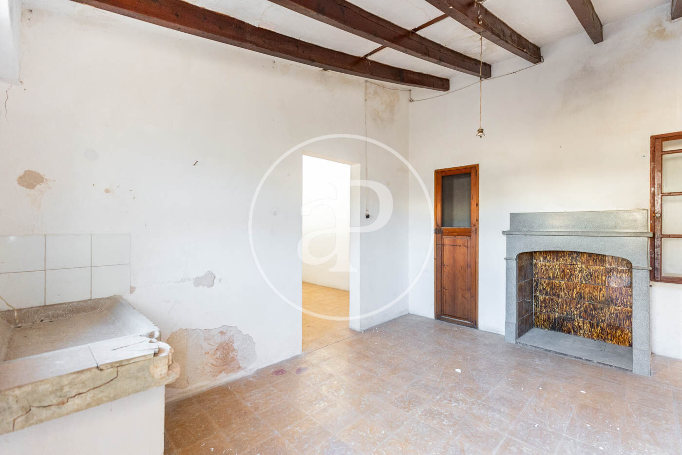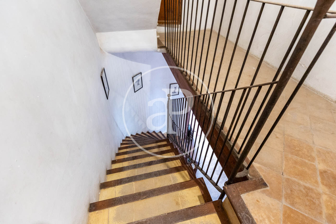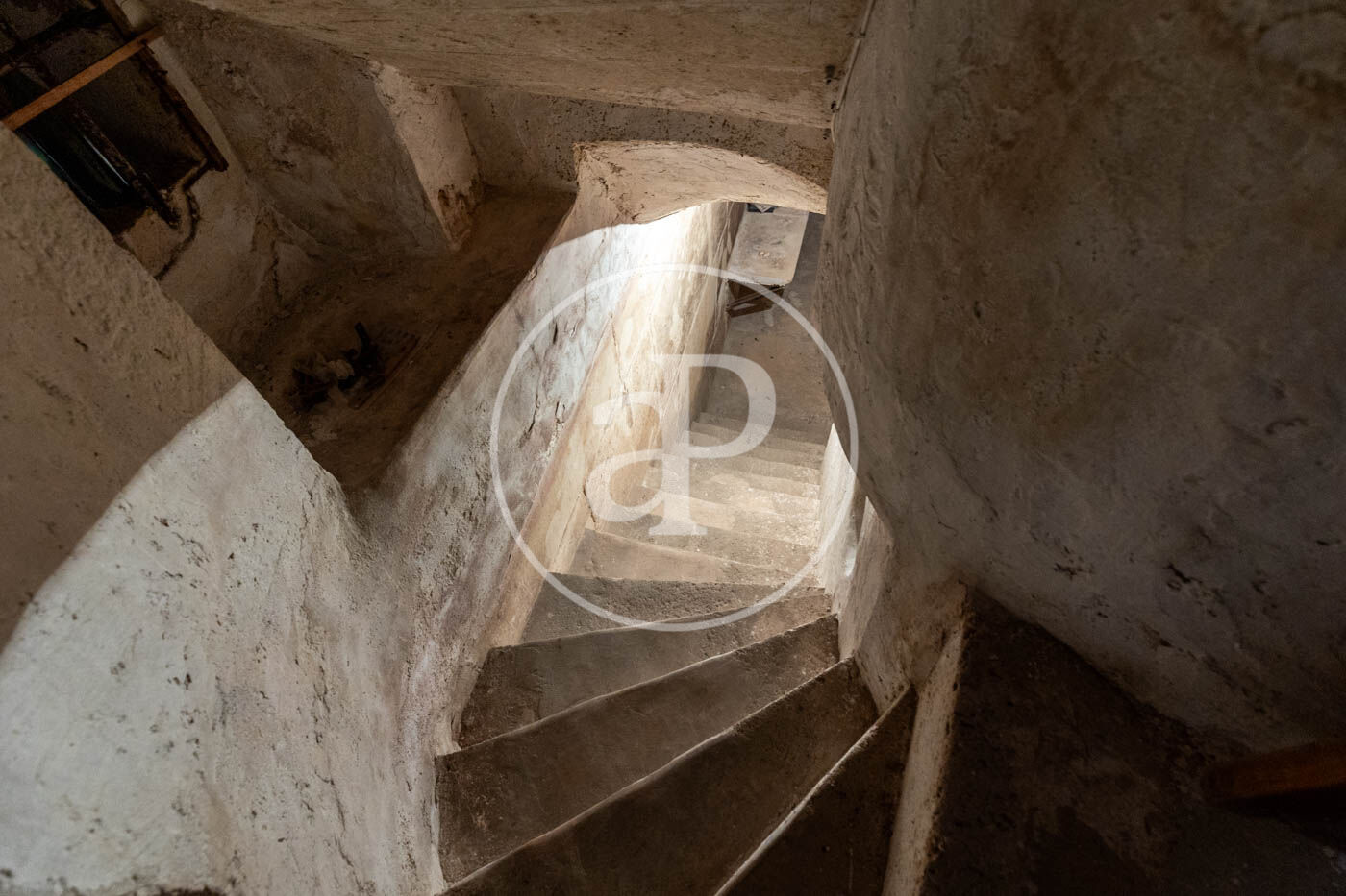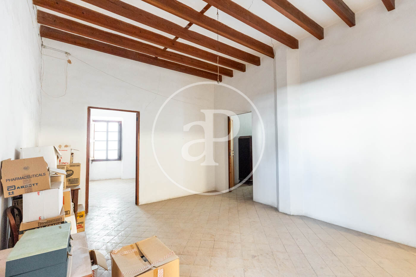 Con entrada a los dos lados de la calle. Con sus techos altos con arcos y bigas de madera. Por su gran tamaño lo han dividido en dos unidades independientes. Una de ellas está renovada y tiene acceso a través de una fabulosa escalera mallorquina. Esta parte renovada consta de un salón comedor con cocina amueblada, dos dormitorios, baño y parking. Puede habitarse ya y se podría alquilar inmediatamente.