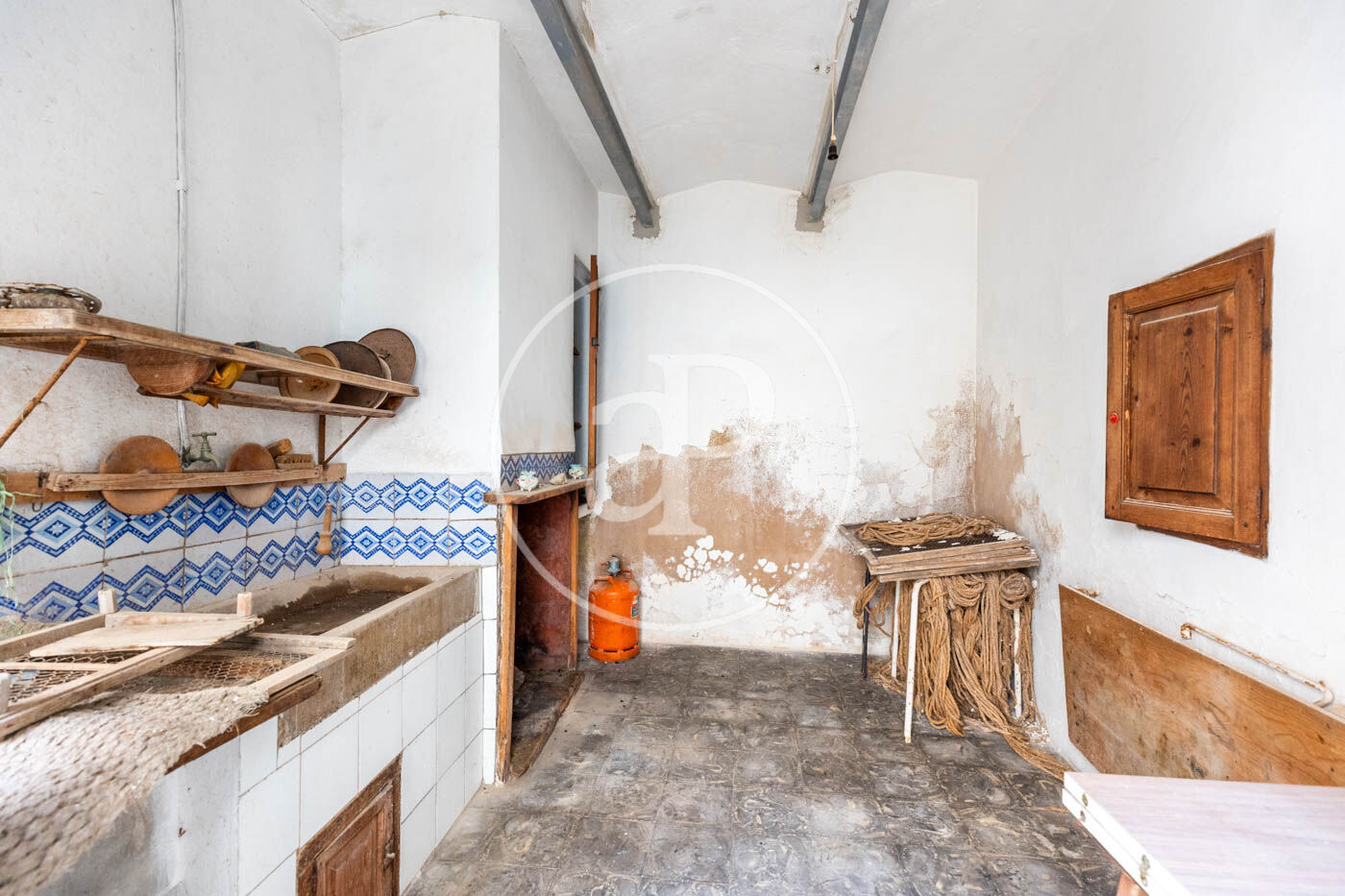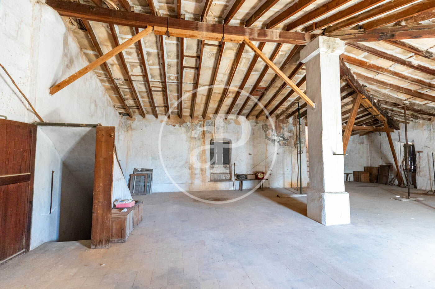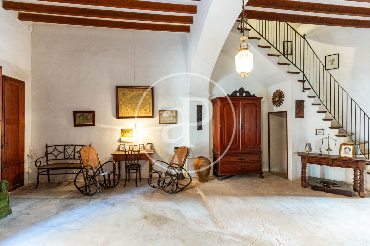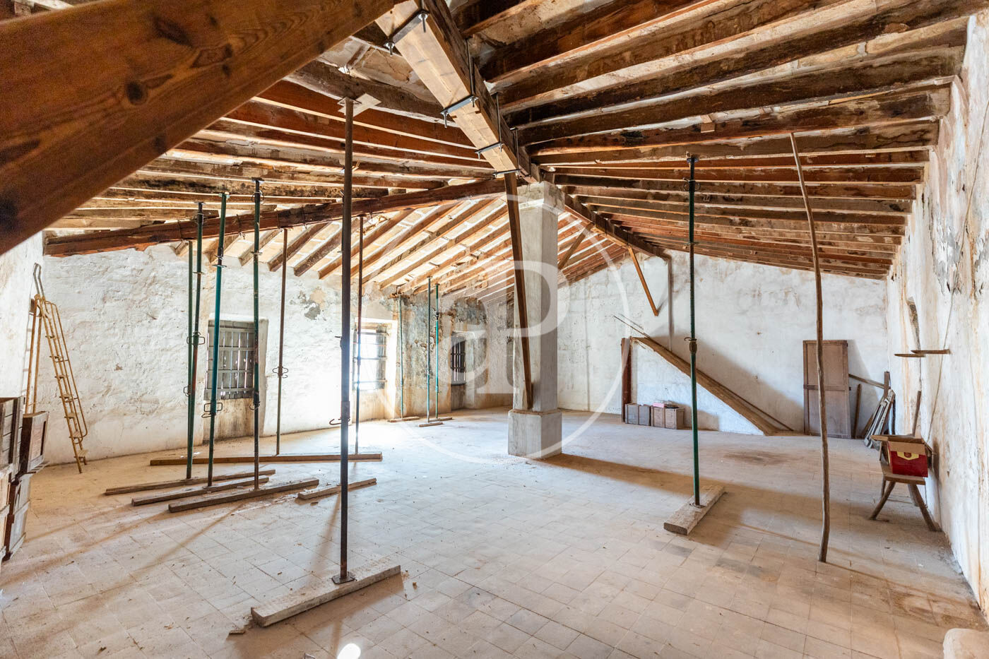 Con entrada a los dos lados de la calle. Con sus techos altos con arcos y bigas de madera. Por su gran tamaño lo han dividido en dos unidades independientes. Una de ellas está renovada y tiene acceso a través de una fabulosa escalera mallorquina. Esta parte renovada consta de un salón comedor con cocina amueblada, dos dormitorios, baño y parking. Puede habitarse ya y se podría alquilar inmediatamente.