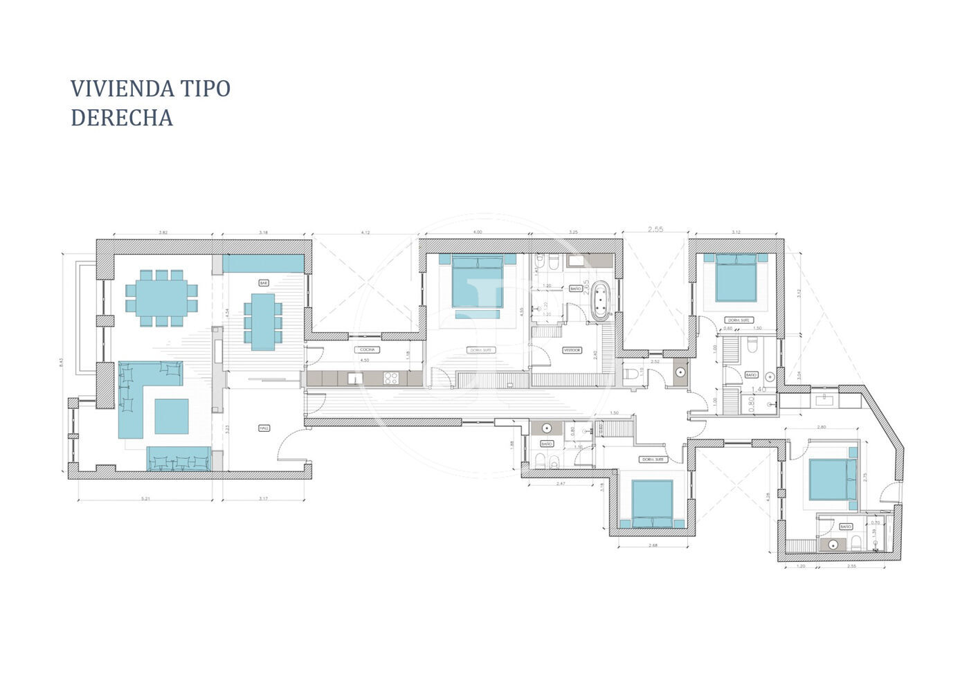 Todas las viviendas son exteriores, con orientación este, y cuentan con balcones y ventanas de suelo a techo con vistas a Paseo de la Castellana. Disponen de acceso principal y acceso de servicio, con la posibilidad de hacer un dormitorio o incluso apartamento de servicio. La rehabilitación ha recuperado detalles clásicos como los balcones, los radiadores de hierro y las hermosas molduras de los techos. Se han mantenido además las grandes alturas de 3.30 m de altura libre, lo que ayuda maximizar la amplitud de espacios y la cantidad de luz natural. Existen 2 tipologías de vivienda, tipo izquierda, con 3 dormitorios en suit más zona de family room; y tipo derecha, con 4 dormitorios en suit. Todas las viviendas cuentan además con un amplio hall de acceso, salón, comedor, cocina independiente, zona office para conexión entre cocina y comedor, aseo de visitas y lavandería.