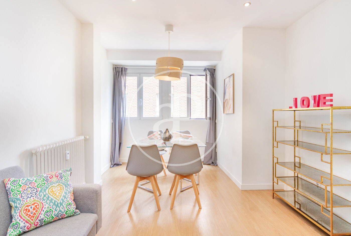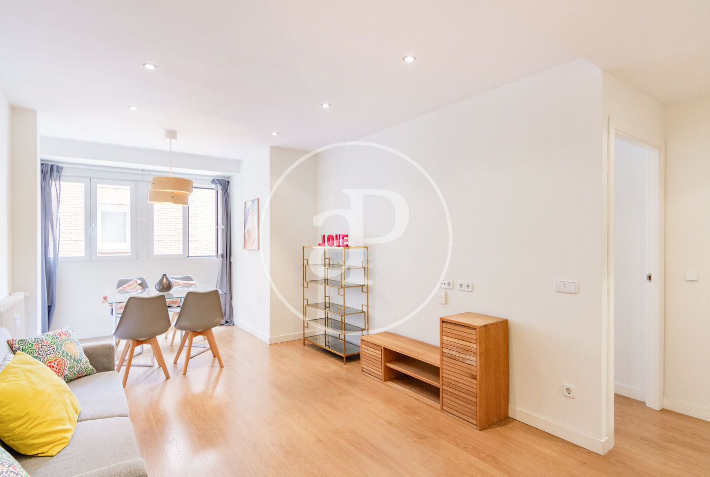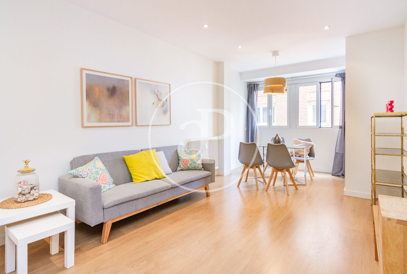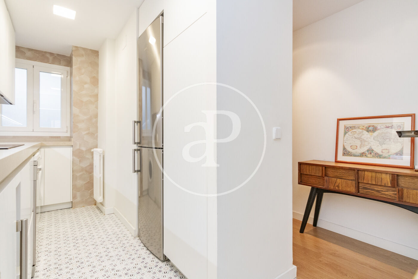 Aproperties presenta precioso piso reformado en Almagro, en la bonita calle de Zurbarán, ubicado en un señorial edificio con un precioso y amplio lobby. Se trata de una tercera planta interior con mucha luz que da a un patio de manzana con vistas a un precioso jardín de diseño. Su superficie es de 89 m2 construidos, según catastro. La zona de día se distribuye en hall de entrada con armario gabanero, amplio salón- comedor con bonita cocina semi-integrada. La zona de noche la componen dos dormitorios dobles con armarios empotrados y una alegre baño completo. El piso se ha reformado recientemente, es tranquilo y con mucha luz . Cuenta con aire acondicionado por split en varias estancias así como calefacción a gas central con contadores individuales. El edificio dispone de garaje en finca con acceso directo por ascensor en el que habitualmente se pueden alquilar o comprar plazas de garaje, no incluidas en el precio.