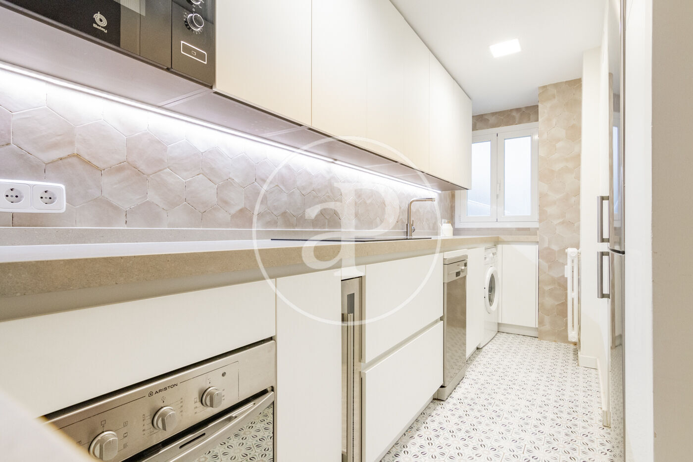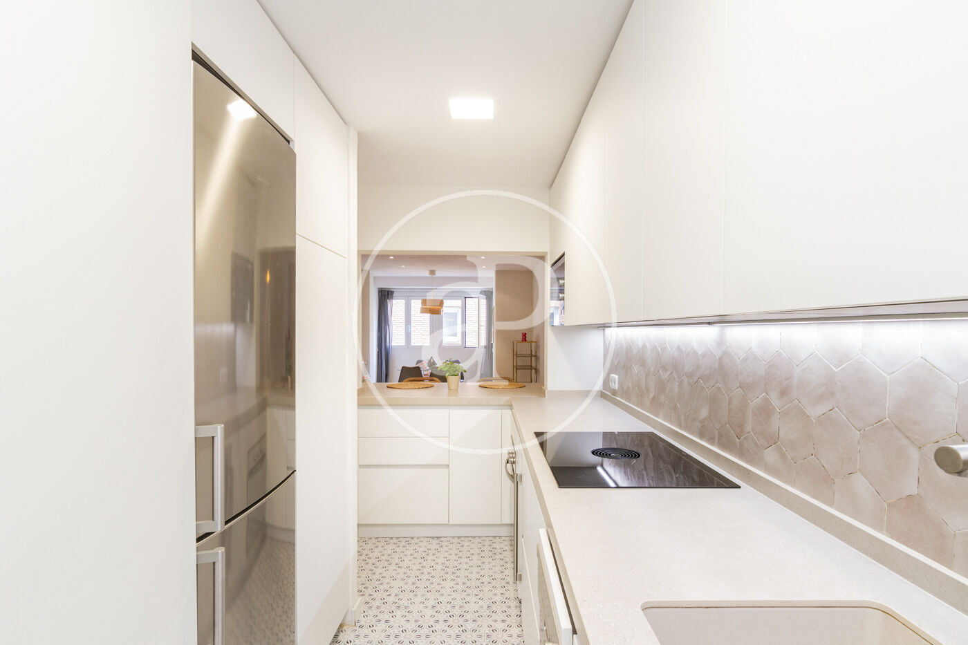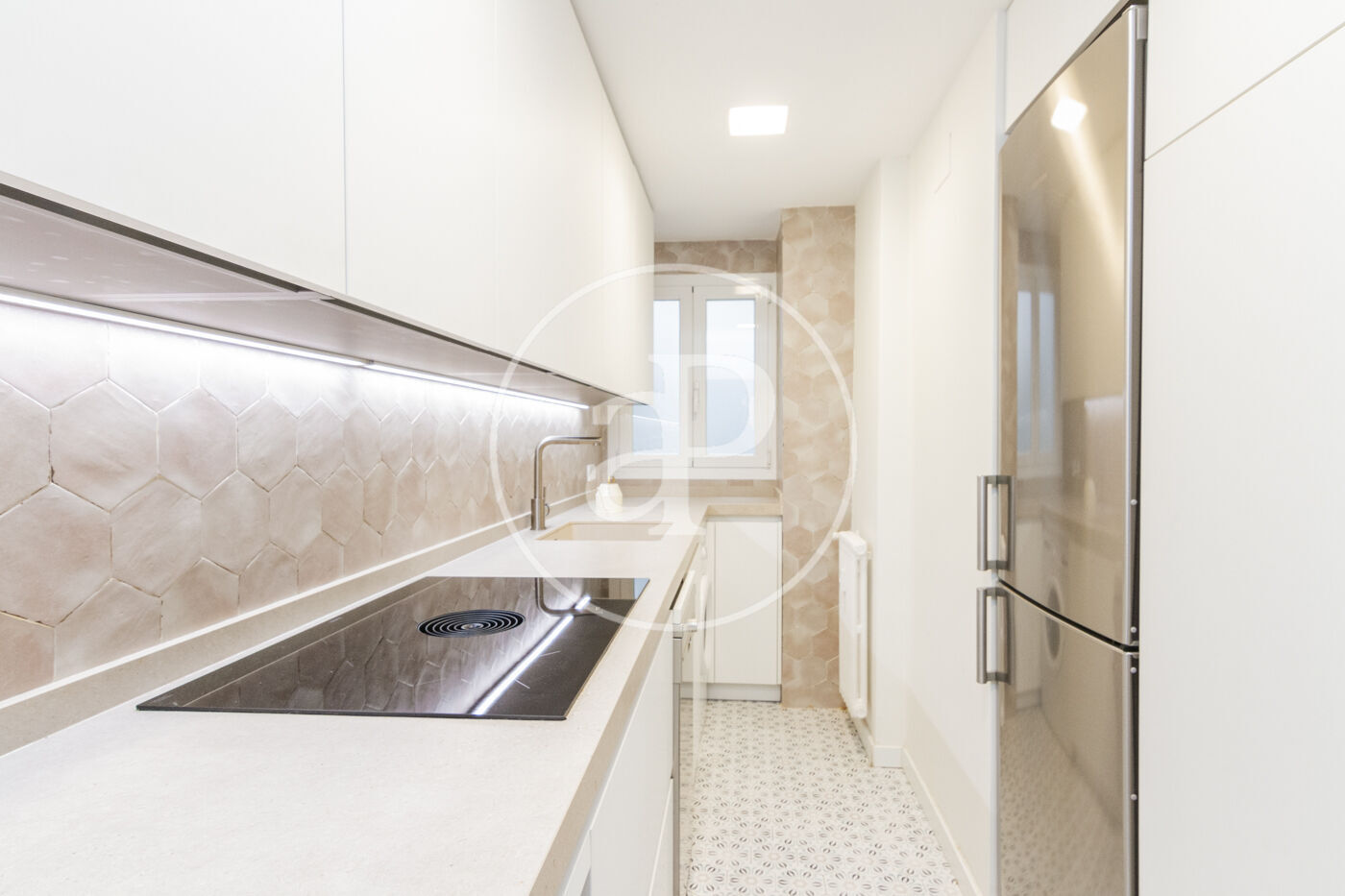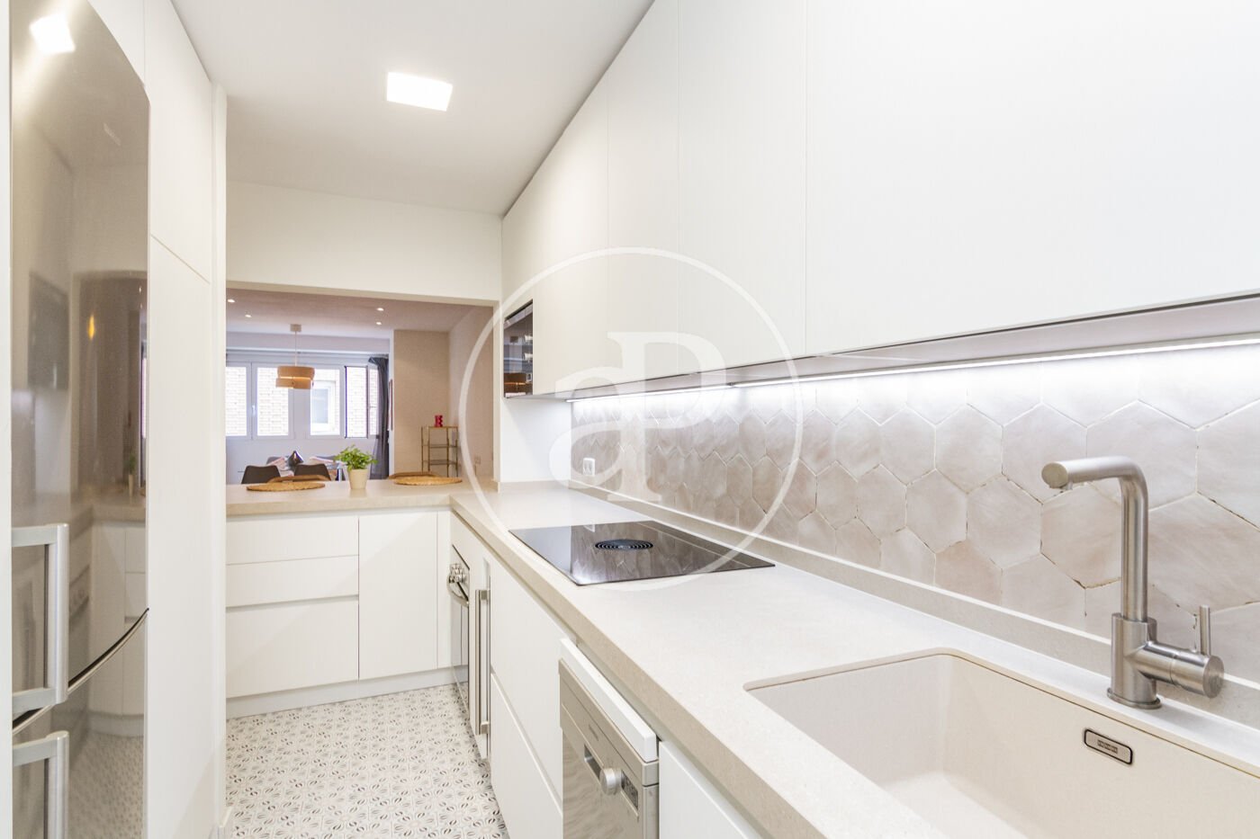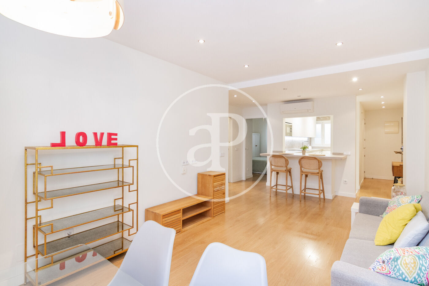 Aproperties presenta precioso piso reformado en Almagro, en la bonita calle de Zurbarán, ubicado en un señorial edificio con un precioso y amplio lobby. Se trata de una tercera planta interior con mucha luz que da a un patio de manzana con vistas a un precioso jardín de diseño. Su superficie es de 89 m2 construidos, según catastro. La zona de día se distribuye en hall de entrada con armario gabanero, amplio salón- comedor con bonita cocina semi-integrada. La zona de noche la componen dos dormitorios dobles con armarios empotrados y una alegre baño completo. El piso se ha reformado recientemente, es tranquilo y con mucha luz . Cuenta con aire acondicionado por split en varias estancias así como calefacción a gas central con contadores individuales. El edificio dispone de garaje en finca con acceso directo por ascensor en el que habitualmente se pueden alquilar o comprar plazas de garaje, no incluidas en el precio.