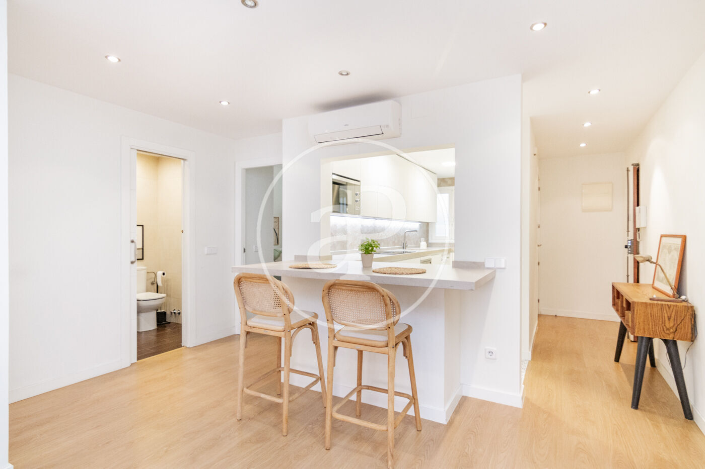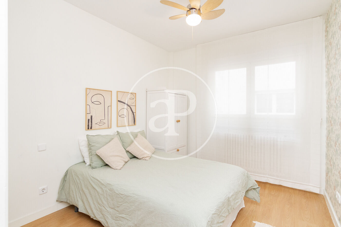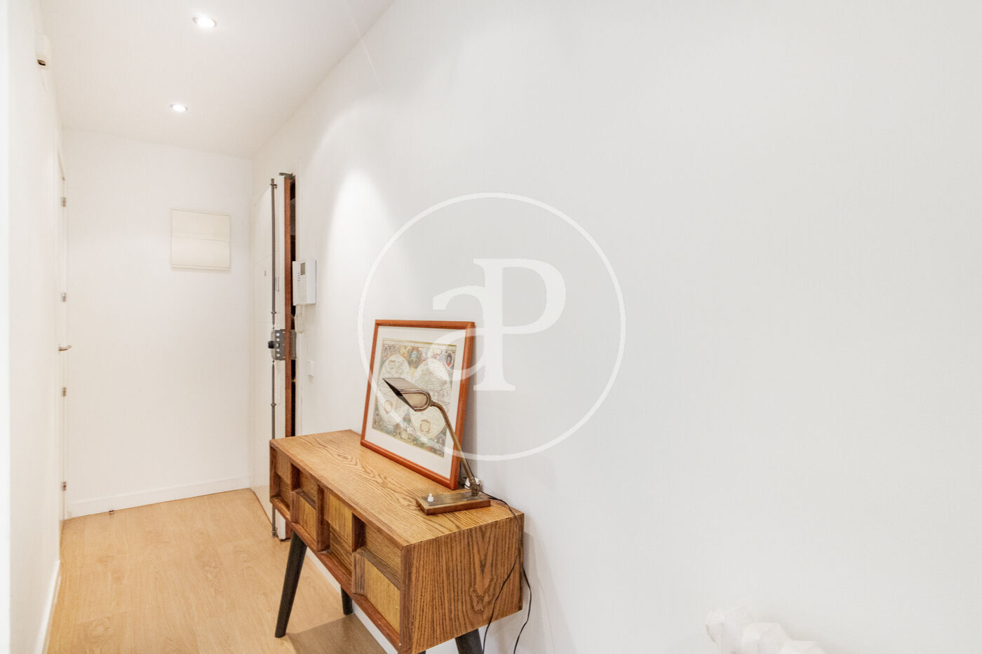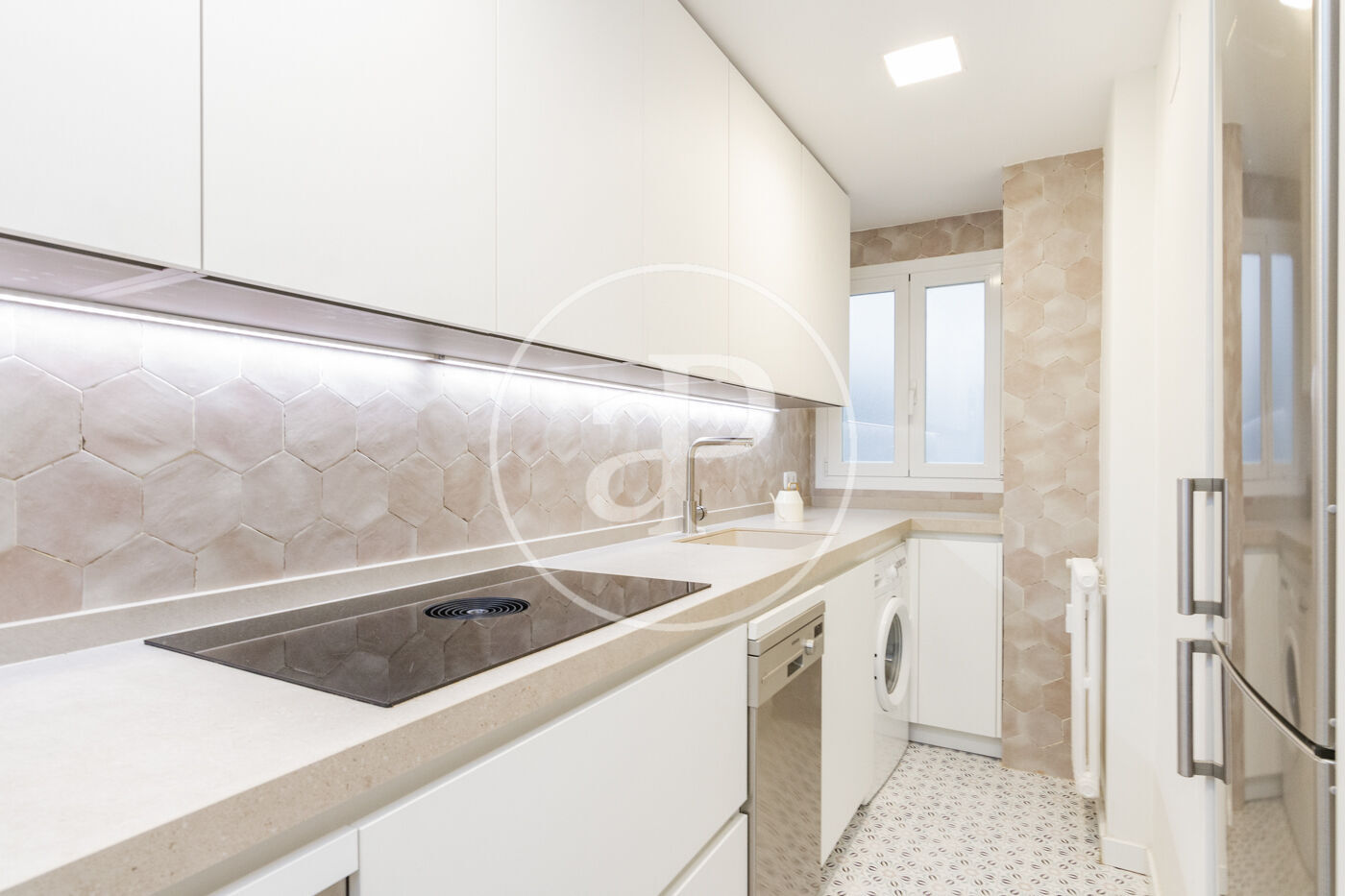 Aproperties presenta precioso piso reformado en Almagro, en la bonita calle de Zurbarán, ubicado en un señorial edificio con un precioso y amplio lobby. Se trata de una tercera planta interior con mucha luz que da a un patio de manzana con vistas a un precioso jardín de diseño. Su superficie es de 89 m2 construidos, según catastro. La zona de día se distribuye en hall de entrada con armario gabanero, amplio salón- comedor con bonita cocina semi-integrada. La zona de noche la componen dos dormitorios dobles con armarios empotrados y una alegre baño completo. El piso se ha reformado recientemente, es tranquilo y con mucha luz . Cuenta con aire acondicionado por split en varias estancias así como calefacción a gas central con contadores individuales. El edificio dispone de garaje en finca con acceso directo por ascensor en el que habitualmente se pueden alquilar o comprar plazas de garaje, no incluidas en el precio.