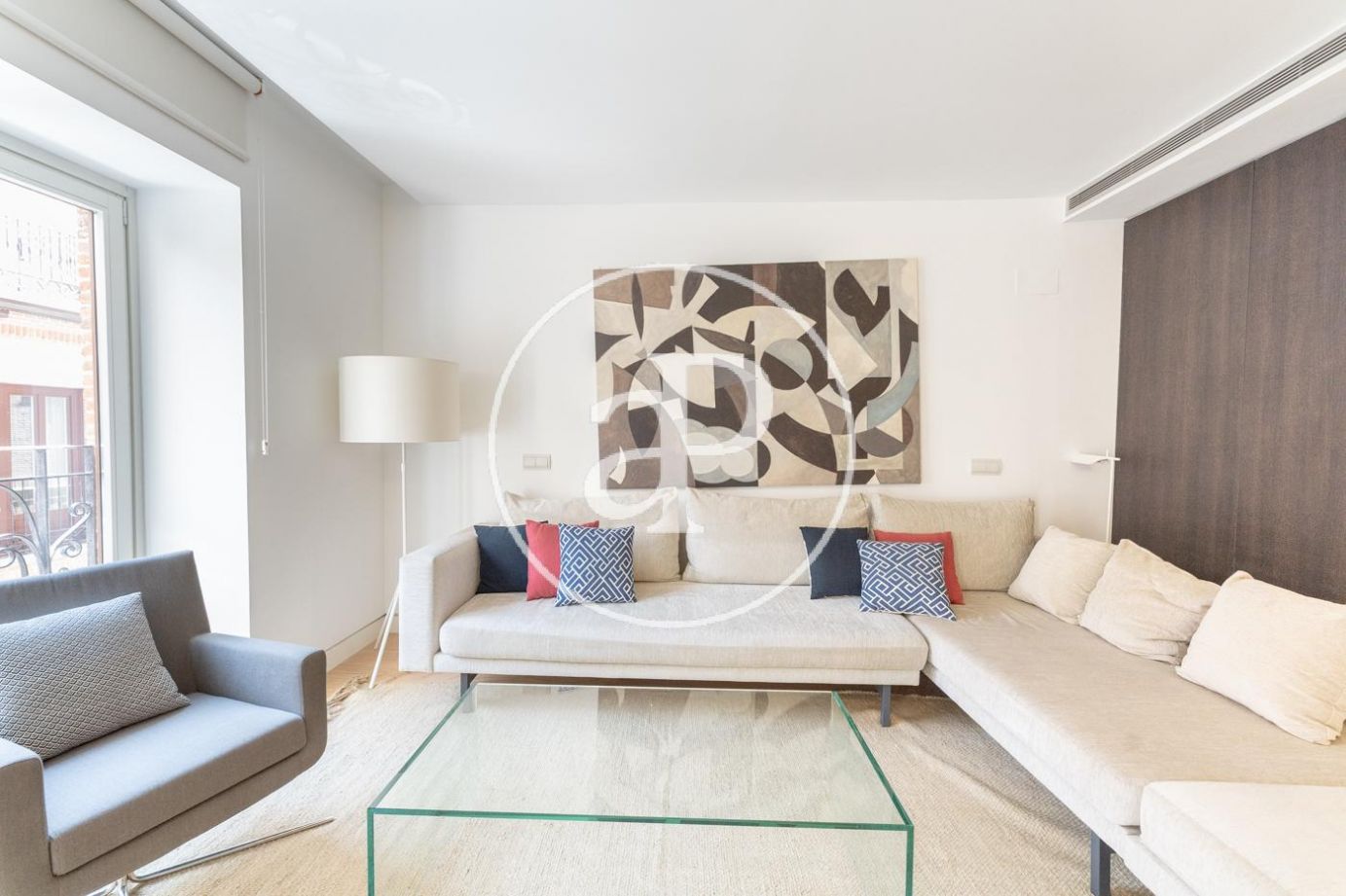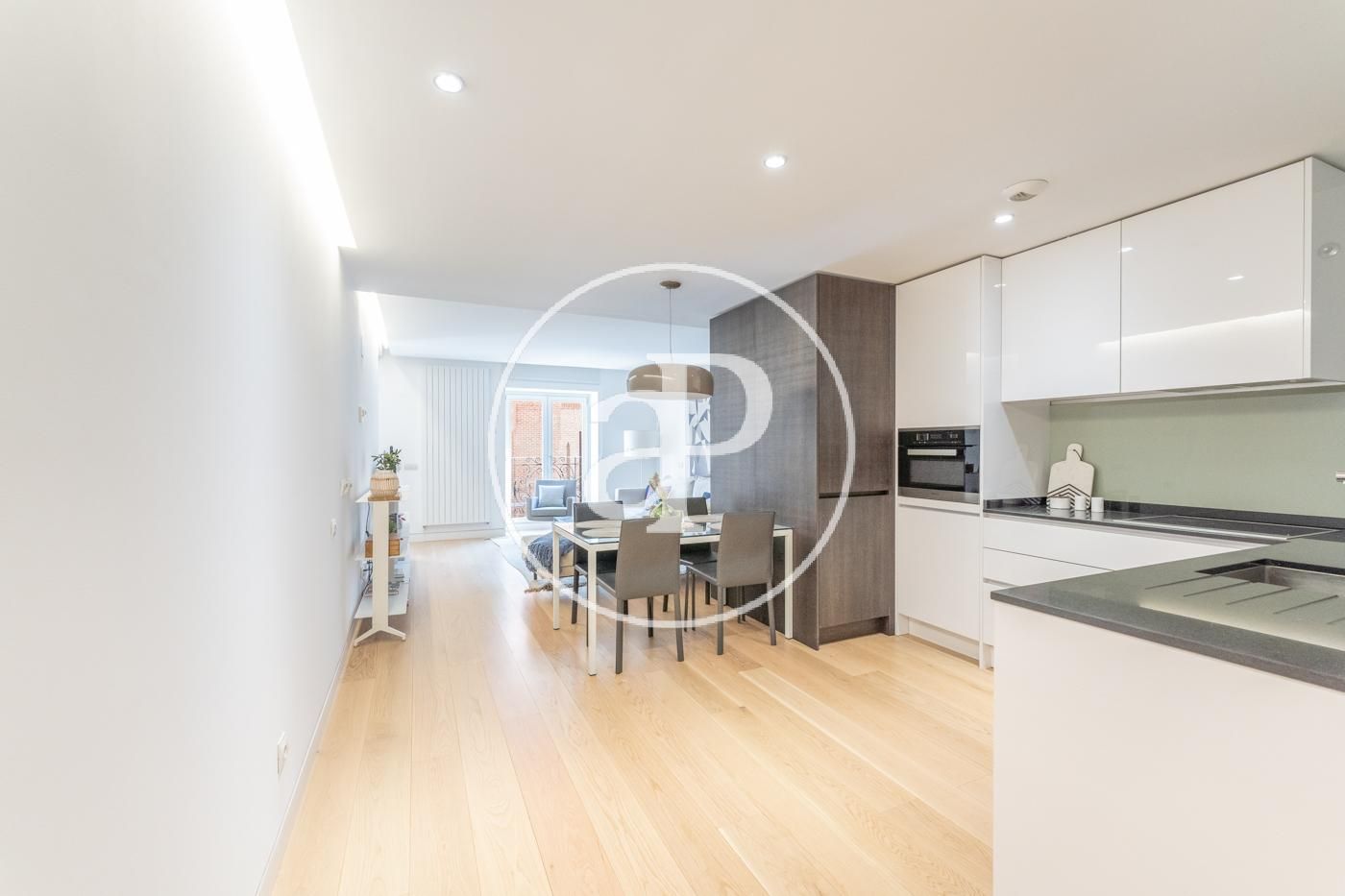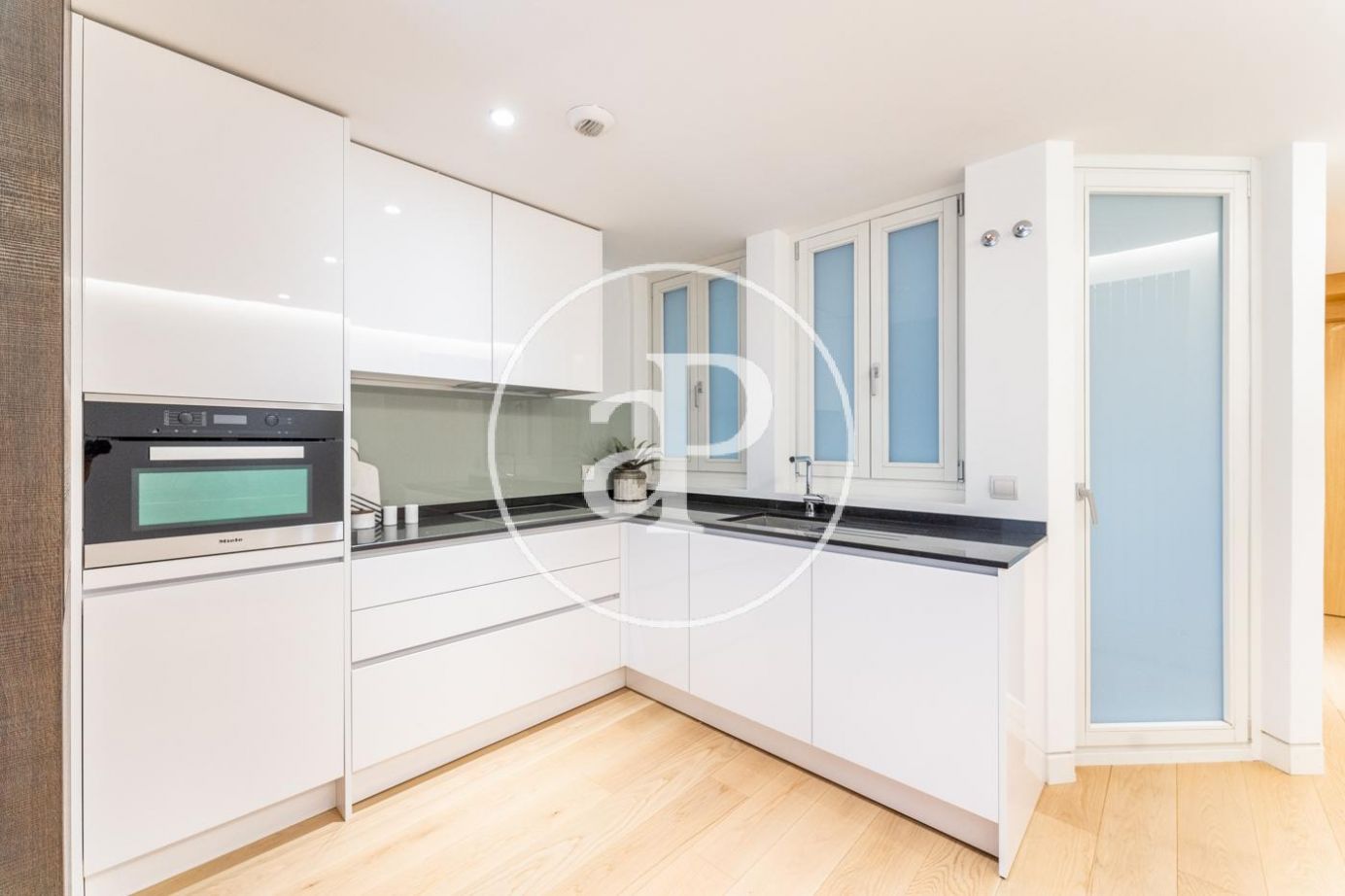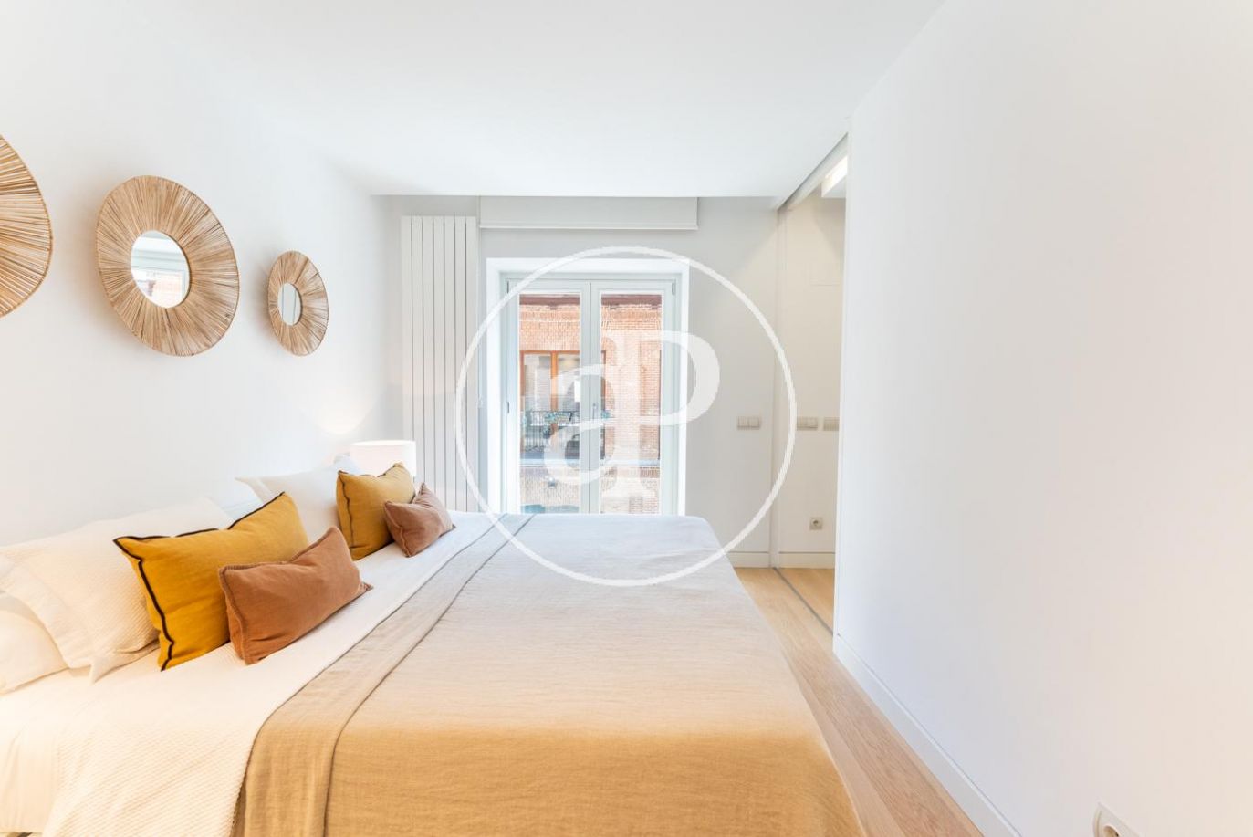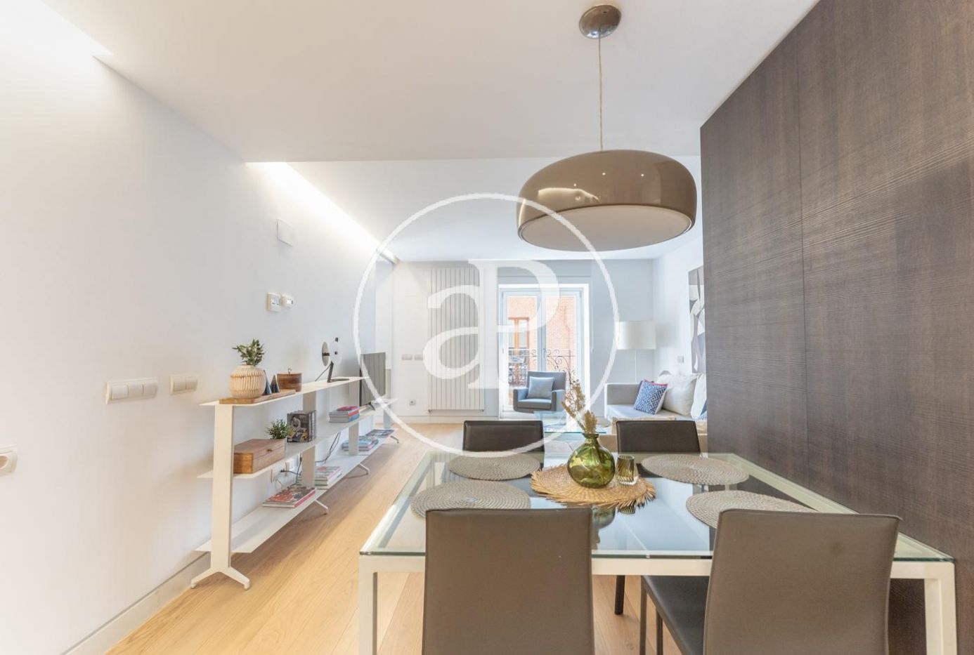 El piso de 92 metros cuadrados construidos se distribuye desde la entrada en la que tiene un gran armario empotrado. Seguidamente, encontramos la cocina, con electrodomésticos panelados AEG de alta gama. El piso dispone de una mesa de 4 comensales que divide la zona de día en dos ambientes. Por un lado, la cocina abierta y por el otro el salón, muy luminoso gracias a su gran ventanal y con vistas a un amplio patio de manzana, muy tranquilo. Desde el salón se accede al dormitorio, con cama doble y baño en suite con ducha; también con buena iluminación natural. La vivienda cuenta con ventanas con doble acristalamiento, calefacción central regulable individualmente y aire acondicionado por conductos en todas las estancias. La finca dispone de gimnasio, conserje de día, ascensor y opción de alquilar plaza de garaje con acceso directo al piso por 200 € adicionales. En el precio están incluidos los suministros de agua, luz, calefacción e internet de cortesía. El piso se encuentra en el emblemático barrio de Almagro en la conocida calle Génova, en finca con fachada clásica, pero con reforma integral tanto en zonas comunes como en las viviendas. Ubicación excepcional por encontrarse a un paso del Paseo de la Castellana, bien comunicada por el transporte público y cercana a multitud de comercios y restaurantes. DISPONIBLE A PRINCIPIOS DE MARZO DE 2022.