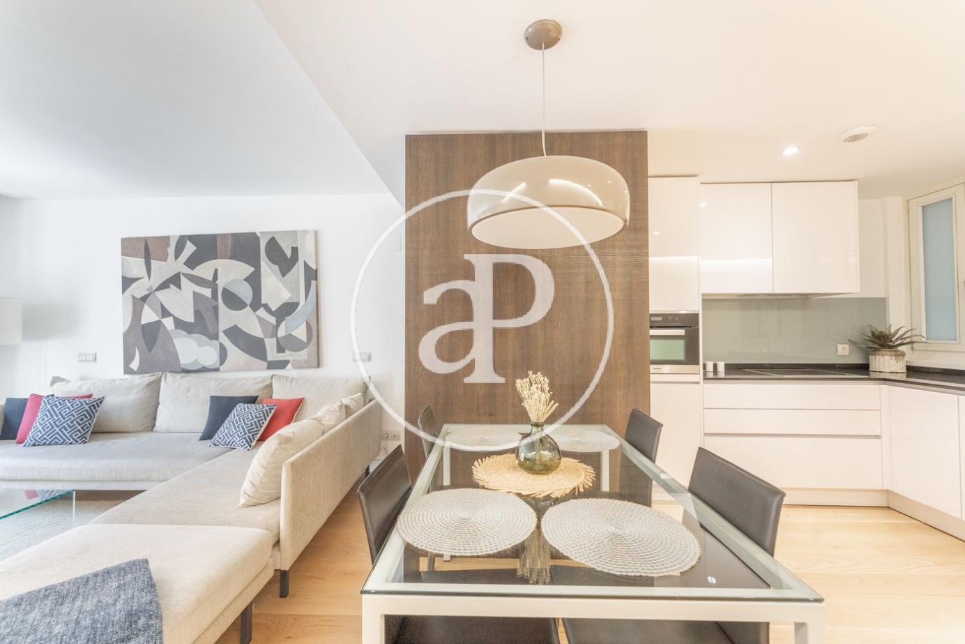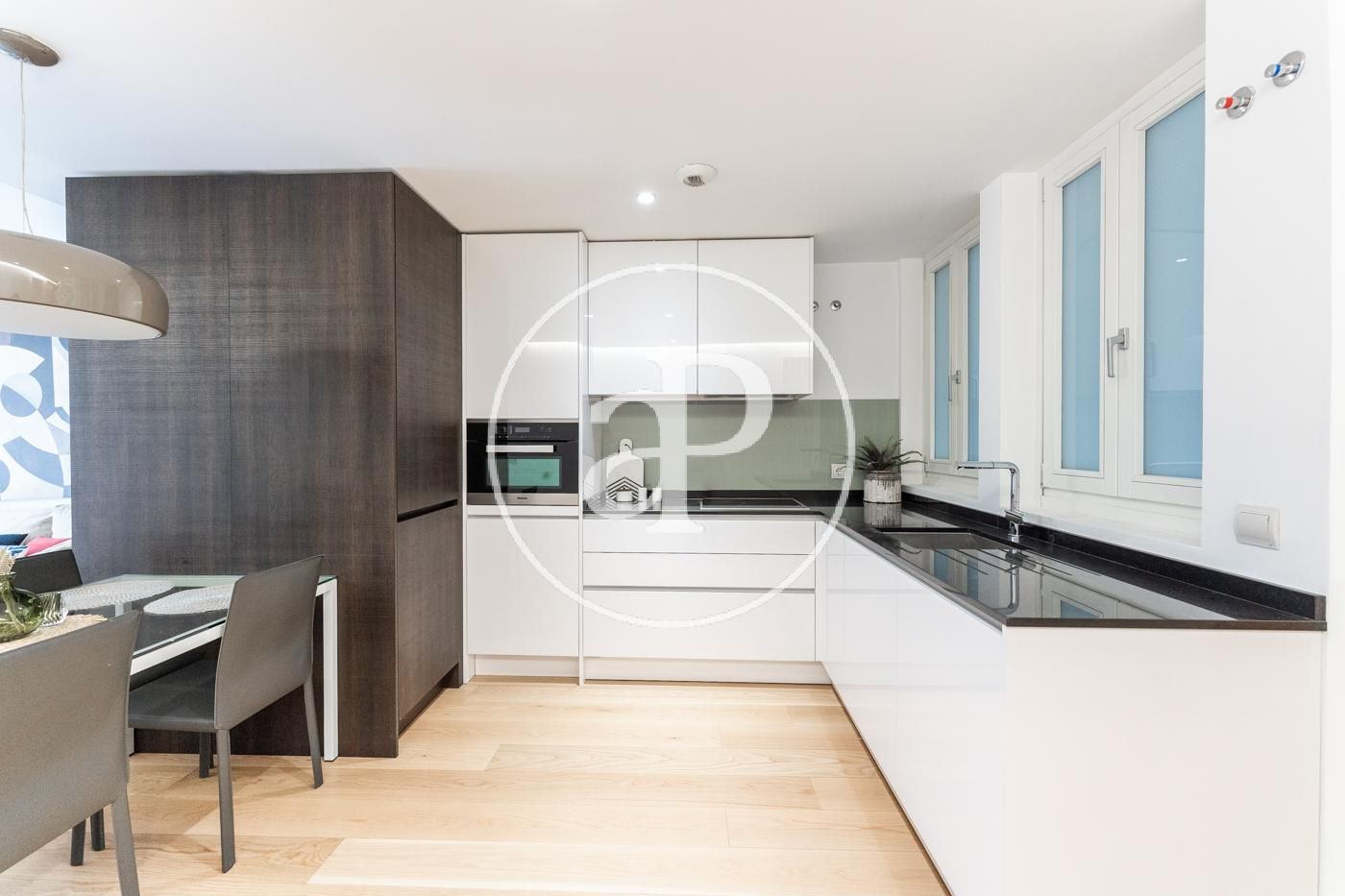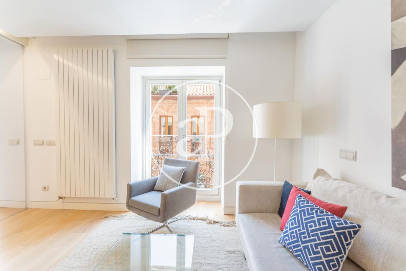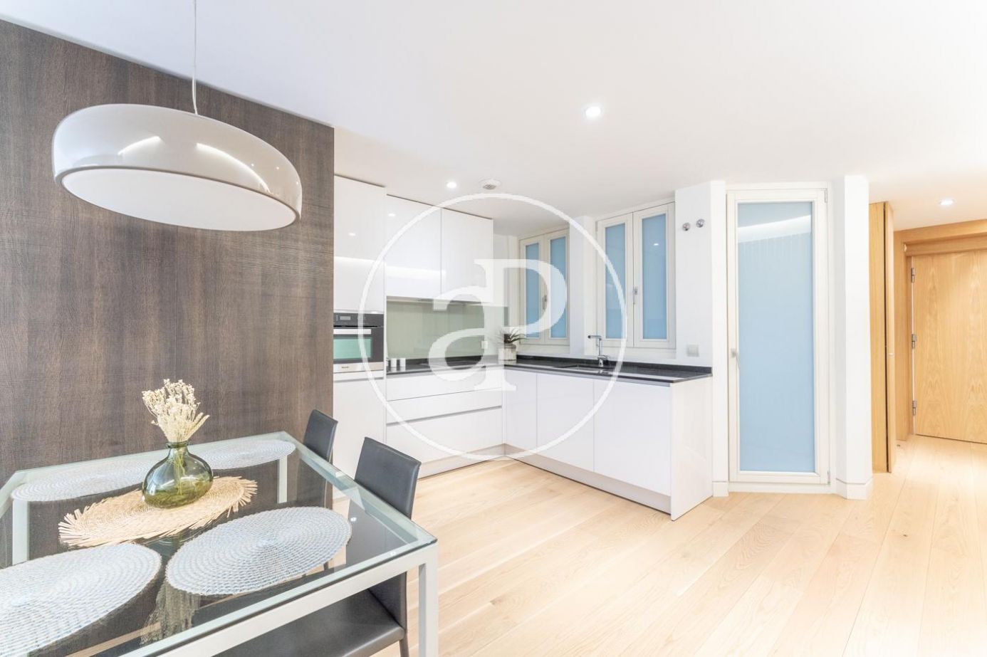 El piso de 92 metros cuadrados construidos se distribuye desde la entrada en la que tiene un gran armario empotrado. Seguidamente, encontramos la cocina, con electrodomésticos panelados AEG de alta gama. El piso dispone de una mesa de 4 comensales que divide la zona de día en dos ambientes. Por un lado, la cocina abierta y por el otro el salón, muy luminoso gracias a su gran ventanal y con vistas a un amplio patio de manzana, muy tranquilo. Desde el salón se accede al dormitorio, con cama doble y baño en suite con ducha; también con buena iluminación natural. La vivienda cuenta con ventanas con doble acristalamiento, calefacción central regulable individualmente y aire acondicionado por conductos en todas las estancias. La finca dispone de gimnasio, conserje de día, ascensor y opción de alquilar plaza de garaje con acceso directo al piso por 200 € adicionales. En el precio están incluidos los suministros de agua, luz, calefacción e internet de cortesía. El piso se encuentra en el emblemático barrio de Almagro en la conocida calle Génova, en finca con fachada clásica, pero con reforma integral tanto en zonas comunes como en las viviendas. Ubicación excepcional por encontrarse a un paso del Paseo de la Castellana, bien comunicada por el transporte público y cercana a multitud de comercios y restaurantes. DISPONIBLE A PRINCIPIOS DE MARZO DE 2022.