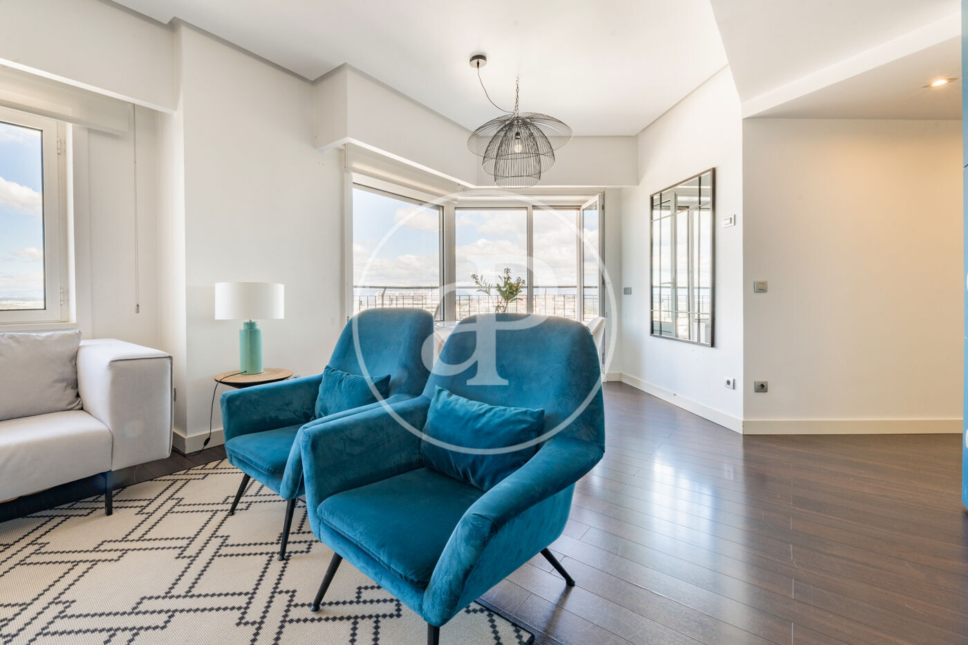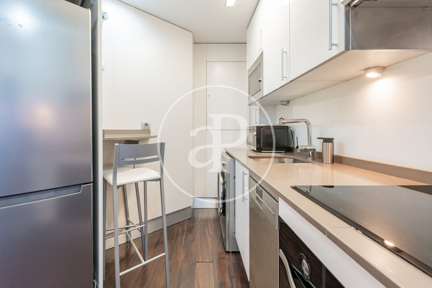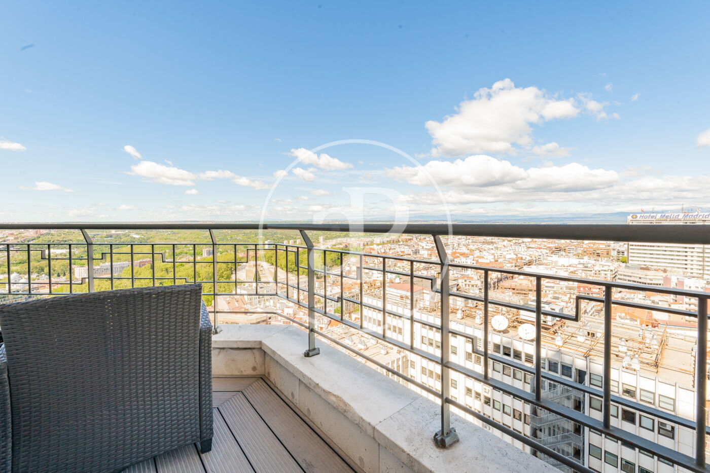 Situado en una planta alta del edifico Torre de Madrid, encontramos este apartamento con vistas despejadas. Desde la entrada accedemos a la zona de día con un espacio de salón-comedor-cocina americana totalmente equipada con todo lo necesario para entrar a vivir. La zona de noche se compone de dos dormitorios de tamaño doble con baño, uno de ellos en suite y mucha capacidad de almacenaje. Se incluye el textil de cama y toallas en el precio de la renta al igual que los suministros. El edificio cuenta con aire acondicionado por conductos y calefacción, así como servicio de conserjería las 24horas y vigilancia.