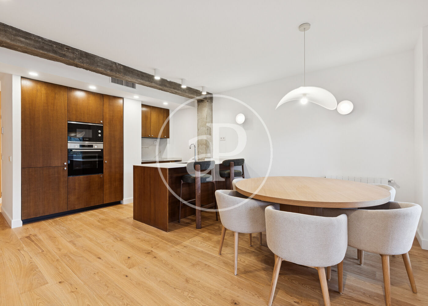 Tiene un salón con la cocina integrada, con unos muebles de roble que lo hacen muy cálido y equipada con electrodomésticos Bosch de alta gama. Tiene una zona de comedor y otra zona de estar con salida a una luminosa terraza y con un gran ventanal.