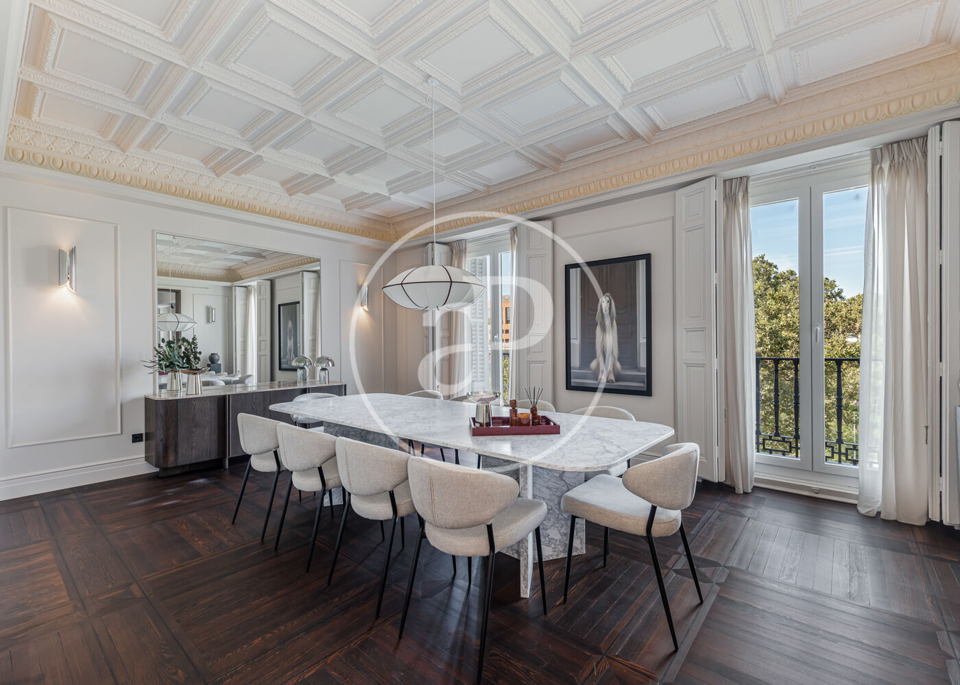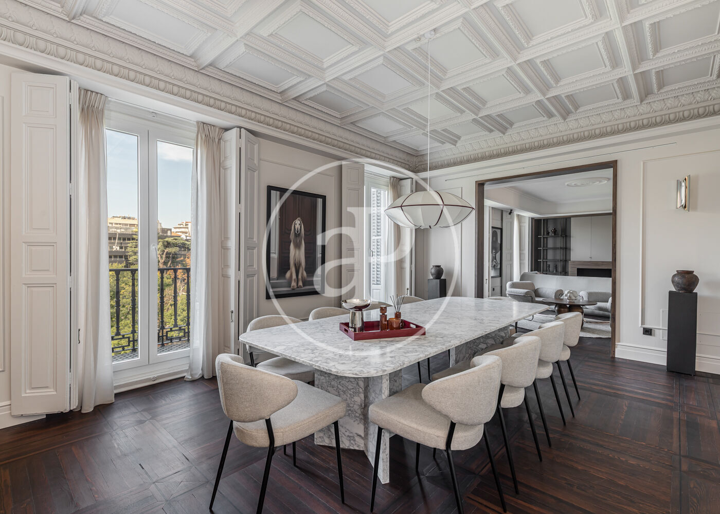 Imponente vivienda en la prestigiosa calle Paseo de la Castellana. a escasos 3 minutos caminando a la famosa Milla de Oro de Madrid, el Corte Inglés de Serrano, etc.. Con 327 m² según catastro, en cuarta planta exterior con techos de más de tres metros de altura y preciosas molduras con unas impresionantes vistas despejadas del skyline Madrileño.