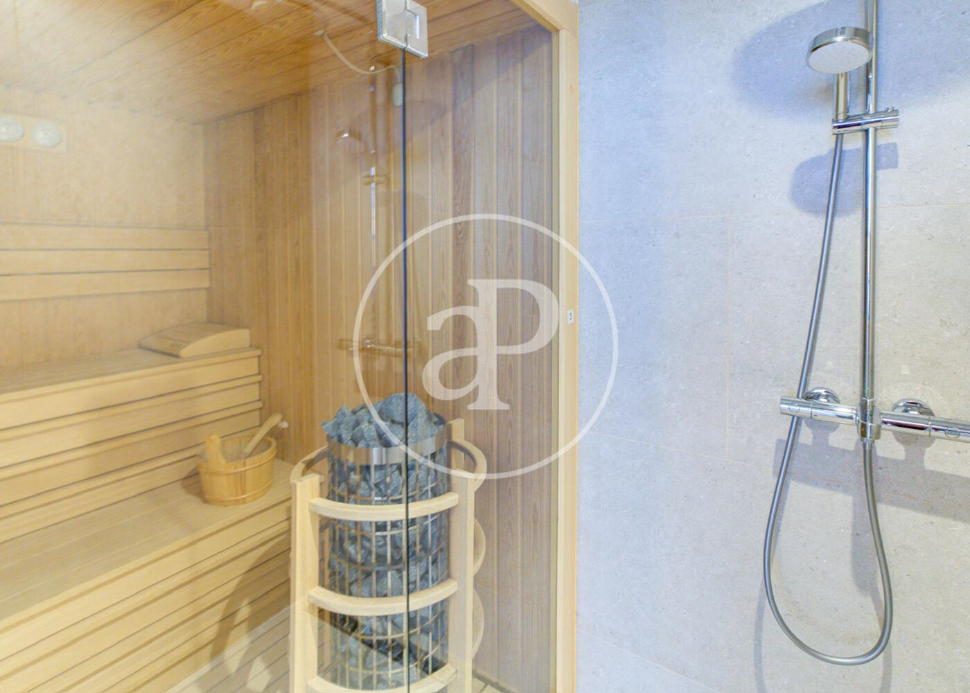 La propiedad está distribuida en un gran salón comedor que comunica con una amplia cocina, moderna, con isla y equipada con electrodomésticos de la más alta gama. La zona social cuenta además con un aseo de cortesía y una zona de lavandería. Desde el salón se accede a una magnífica terraza de 55 metros delimitada por ambos lados por dos torreones que forman parte del inmueble. En la zona de noche encontramos 2 dormitorios en suite y una master suite con vestidor y espacios amplísimos. En el lado opuesto al salón, debajo de uno de los torreones, está la habitación de invitados, que dispone de su propio baño.