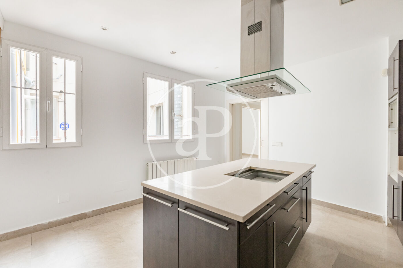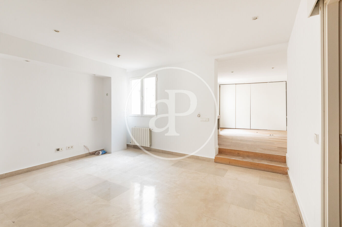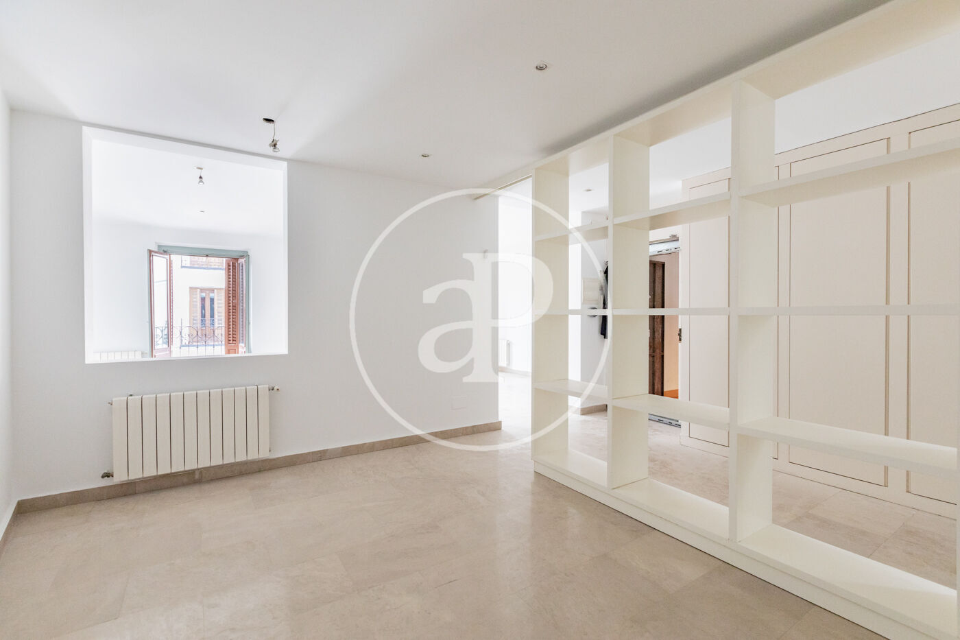 En la actualidad se accede a la vivienda a través de un precioso Hall recibidor que da paso a la zona de recibo, un amplio salón flanqueado por amplios balcones desde los que se disfrutan de unas preciosas vistas a edificios clásicos y al cielo de Madrid, un espacio comedor y una cocina independiente