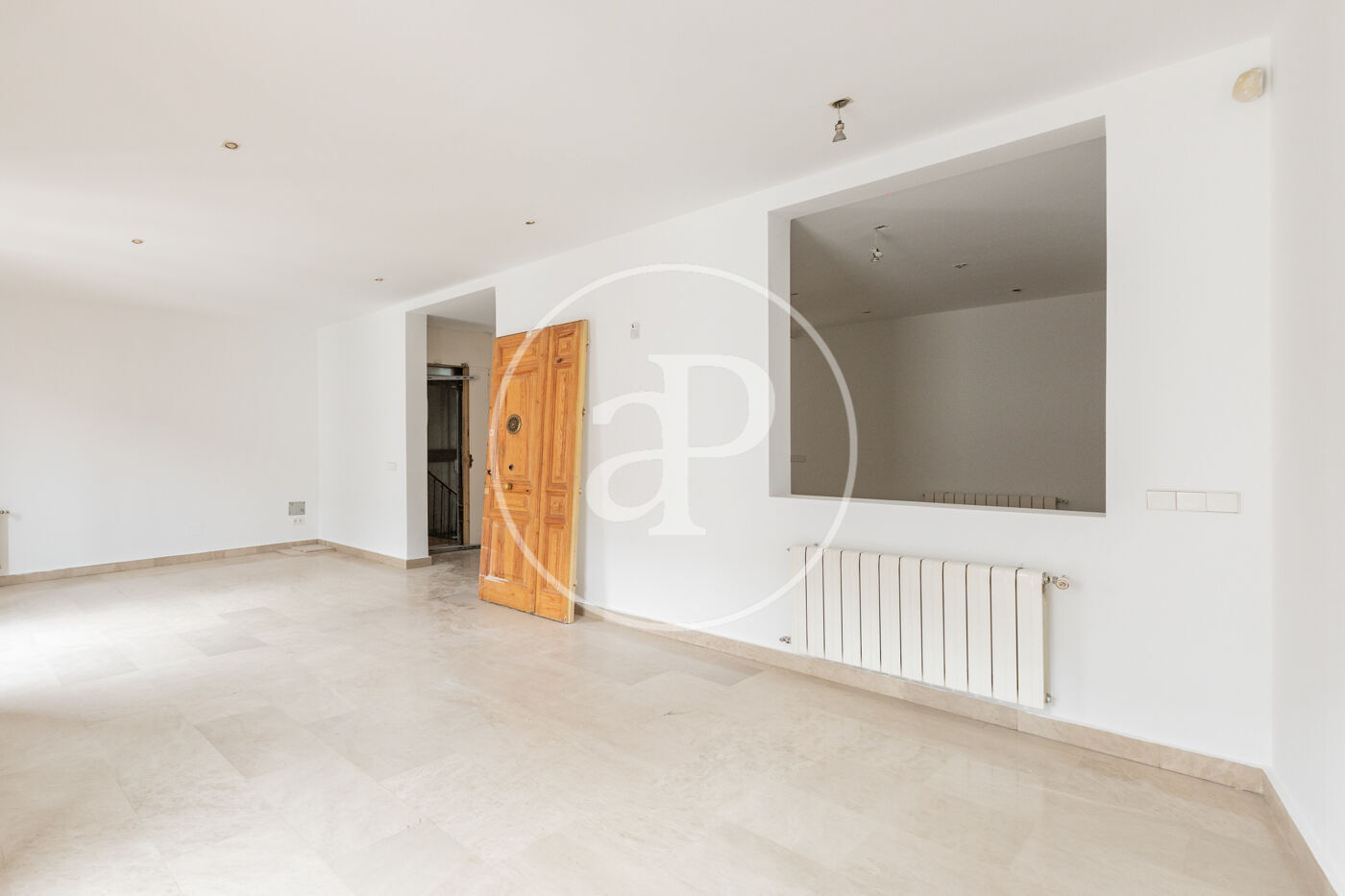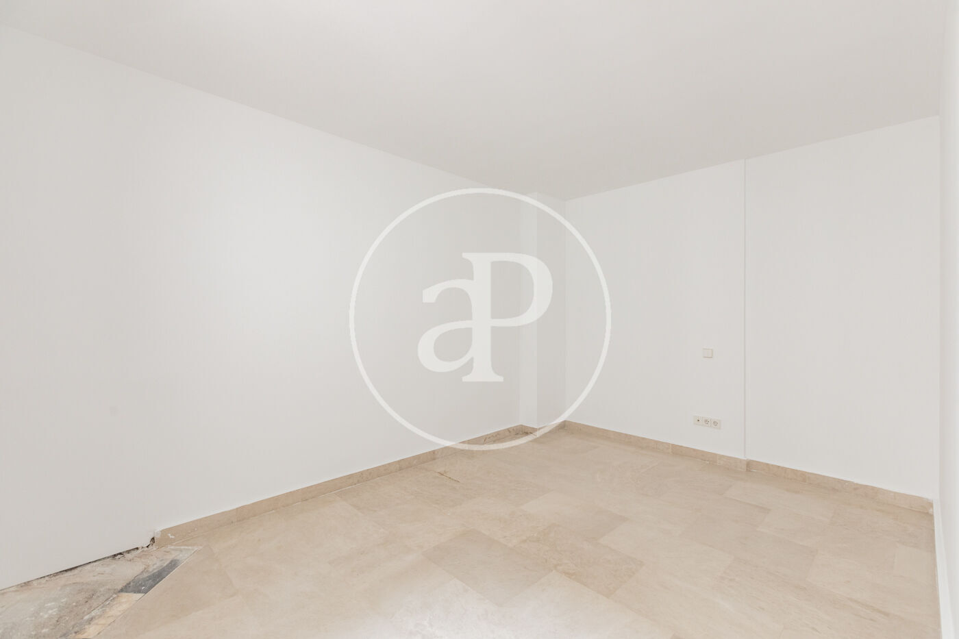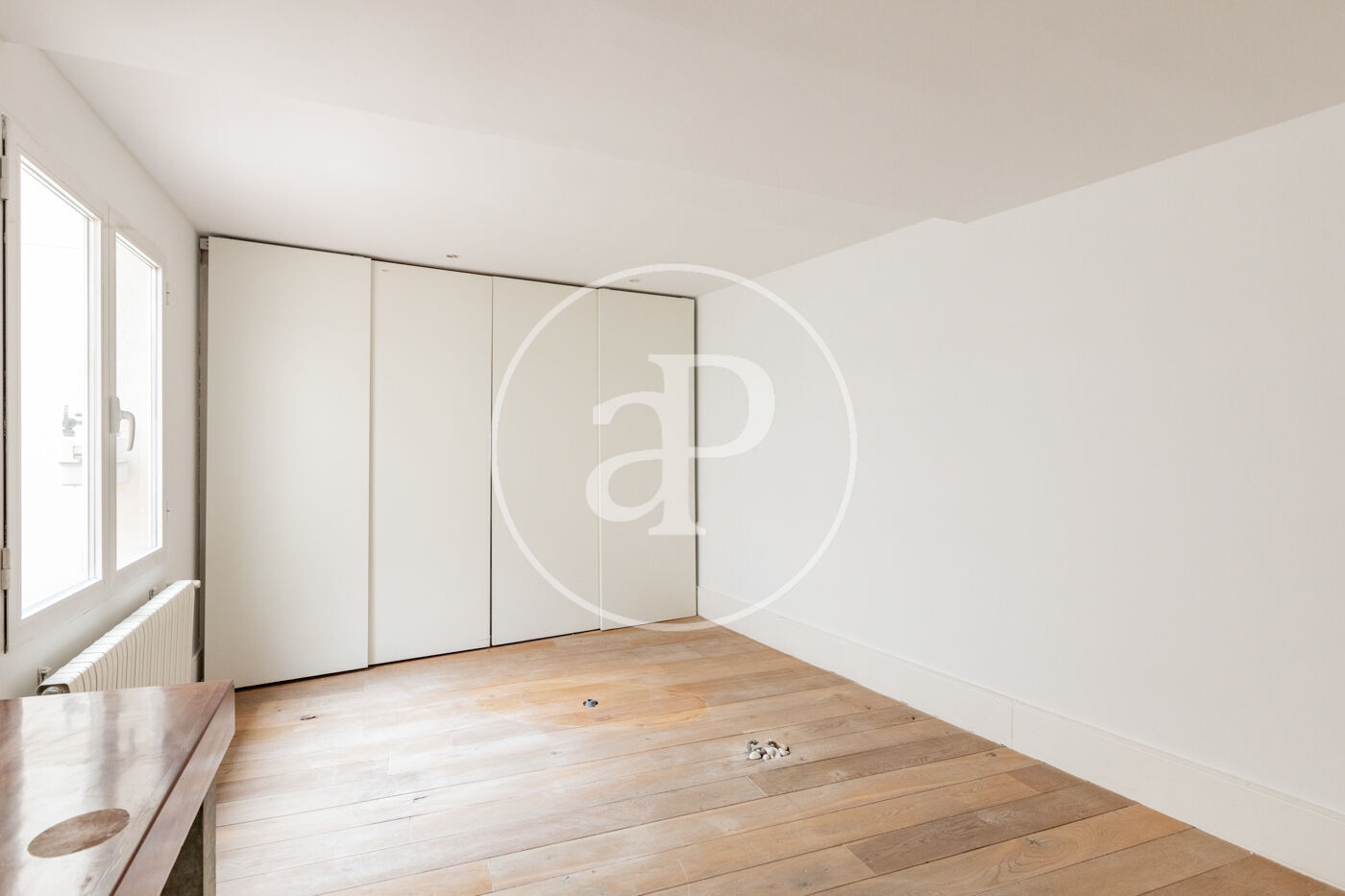 En la actualidad se accede a la vivienda a través de un precioso Hall recibidor que da paso a la zona de recibo, un amplio salón flanqueado por amplios balcones desde los que se disfrutan de unas preciosas vistas a edificios clásicos y al cielo de Madrid, un espacio comedor y una cocina independiente