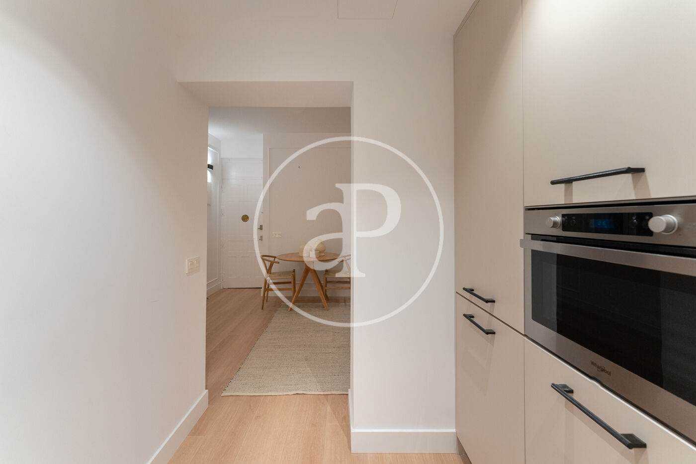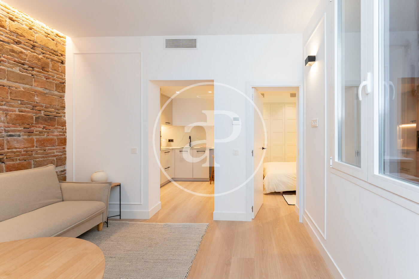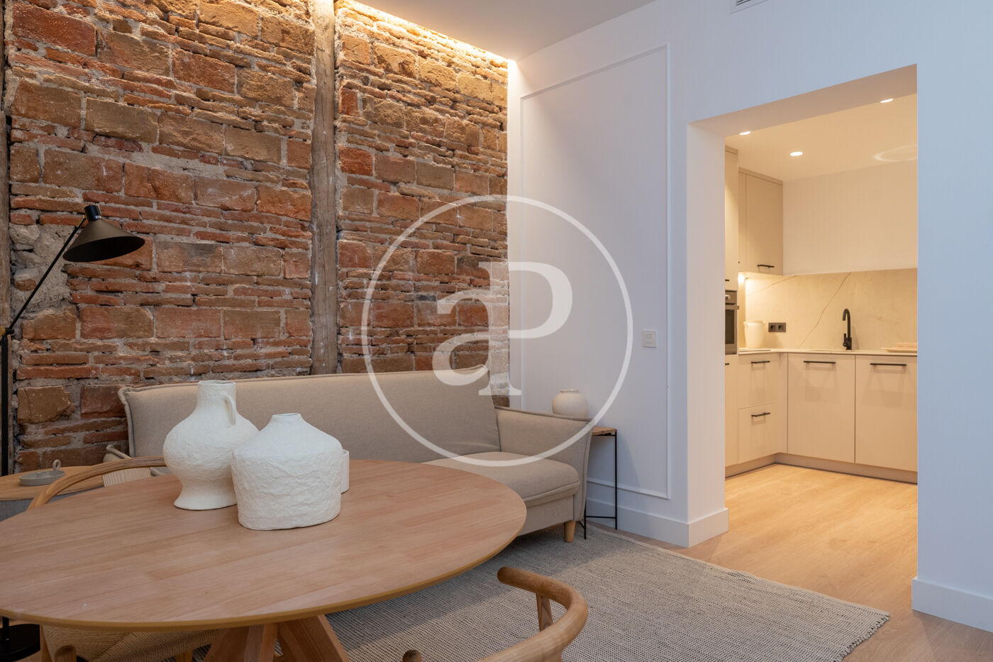 Se accede a través de un bonito salón-comedor, con una pared de ladrillo visto original bañado por un led continuo, haciendo un haciendo muy acogedor, a continuación, encontramos una cocina totalmente equipada y una habitación doble con baño en suite.