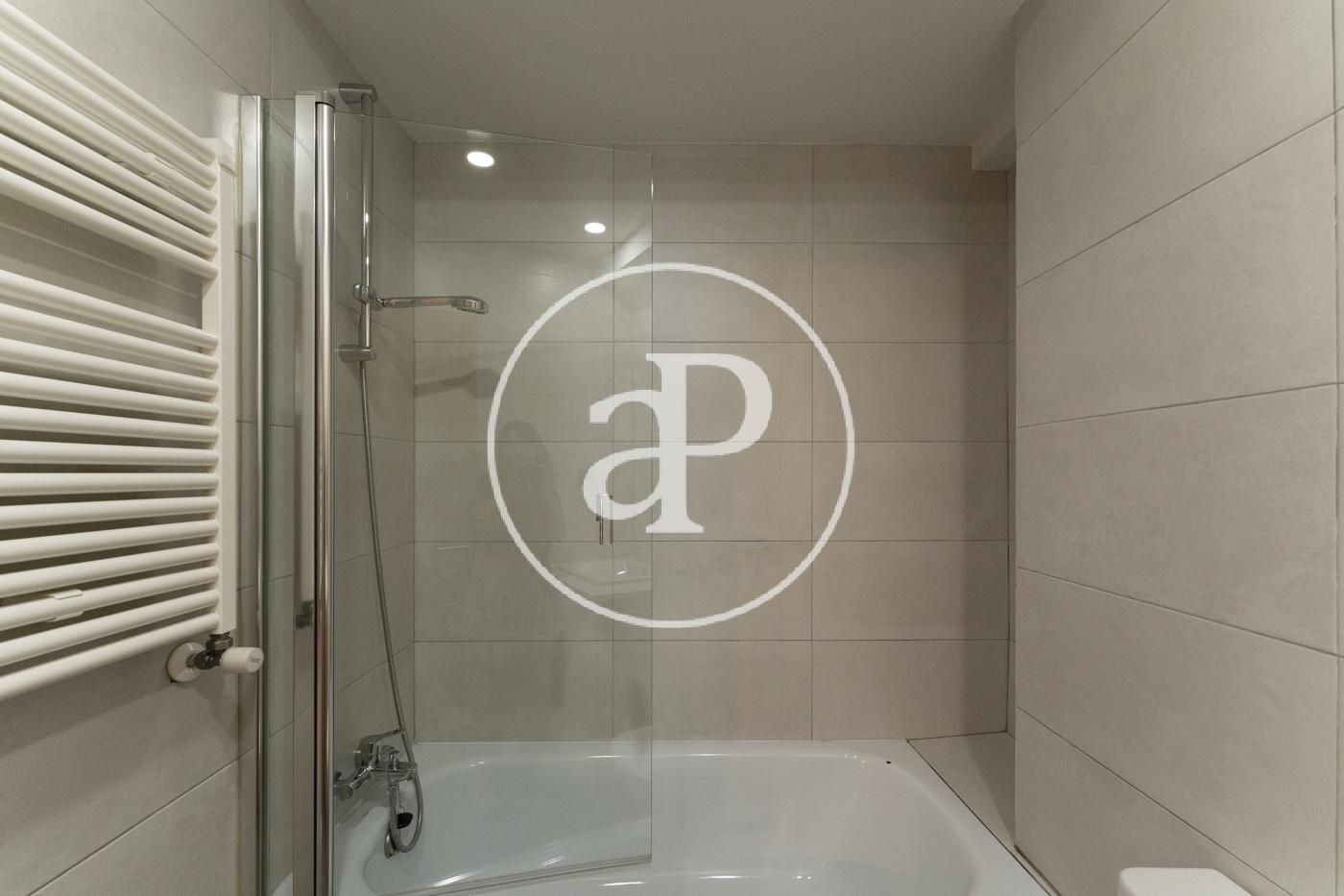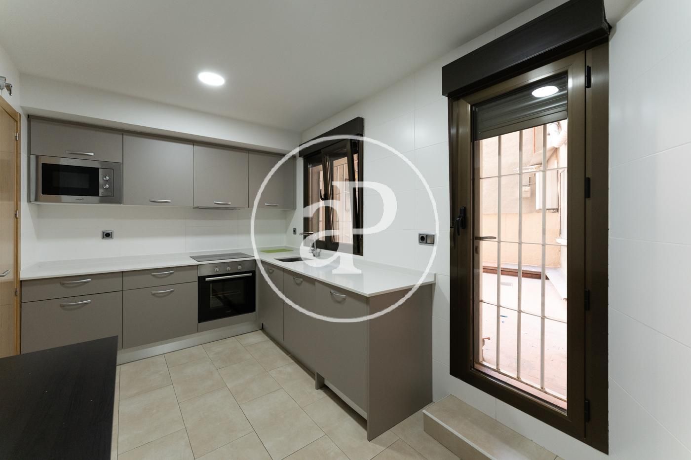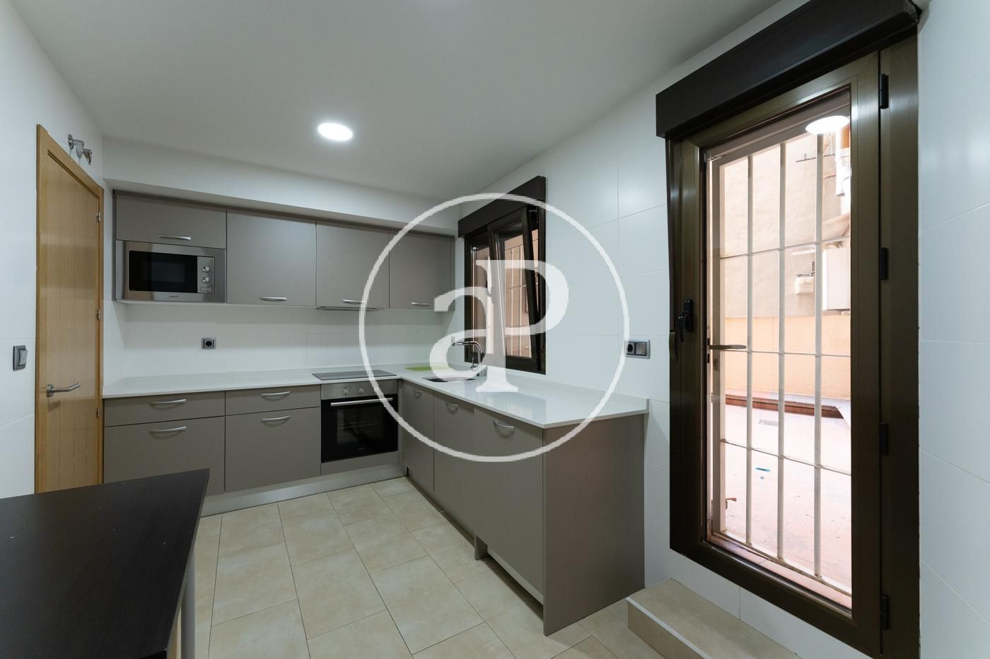 Esta fantástica vivienda con una reforma a estrenar tiene 120 m². Al entrar encontramos un gran armario en el hall y a la derecha se da paso a la cocina totalmente amueblada con gran capacidad de almacenaje, equipada con todos los electrodomésticos de alta gama y zona de comedor, por ella se accede a un amplio patio de uso privativo de aproximadamente 50 m². Las tres habitaciones, situadas a lo largo del pasillo son muy amplias y luminosas y cuentan todas con armarios empotrados, la principal con cuarto de baño en suite. Las otras dos habitaciones que dan al patio comparten el baño secundario que está en el pasillo.El salón, al final de la vivienda, es grande y luminoso con dos orientaciones y ambientes diferenciados. Tiene una agradable terraza que da a la calle principal y un ventanal que da al patio. La calefacción es individual de gas natural y tiene aire acondicionado por conductos. El suelo es de madera y los cierres de alta calidad. La finca tiene acceso con rampa para uso de personas con movilidad reducida y hay posibilidad de plaza de garaje. Disponibilidad inmediata para larga estancia.