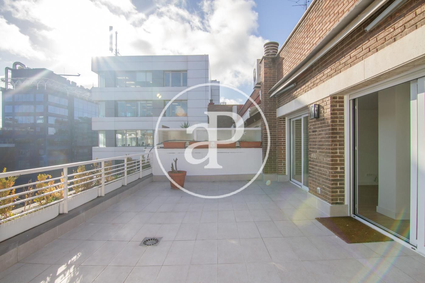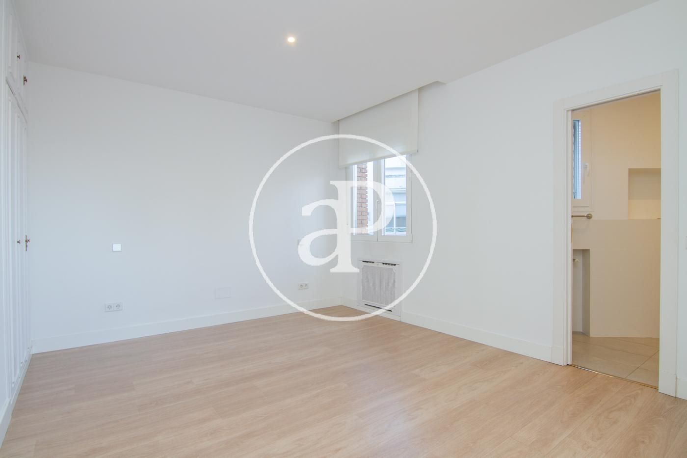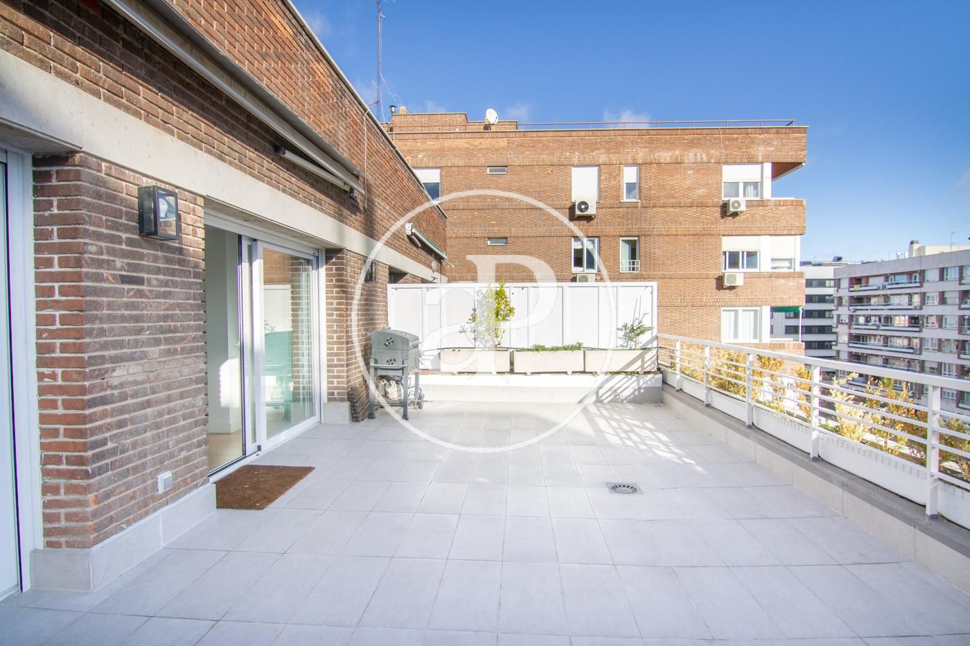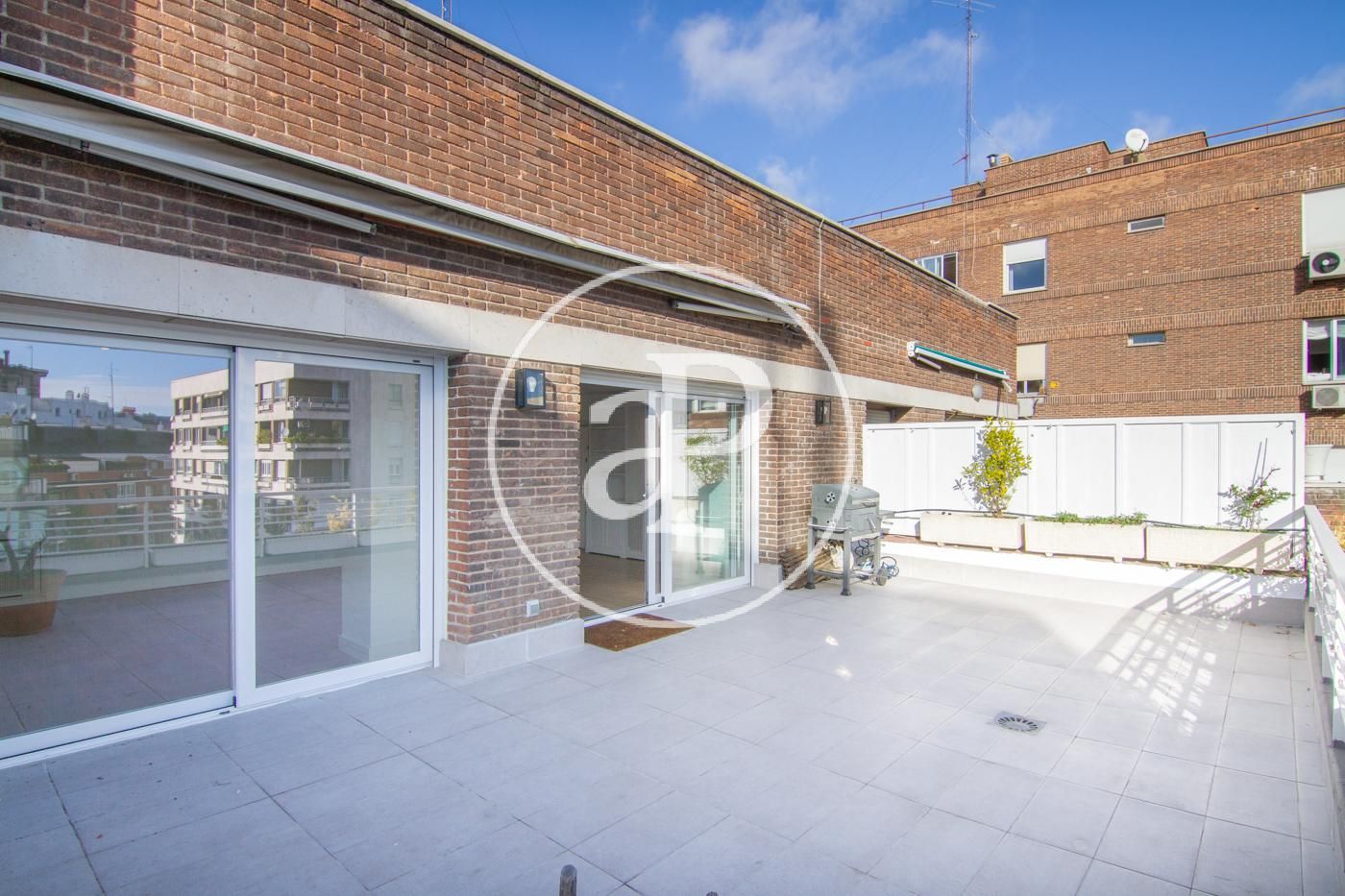 Exclusivo ático en alquiler de 158 m2, reformado, en finca señorial con portero físico y ascensor en El Viso. Desde la entrada accedemos a un enorme salón comedor, con muchísima luz, gracias a la gran terraza que hay. Encontramos la cocina a la entrada del pasillo, completamente equipada con todos los electrodomésticos de alta gama. A continuación, en la zona de noche, hay dos habitaciones con armarios empotrados y dos baños completos. Al fondo de la vivienda está la habitación principal, de gran tamaño, con armarios empotrados y baño en suite. La casa tiene calefacción central incluida en el precio y plaza de garaje en la misma finca, también incluida. Ubicado en una de las mejores zonas de El Viso, encontramos gran variedad de comercios, restaurantes, colegios y todo tipo de transportes. A 5 minutos andando del Auditorio Nacional.